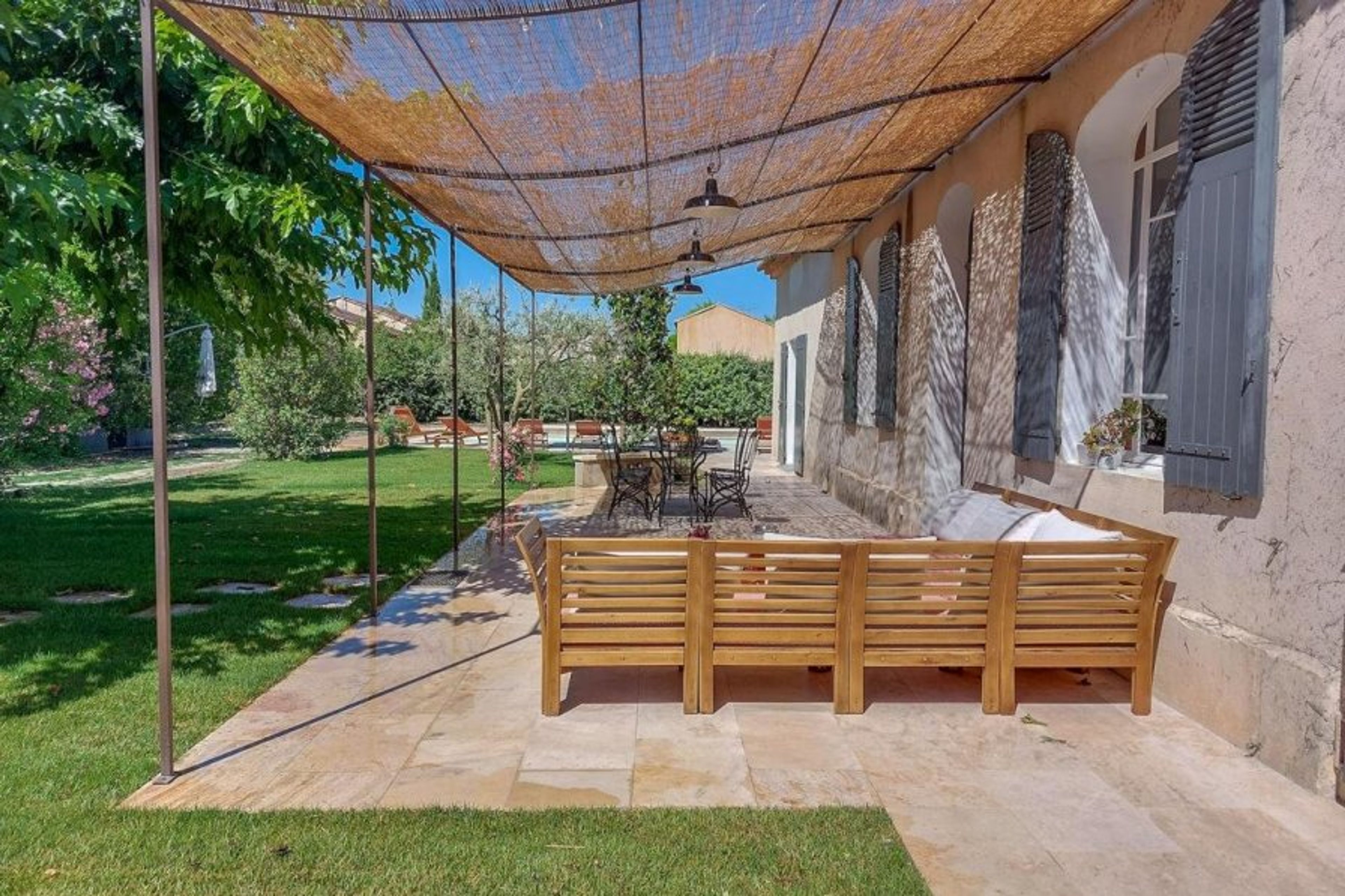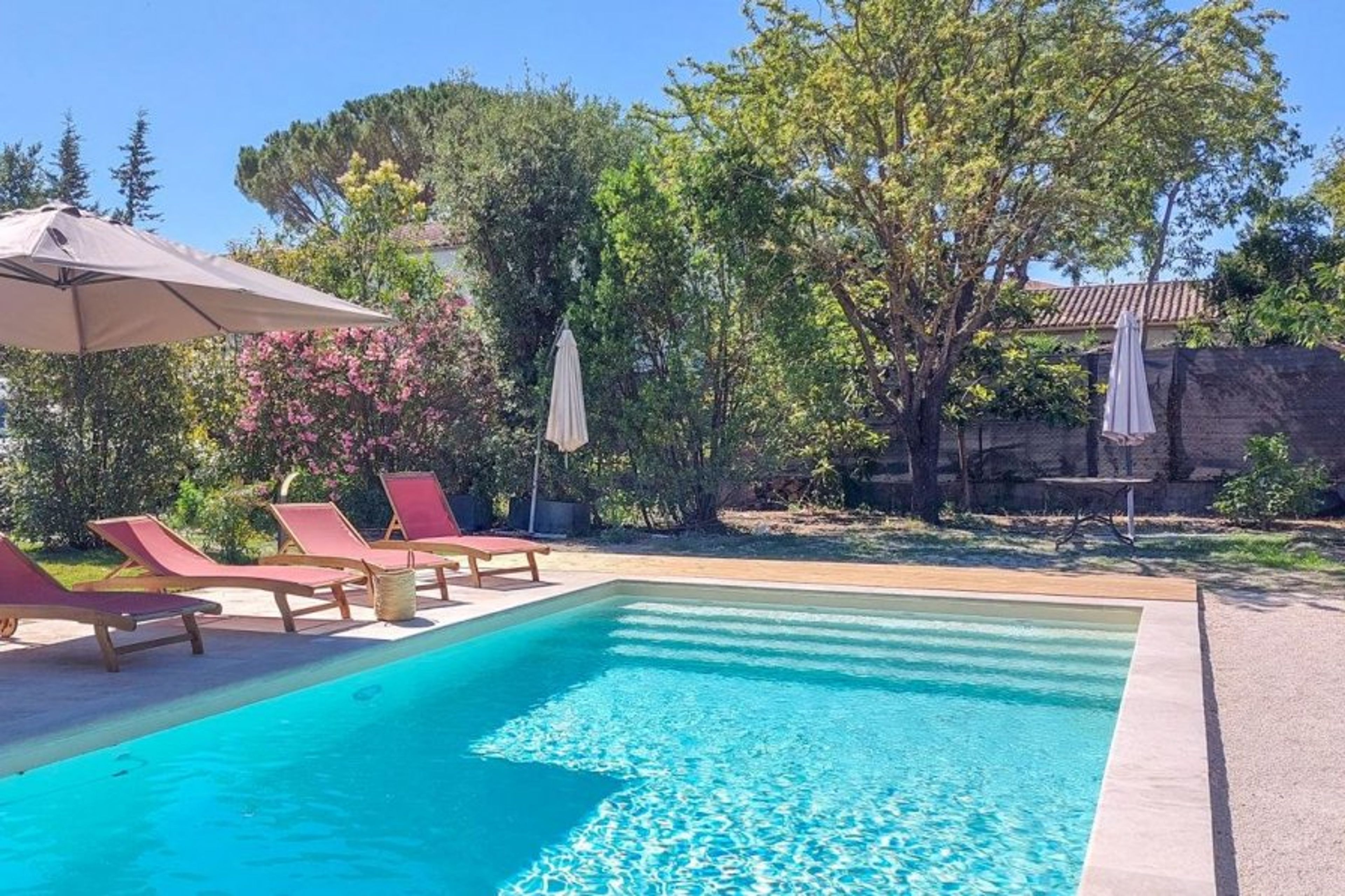 You may look out over the lovely fenced garden with its private pool, mature Mediterranean trees, and vibrant bushes from here.