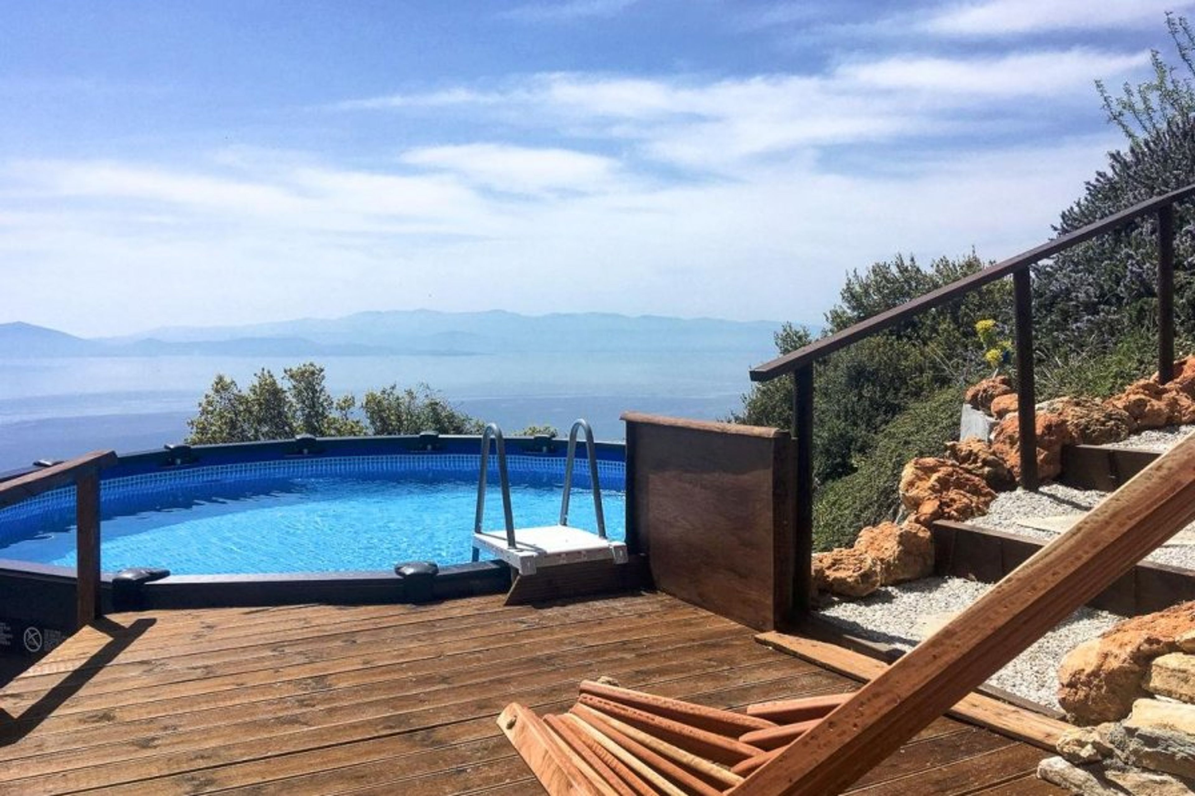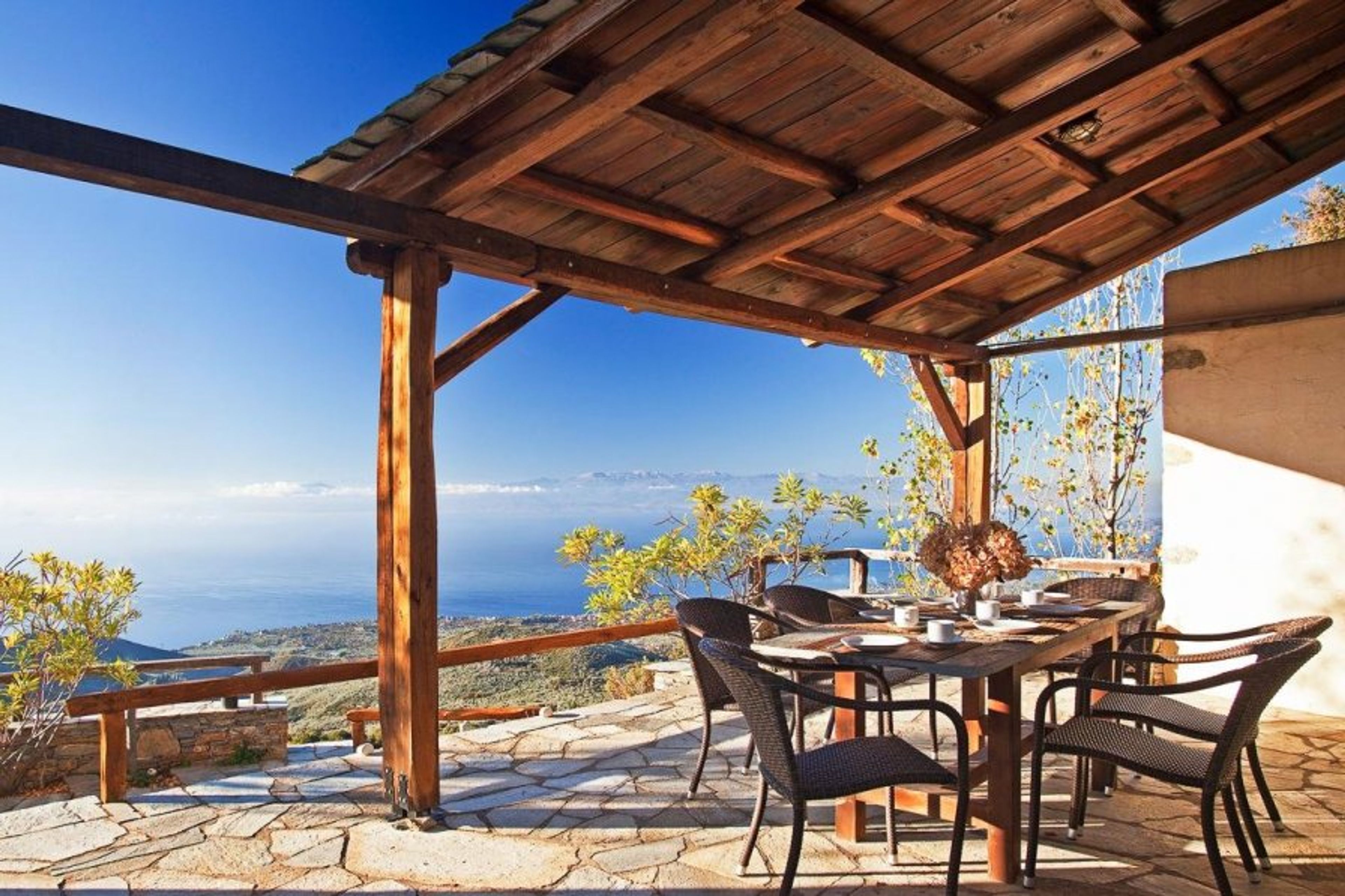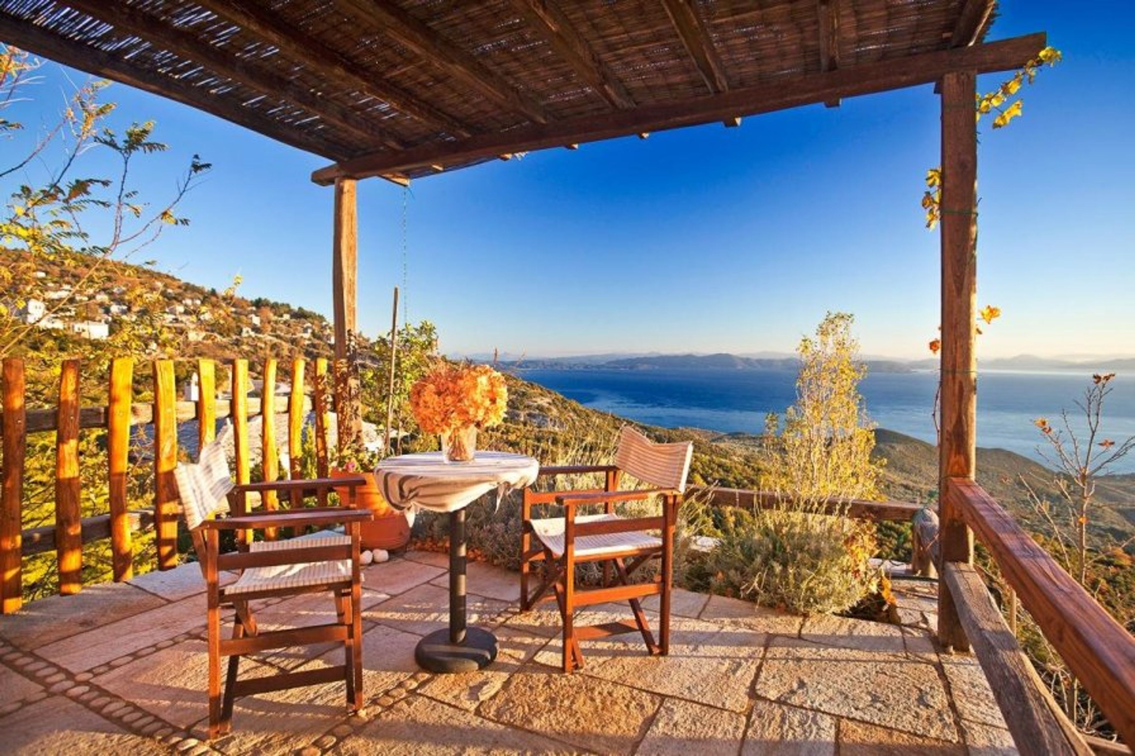 The multi-leveled outdoor area of the villa offers expansive panoramic views of Pagasitikos Bay.