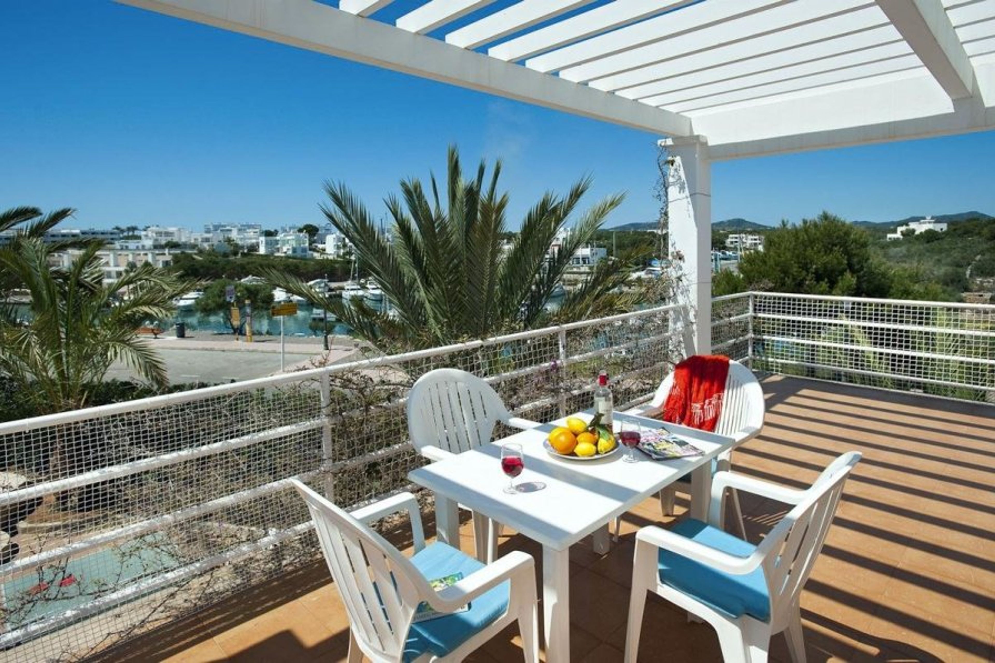 The living room has a pair of modern black sofas with stunning views of the nearby Cala d'Or Marina. A sizable flatscreen TV is also utilized in this room, making it an ideal setting for those cherished family movie nights.