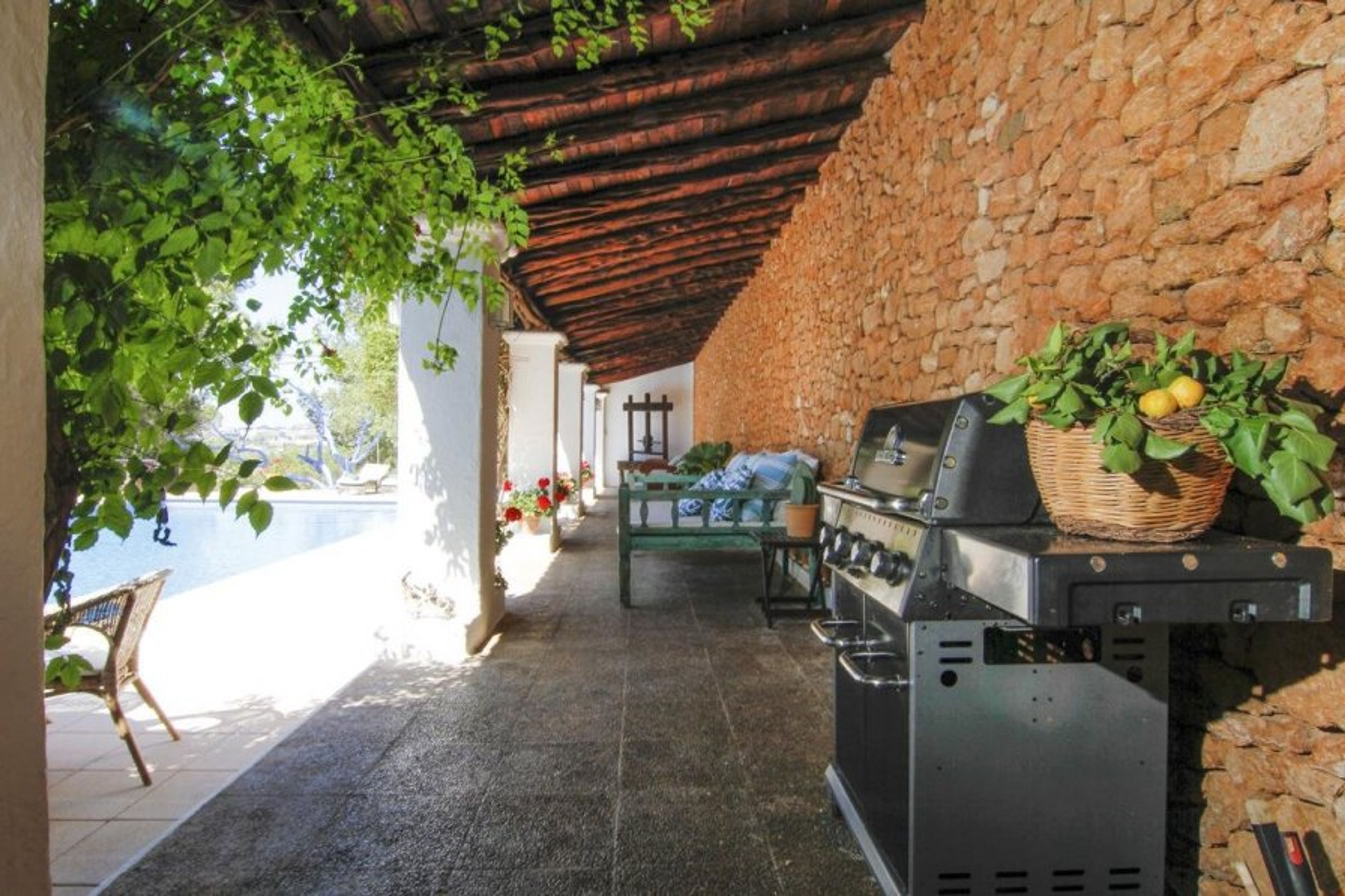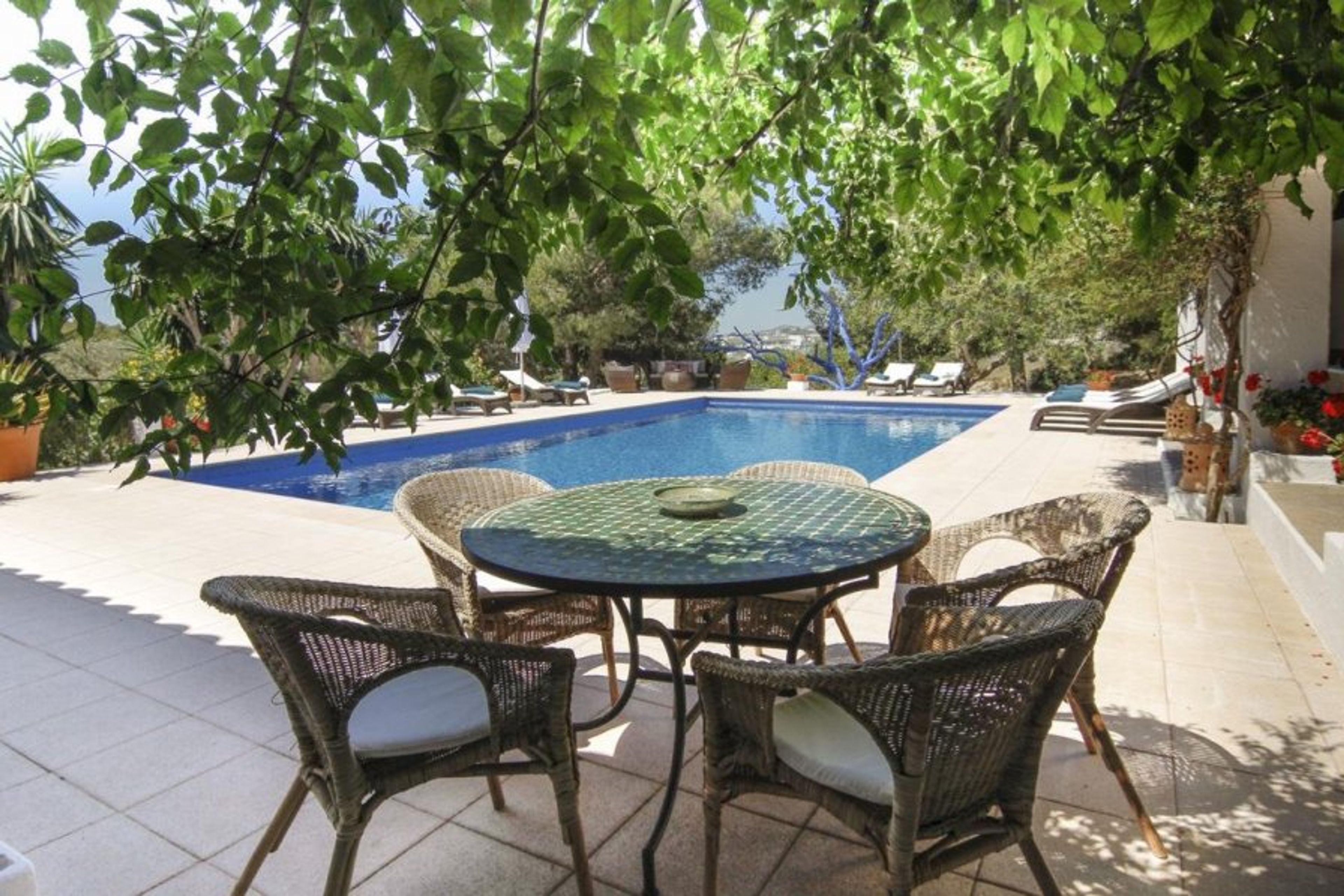As you exit at the rear there is a covered terrace with outdoor dining furniture and seating areas. Perfect for you if you enjoy a BBQ since the villa also has a barbeque for your use. In addition, there is a large private swimming pool, surrounded by sun loungers as well as some seating areas and shade.