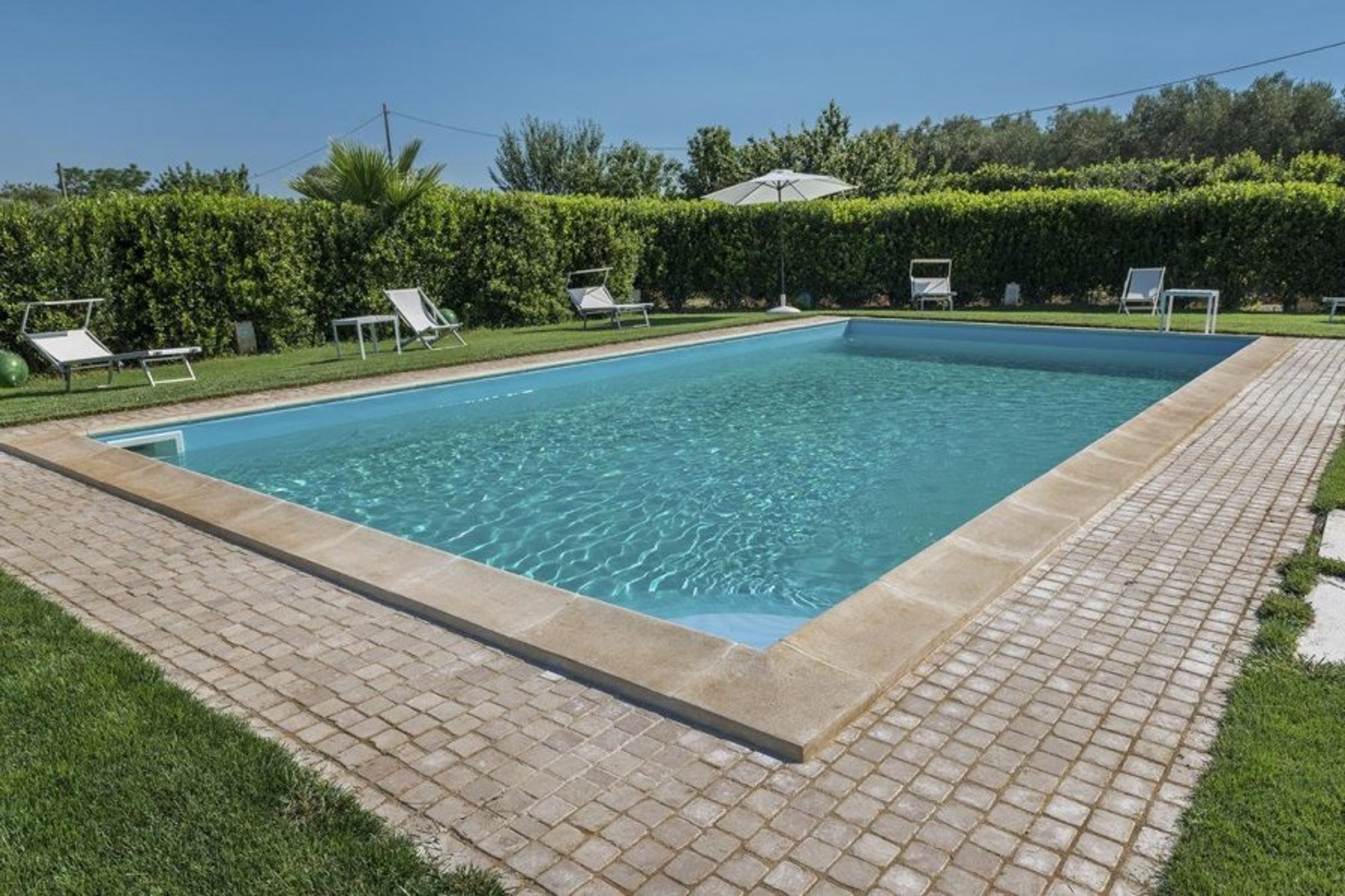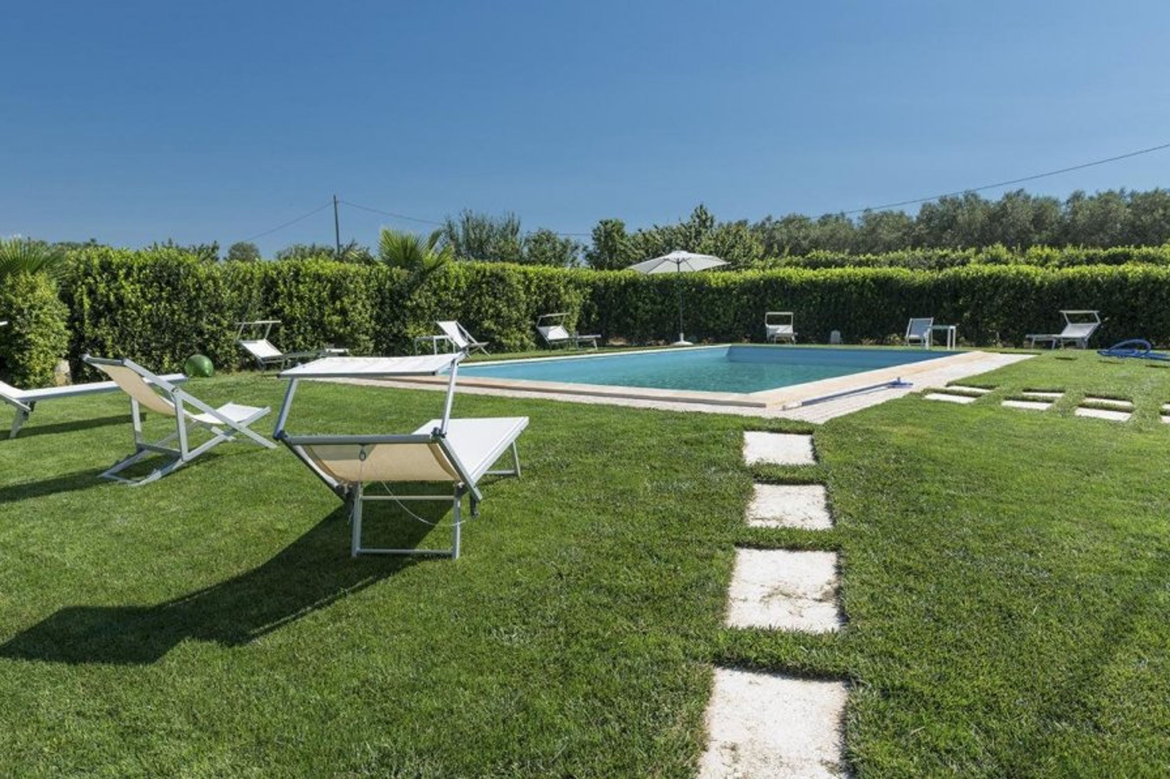 Wander the tiled path to the pool and relax on the sun loungers in the lovely garden.