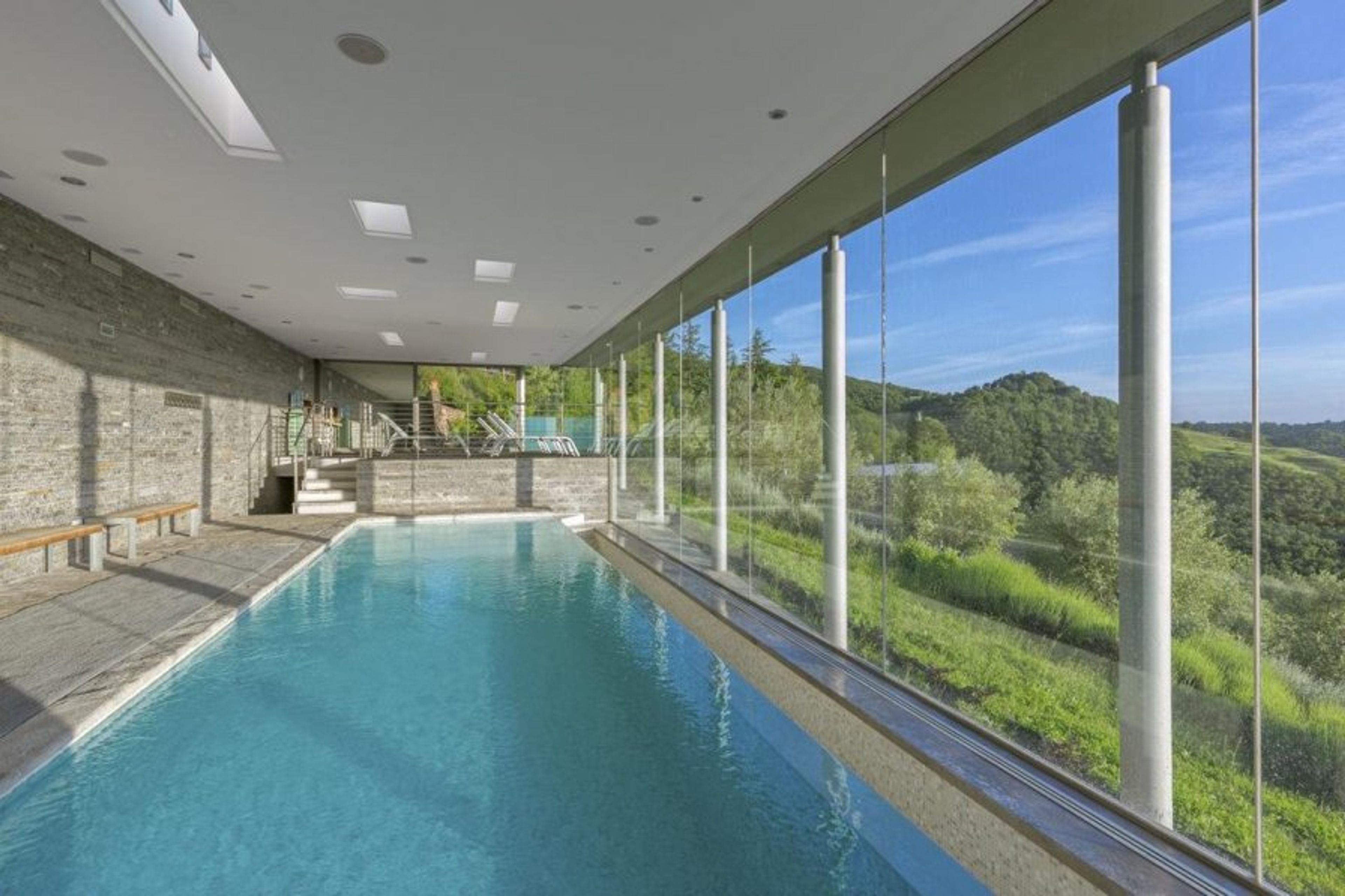 There is a heated indoor pool with hydromassage and a Turkish bath, and a beautiful blue pool outside with sun loungers scattered around it.