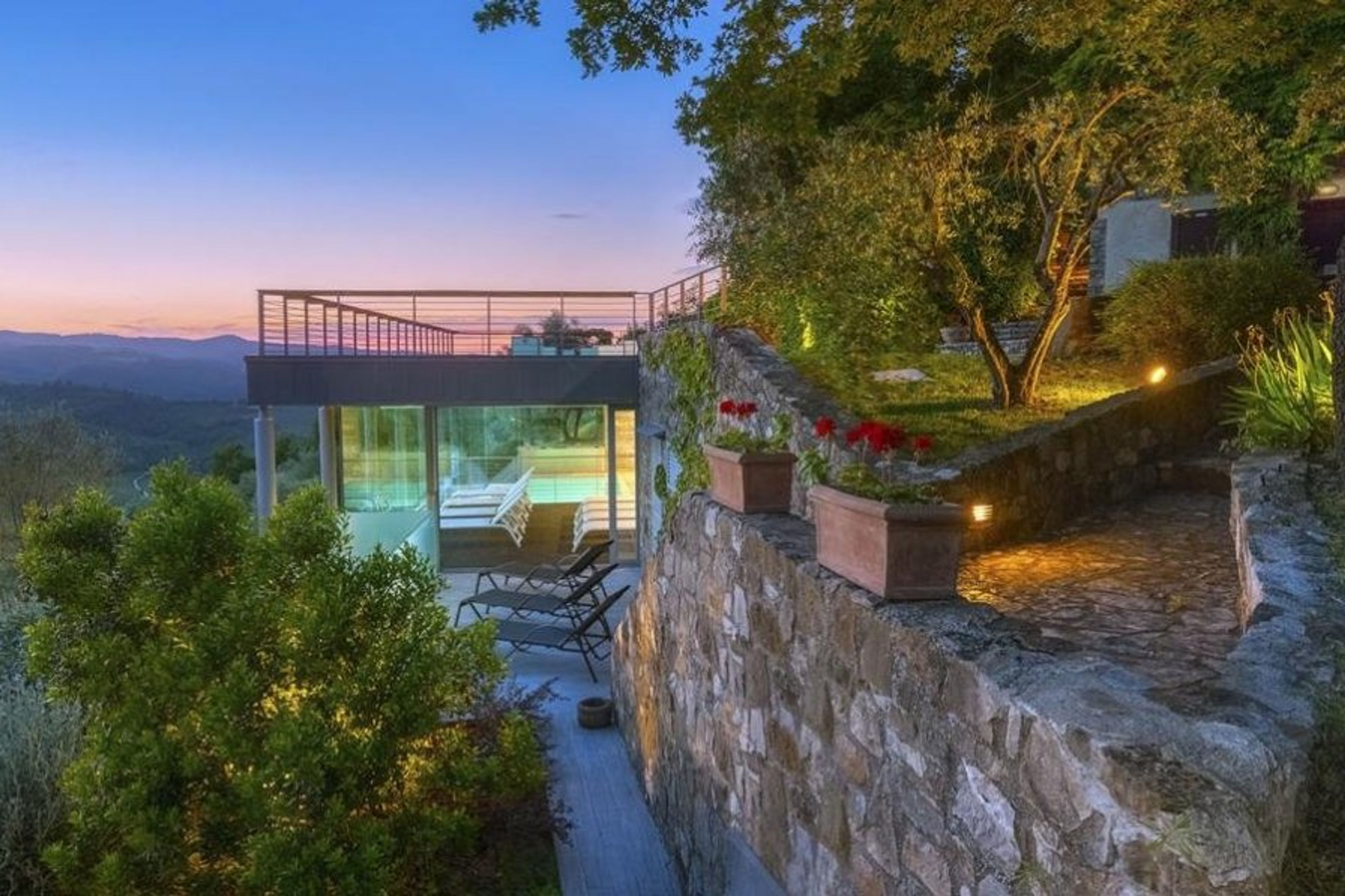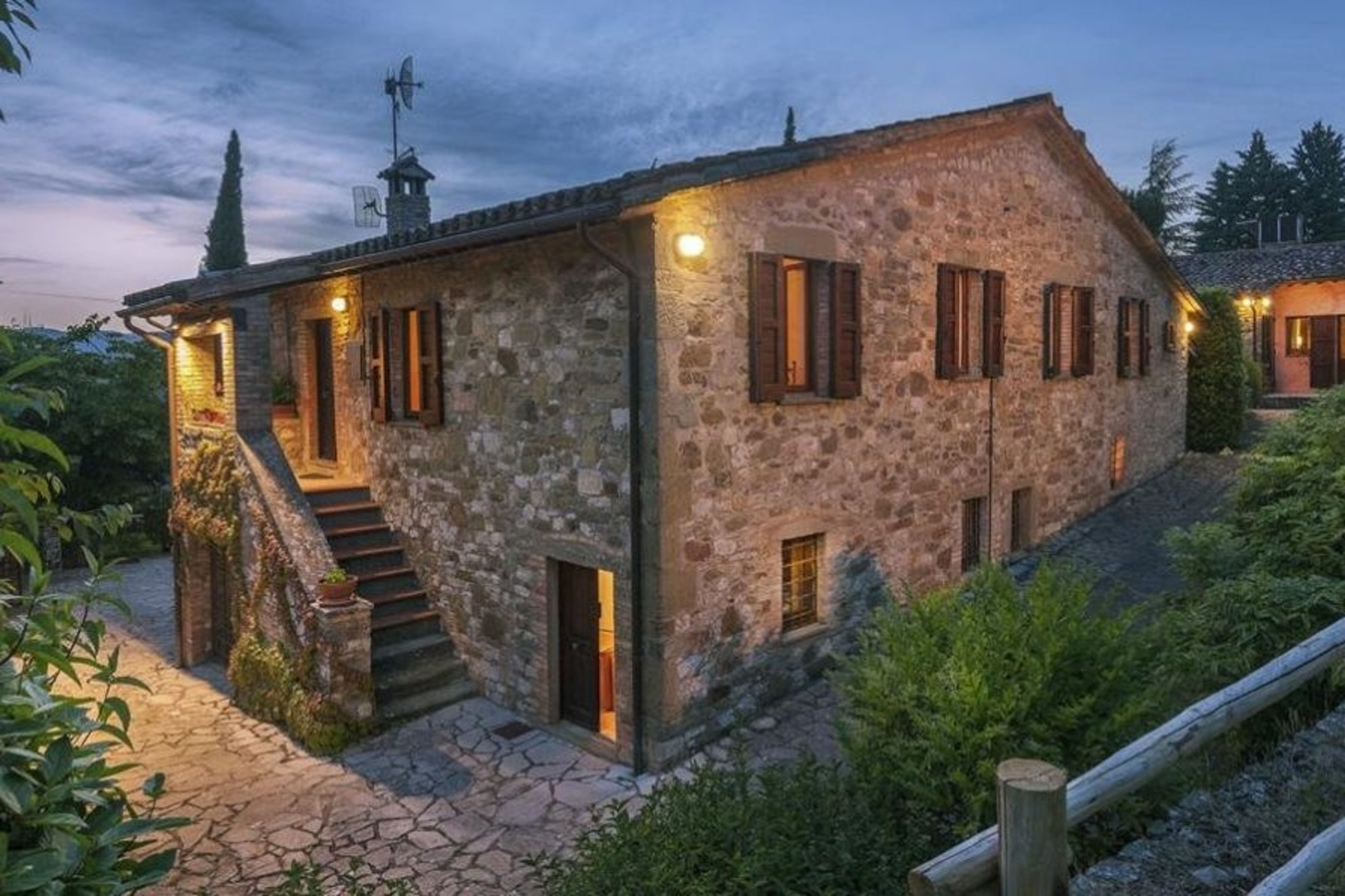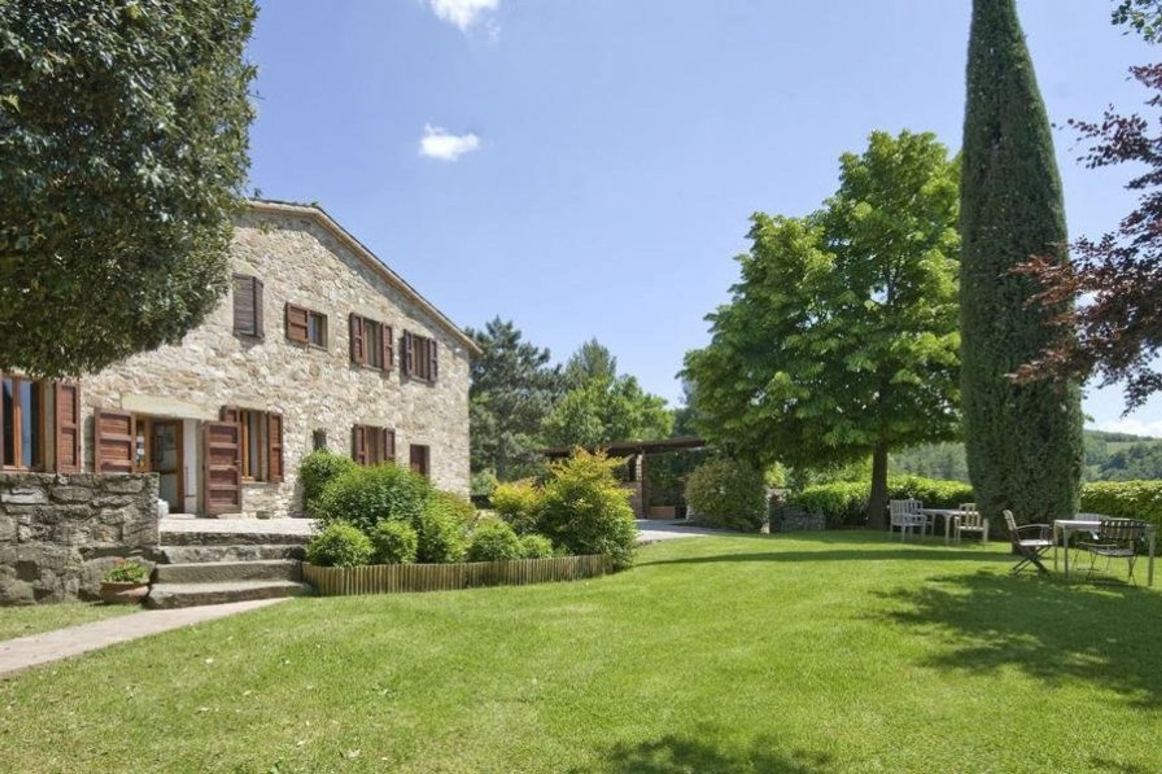 The villa is surrounded by vegetation and is situated at the end of a cypress tree-lined road that connects to what the owners call the "courtyard" of the Umbrian hills.