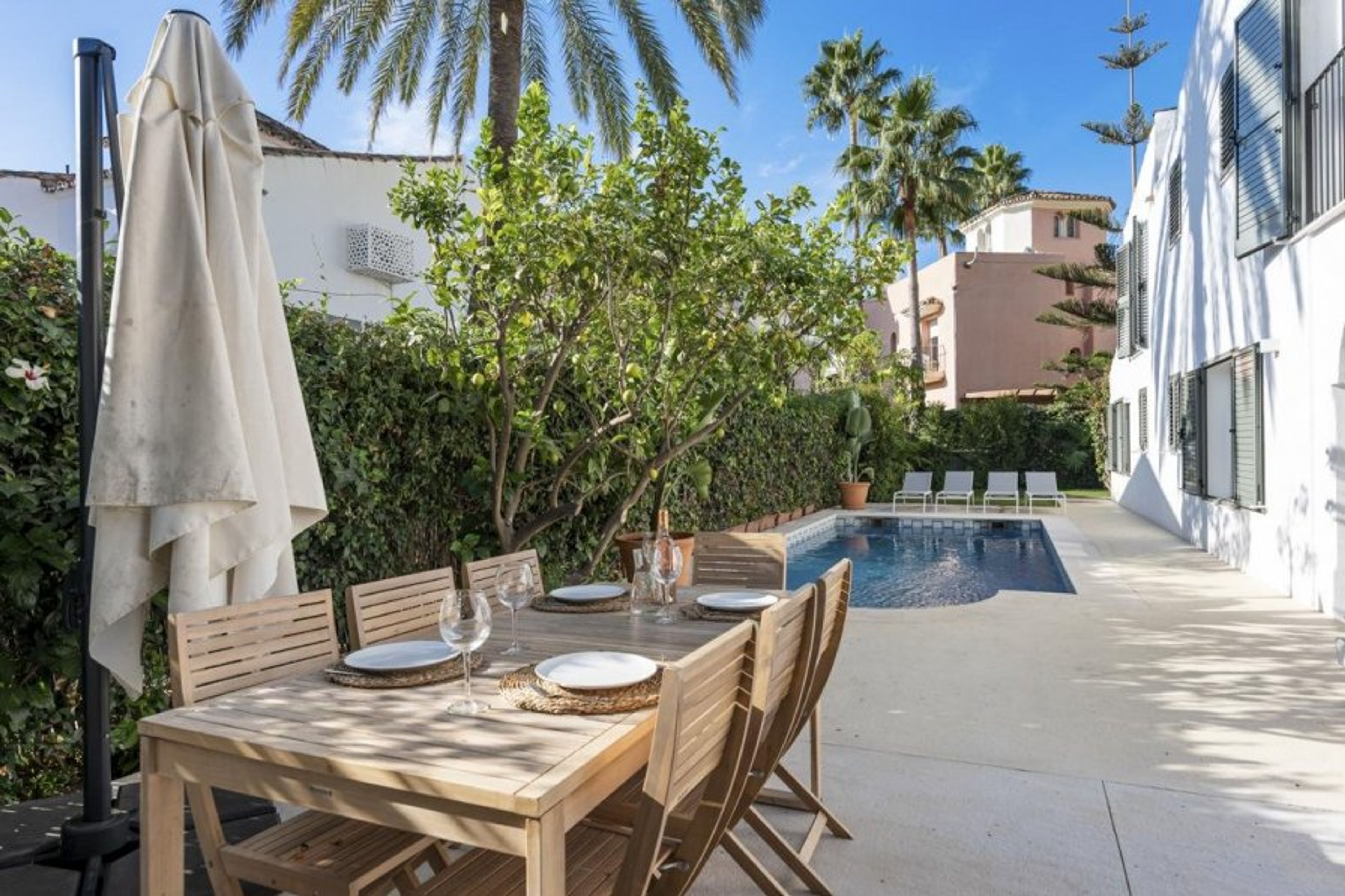The outside terrace and emerald green grass next to the pool have everything visitors may possibly need for a thorough rest and recharge.