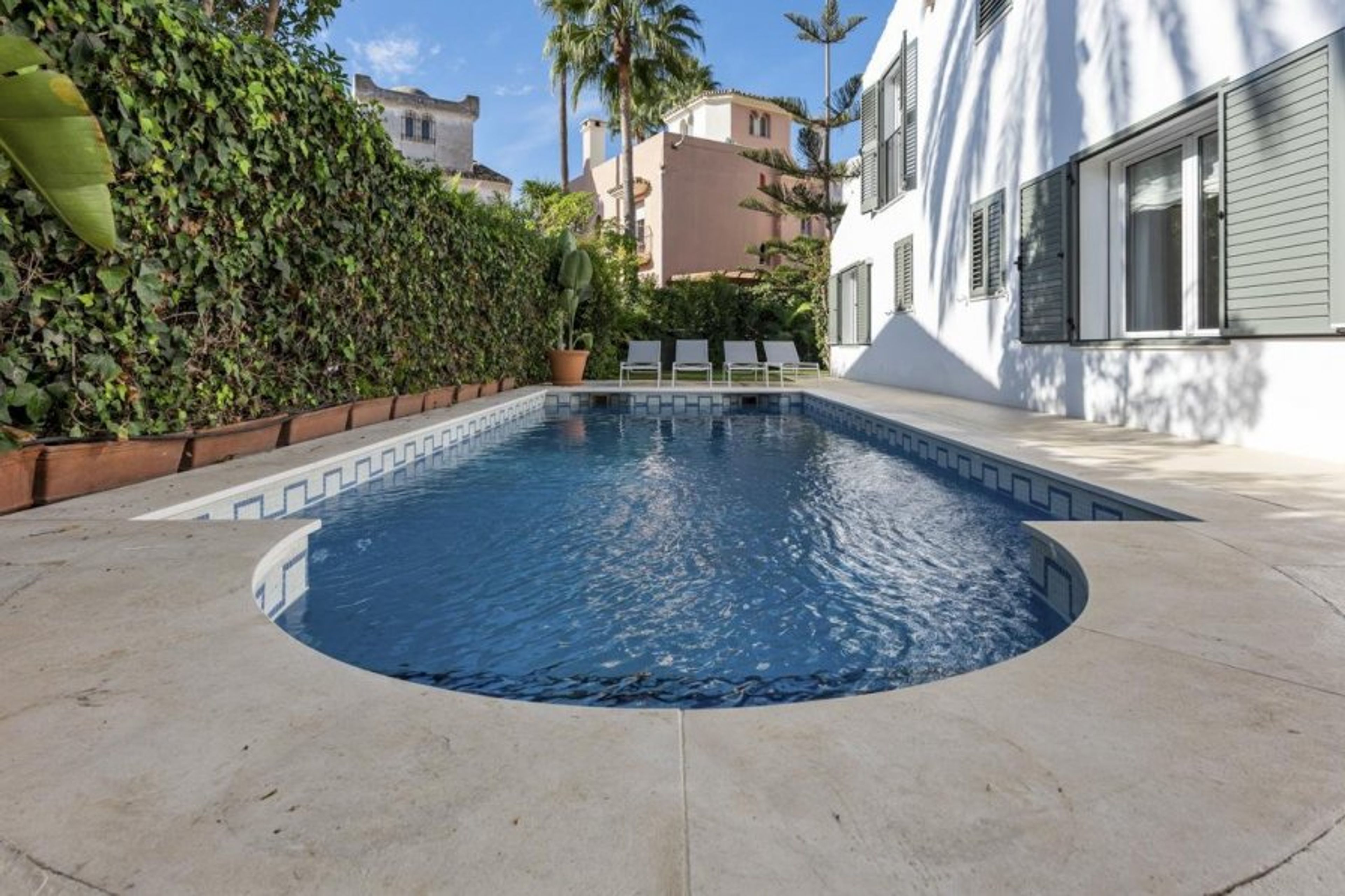 This home's exterior is a tranquil, private sanctuary with a serene pool in the middle of the outside area.