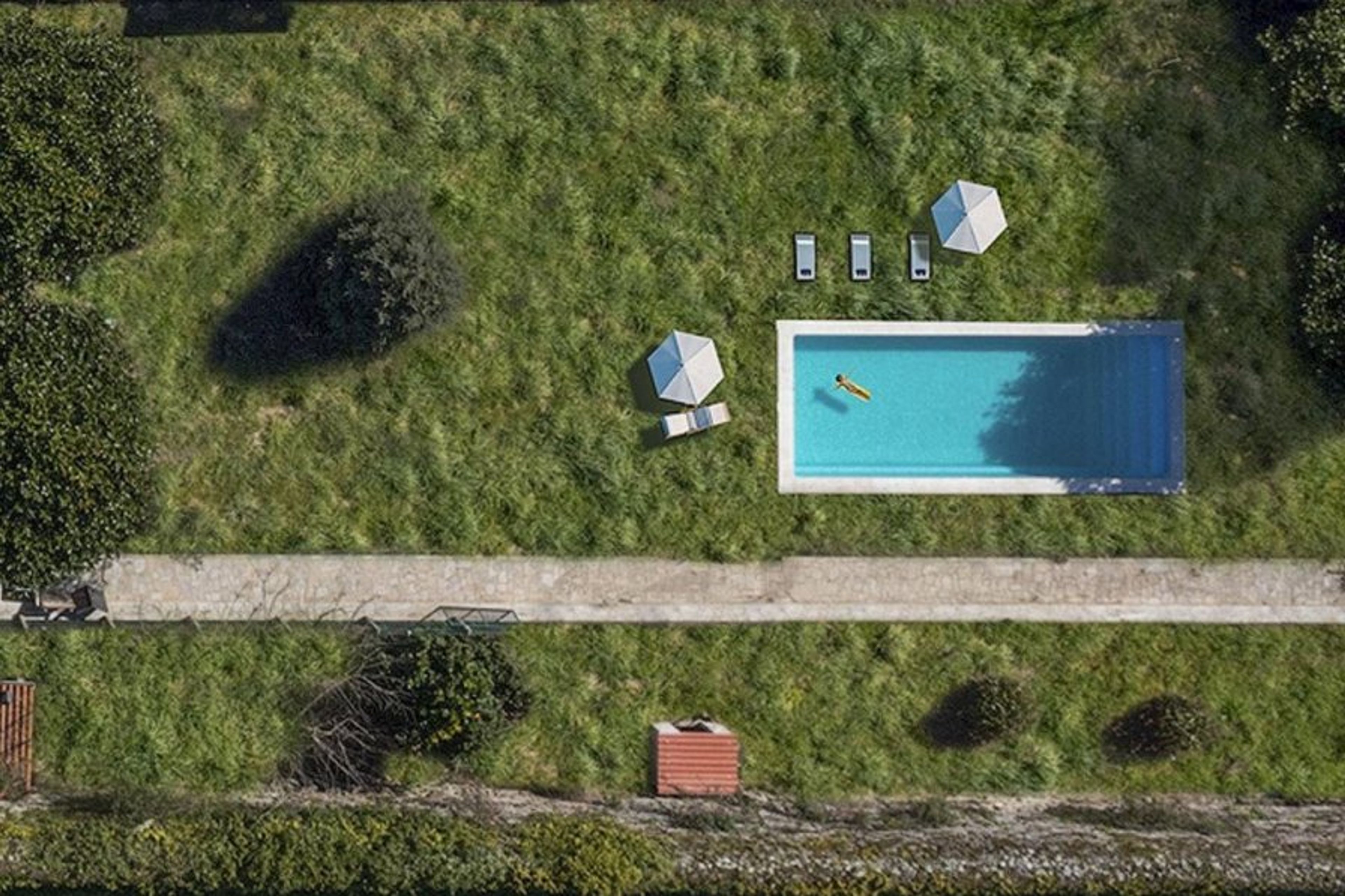 This building's facade skillfully combines a large garden space with a distinctive swimming pool. In turn, visitors have a choice of lounging on the immaculate grass or taking a leisurely plunge in the spectacular pool whenever they please.