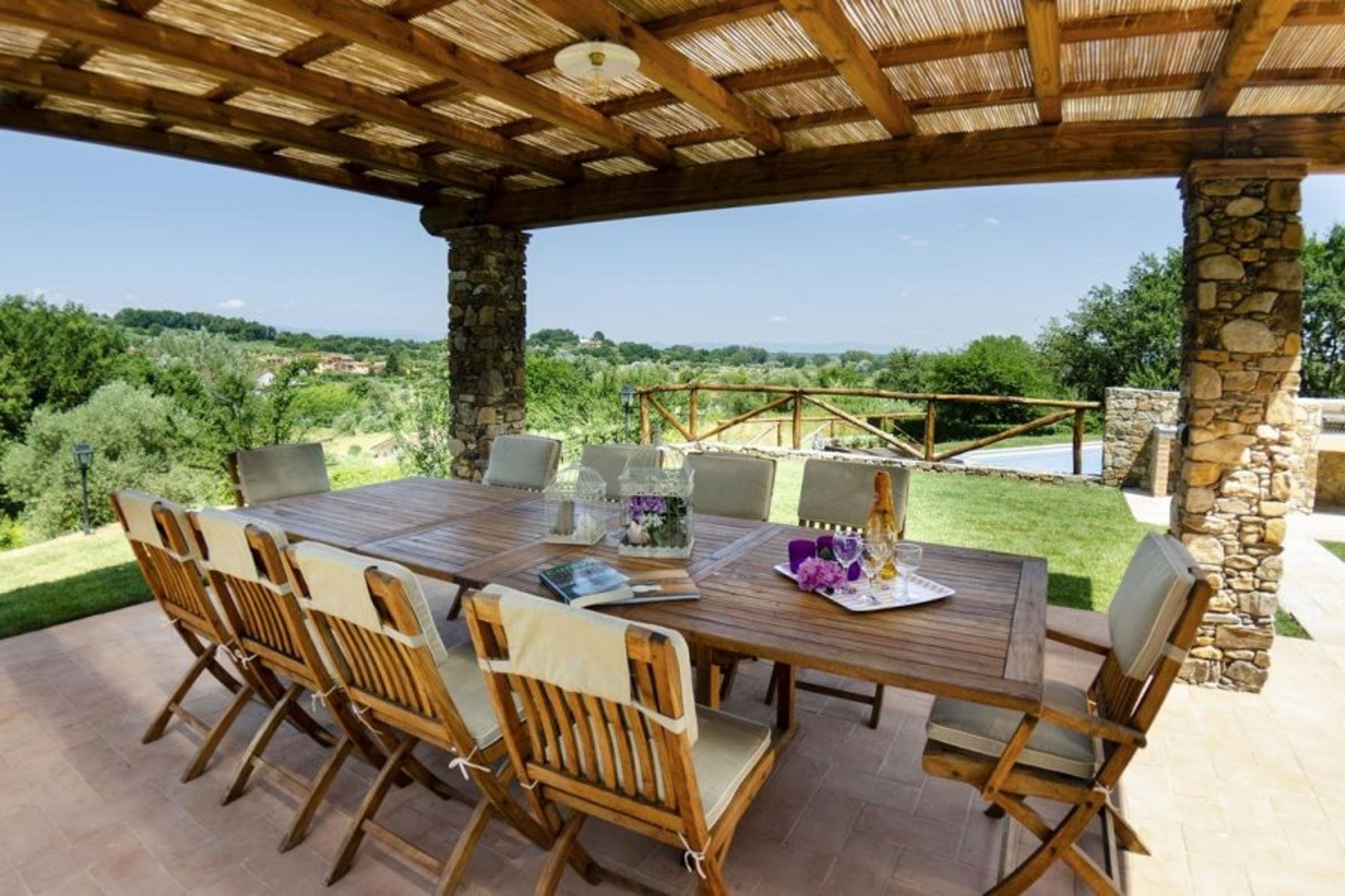 While maintaining a rustic atmosphere, your holiday home provides all the amenities you might want for a family vacation, including a private pool with sunbeds and a dining area under a pergola overlooking the breathtaking scenery.