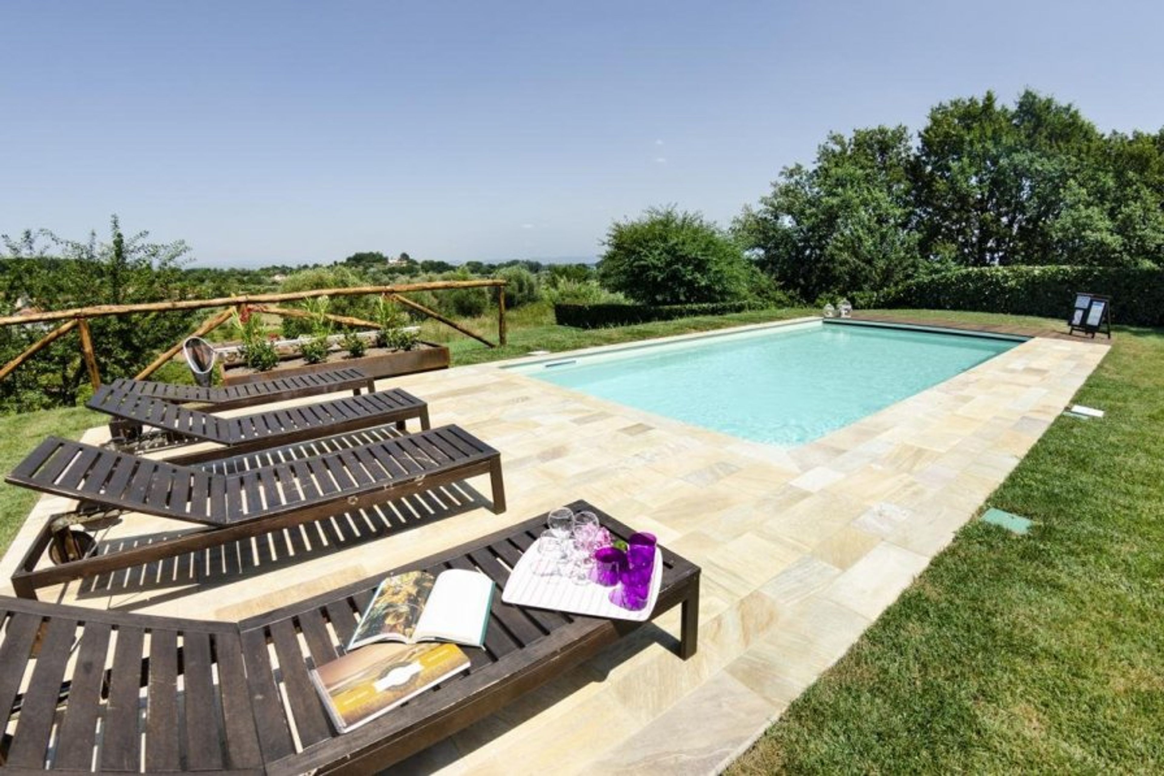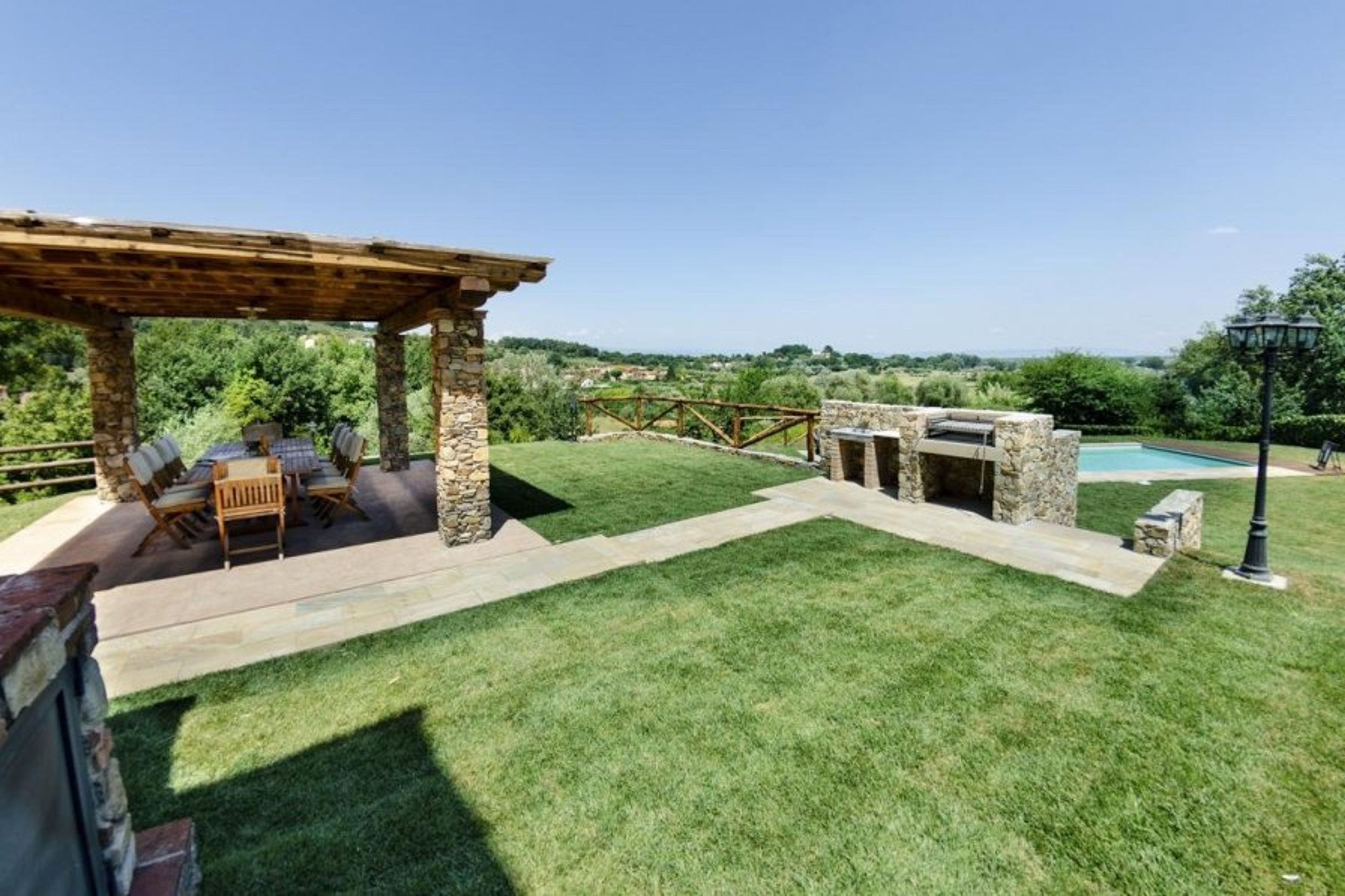The property boasts magnificent views of the Tuscan countryside; the garden has a natural feel, with sloping grassy sections and mature trees that feel like an extension of the campagna.