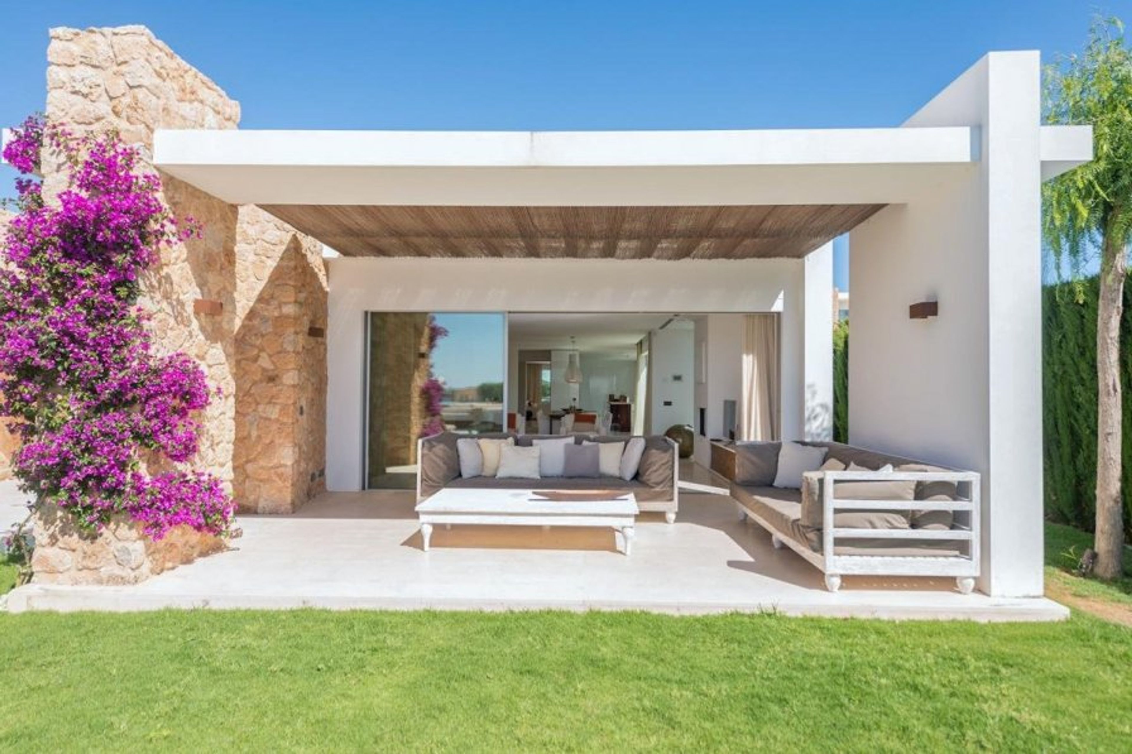 A large table and a set of white cloth-covered chairs are located in the eating area, which also follows the same style.