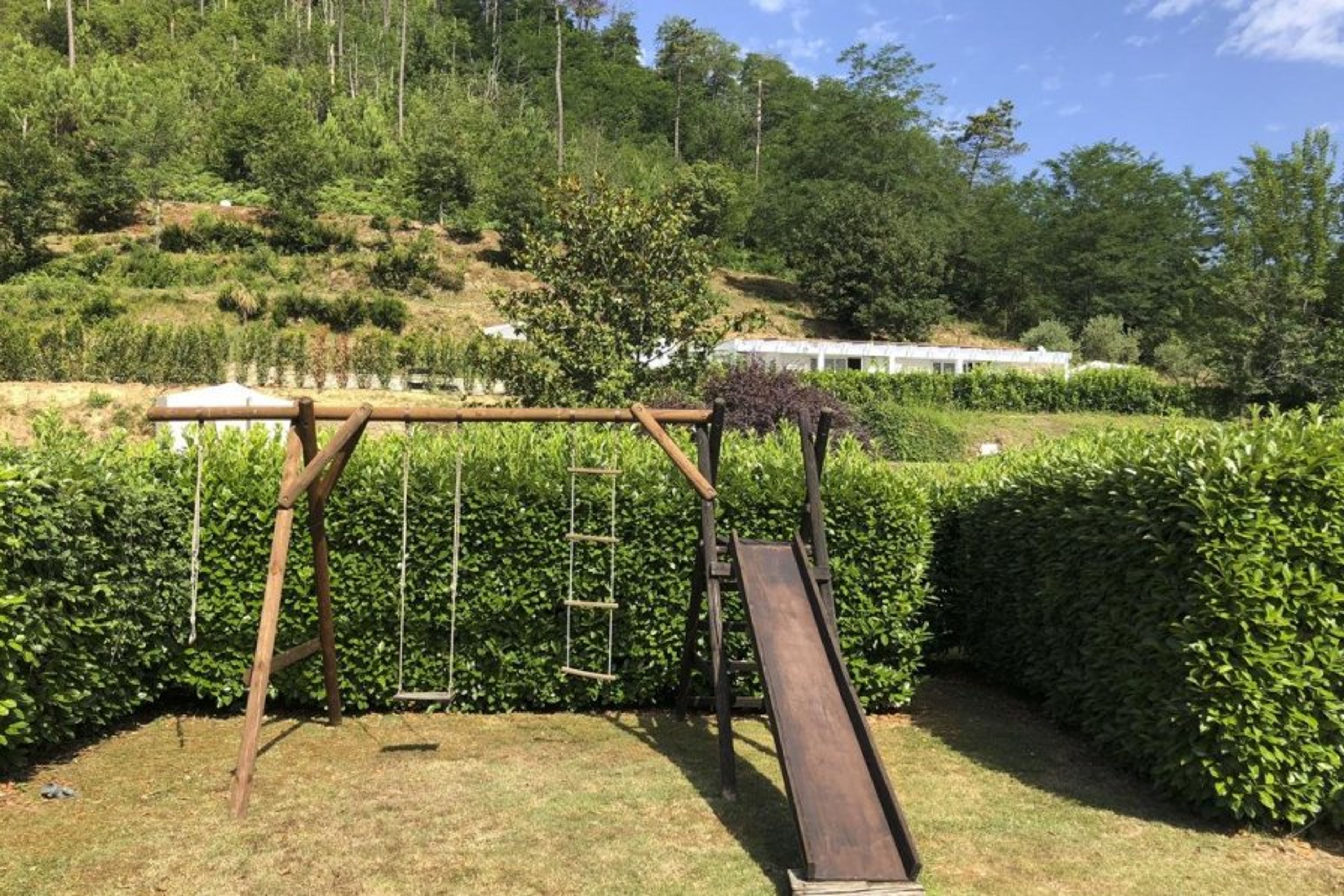 The private swimming pool is placed inside a lovely terrace with a partially-covered dining area and sun loungers. A playground for children is located behind the pool. A football pitch with goals and a tennis court is located further into the gardens. There are also other dining options, including a BBQ. There's also a little gym available!