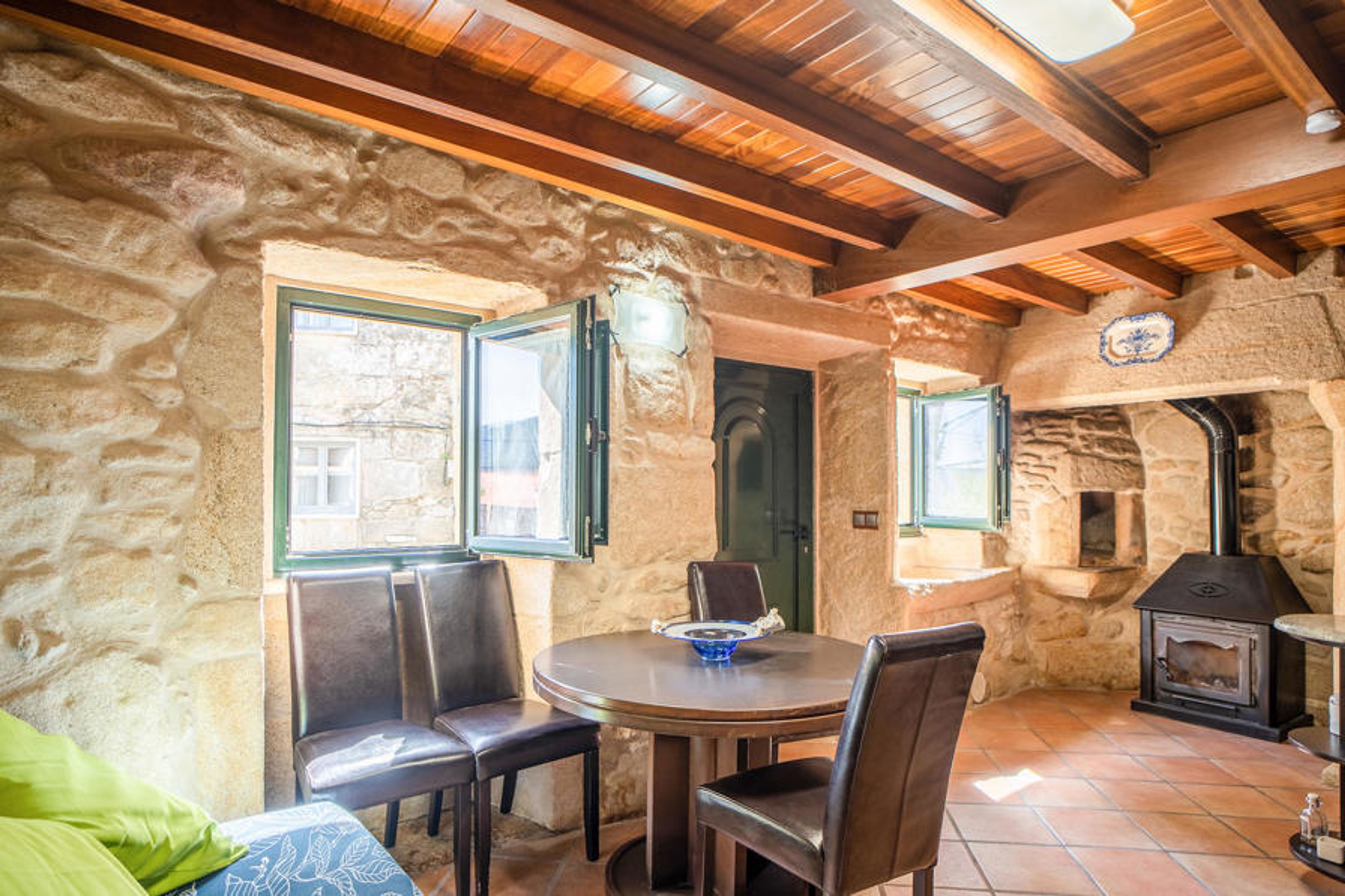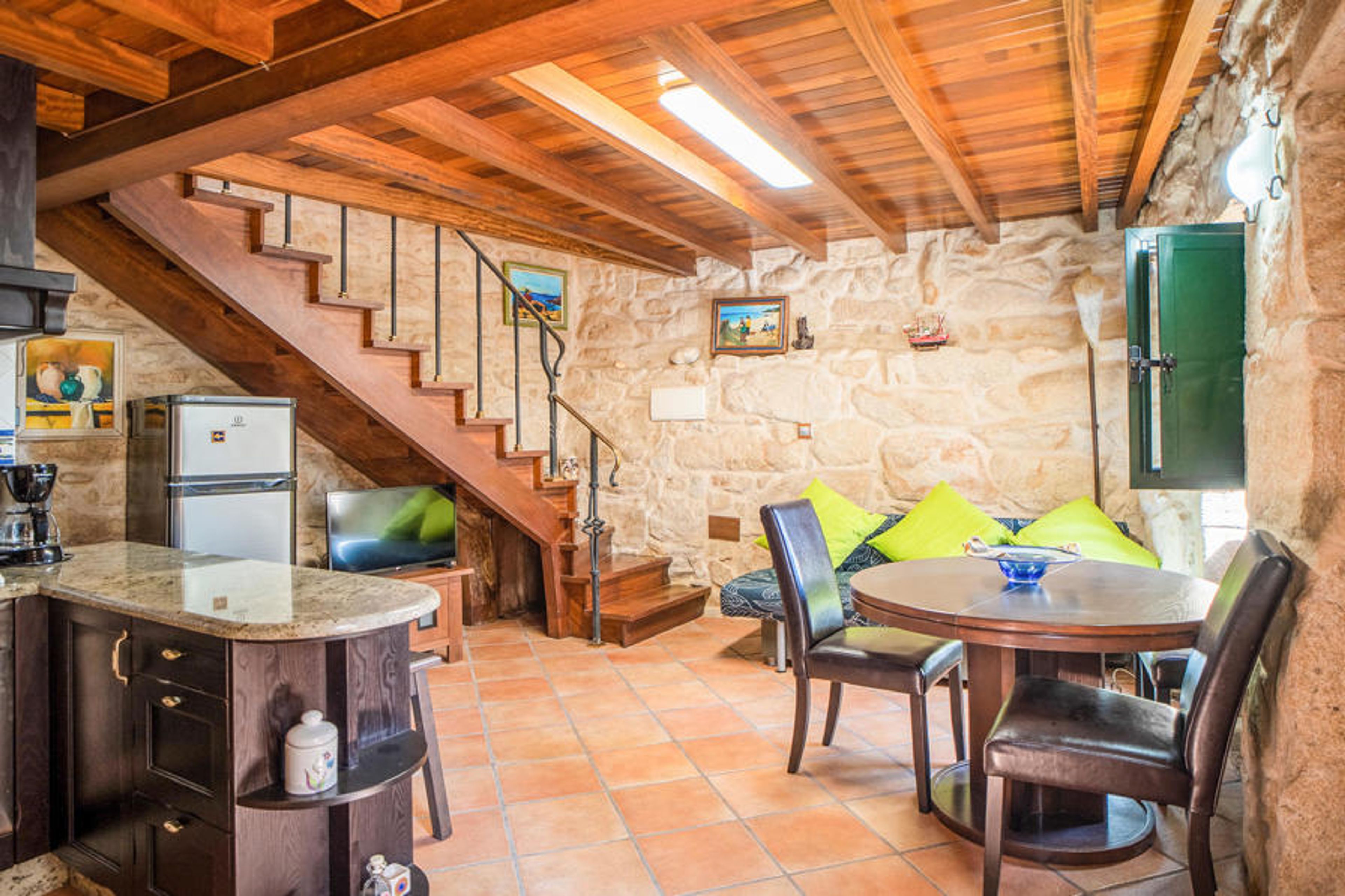 Spend a relaxing vacation with your small family in this beautiful stone house in Muros. It offers you on two floors a cozy living room, with fireplace and open kitchen, where you can swing the wooden spoons together in the evenings.
