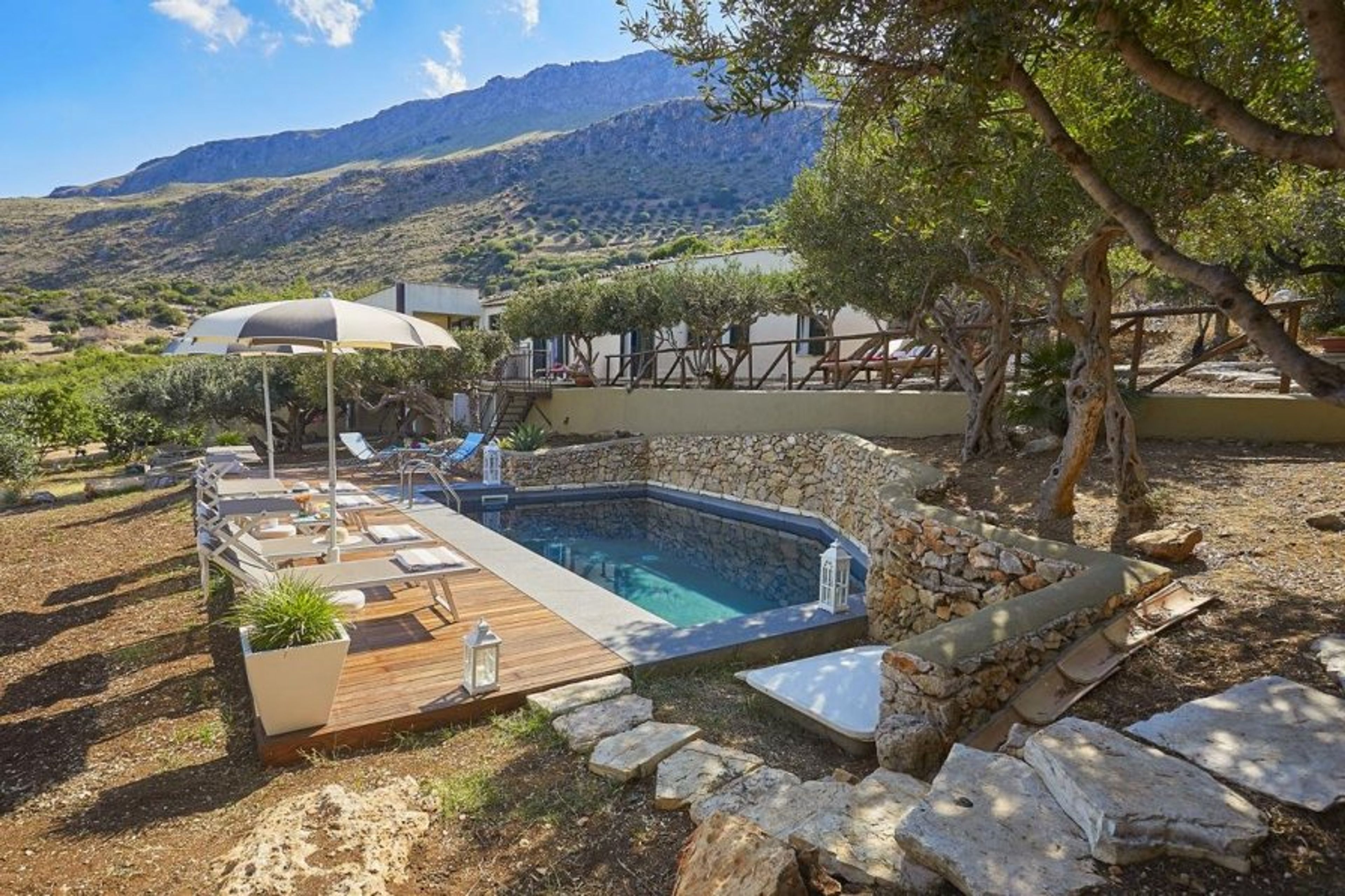 There's a giant caribou tree for shade, a cosy hammock, a built-in stone BBQ, a terrace dining place, and a pool surrounded by olive trees. There are also ample chairs and sun loungers.