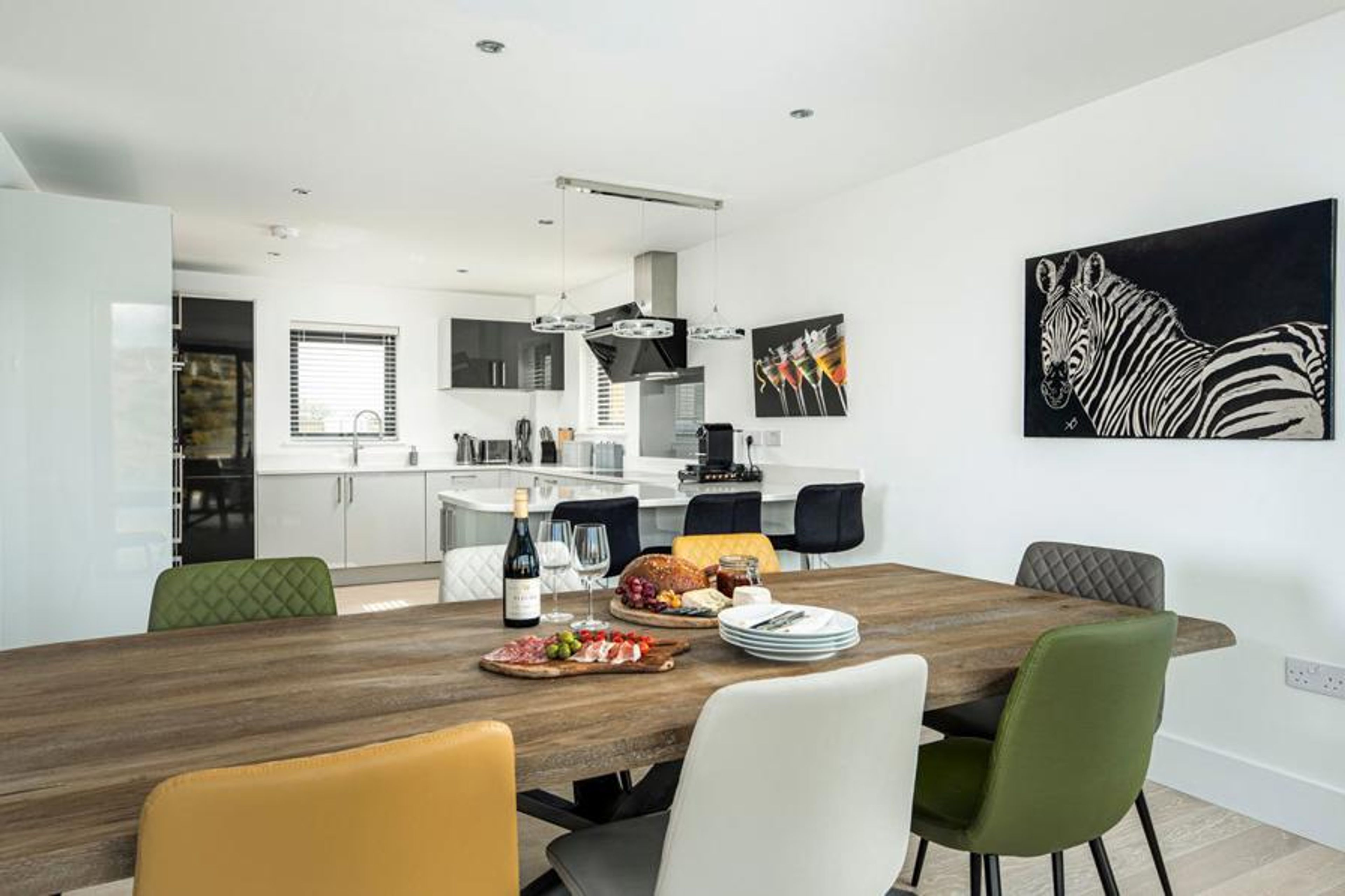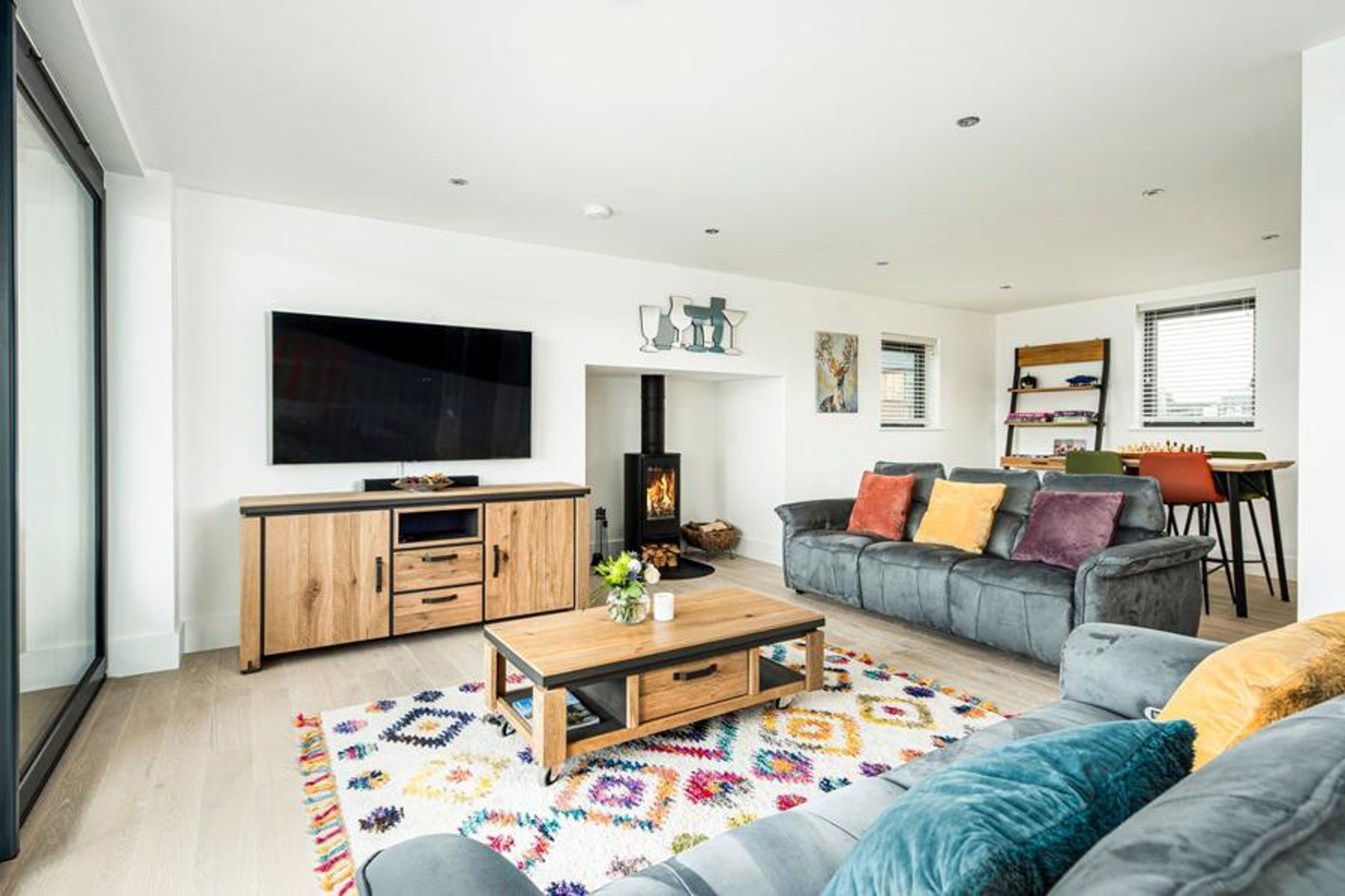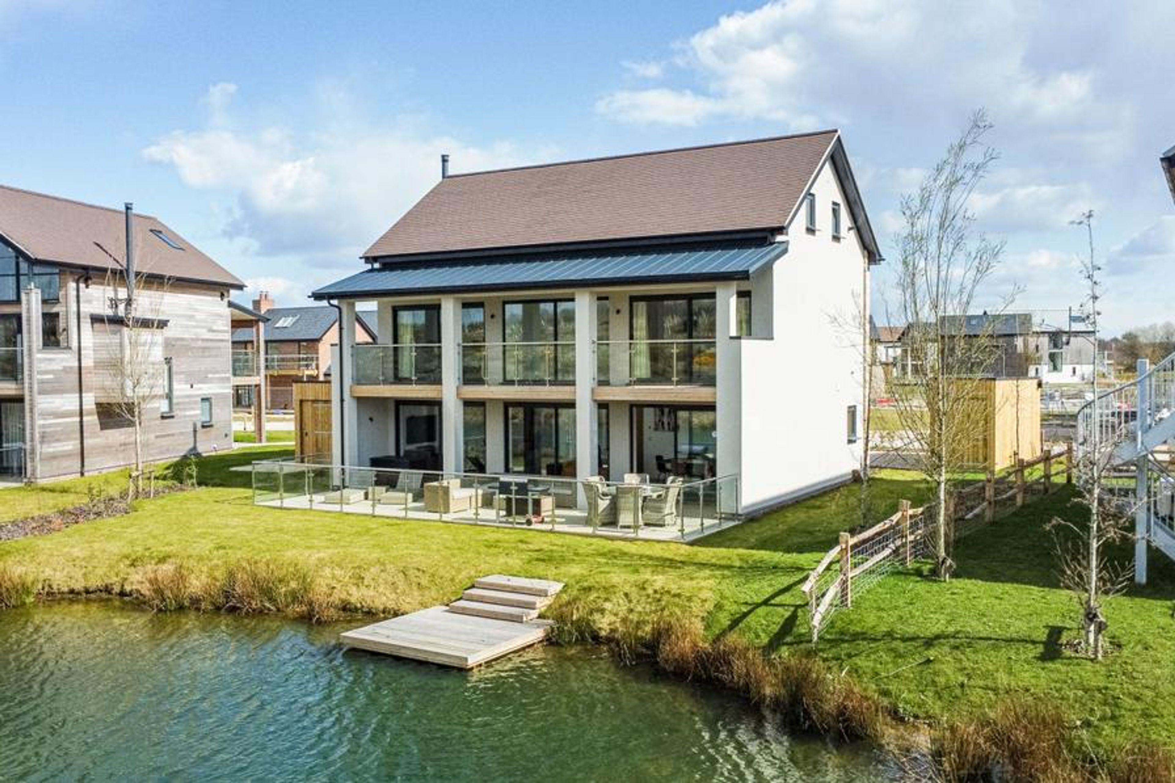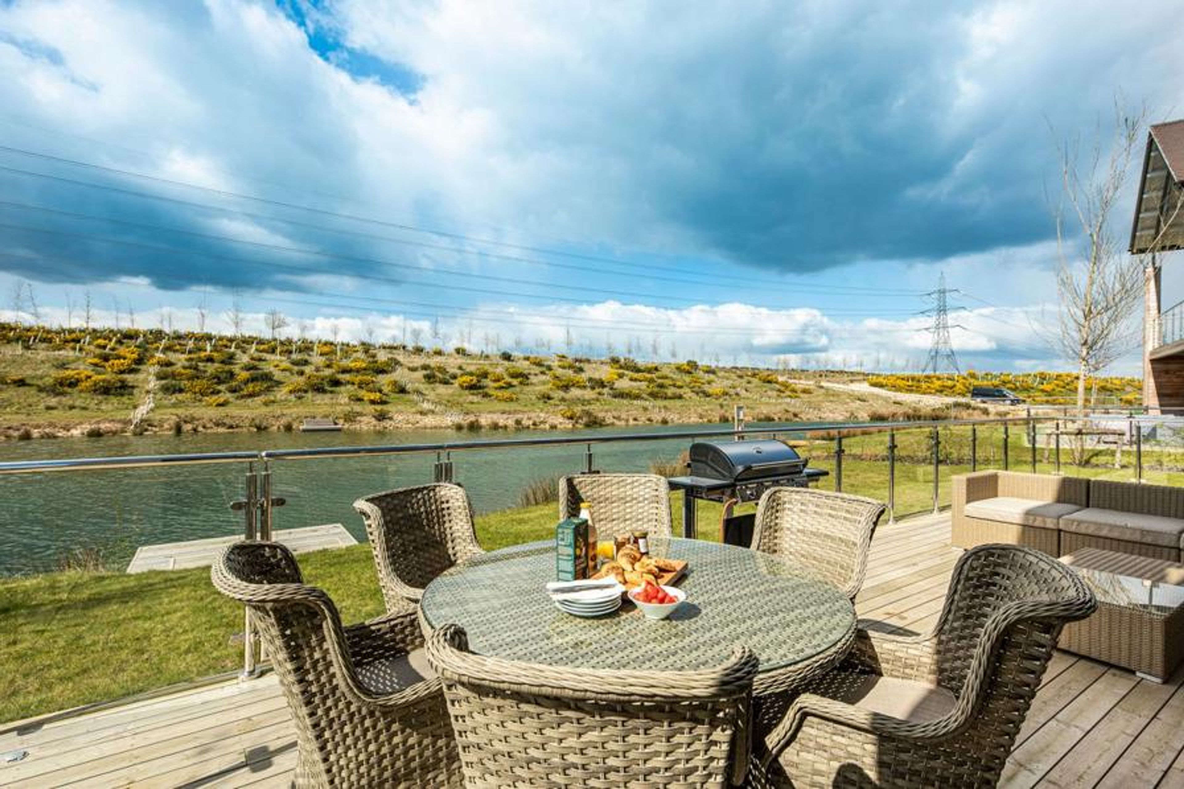 Step inside to find a contemporary retreat adorned with modern amenities and elegant furnishings. The open-plan living areas provide views of the surrounding landscape, while plush sofas and a fireplace invite you to unwind in style. Large windows and sliding doors effortlessly capture the stunning surroundings, leading to a glass fronted private decking right on the lakes edge.