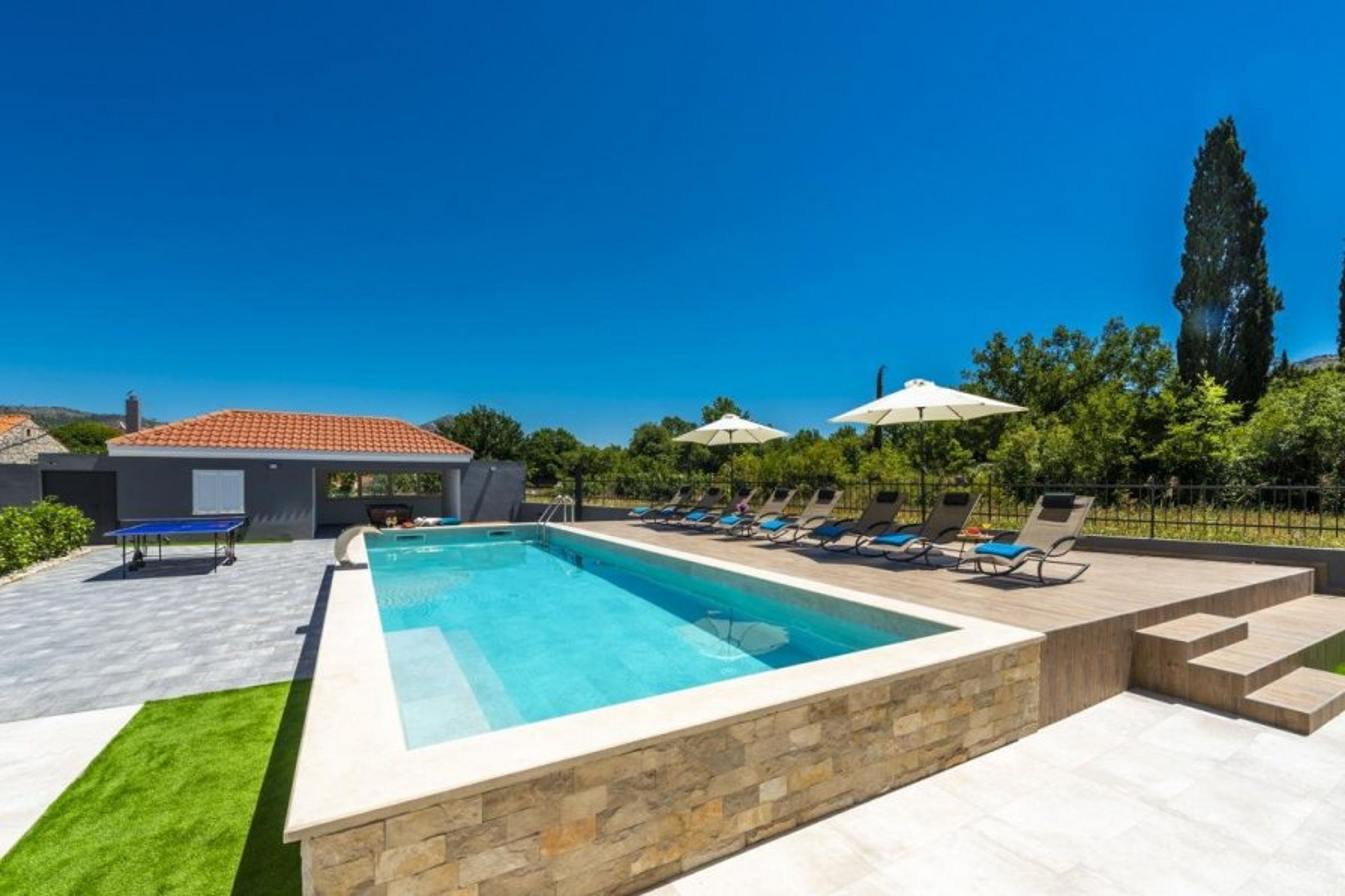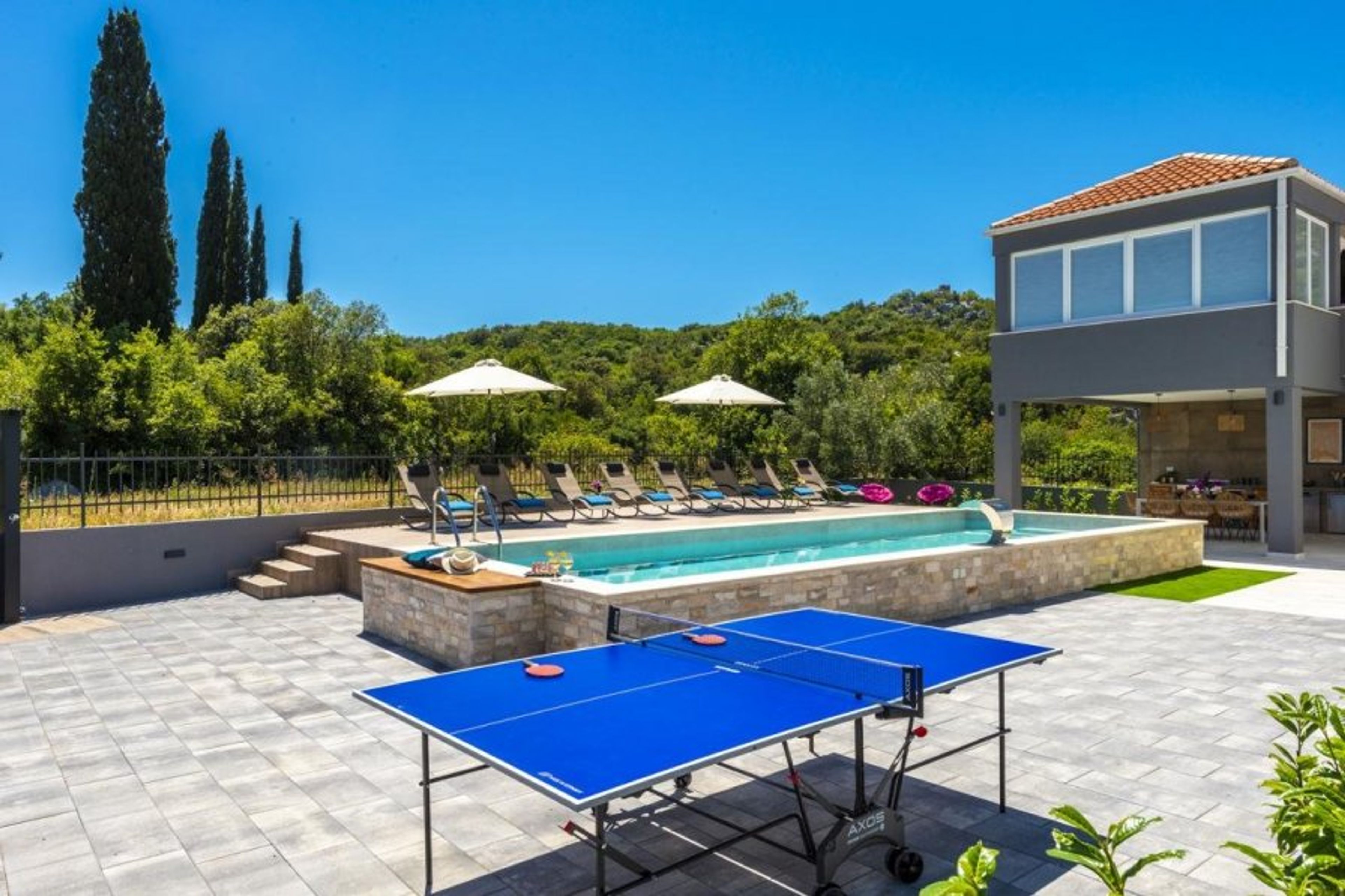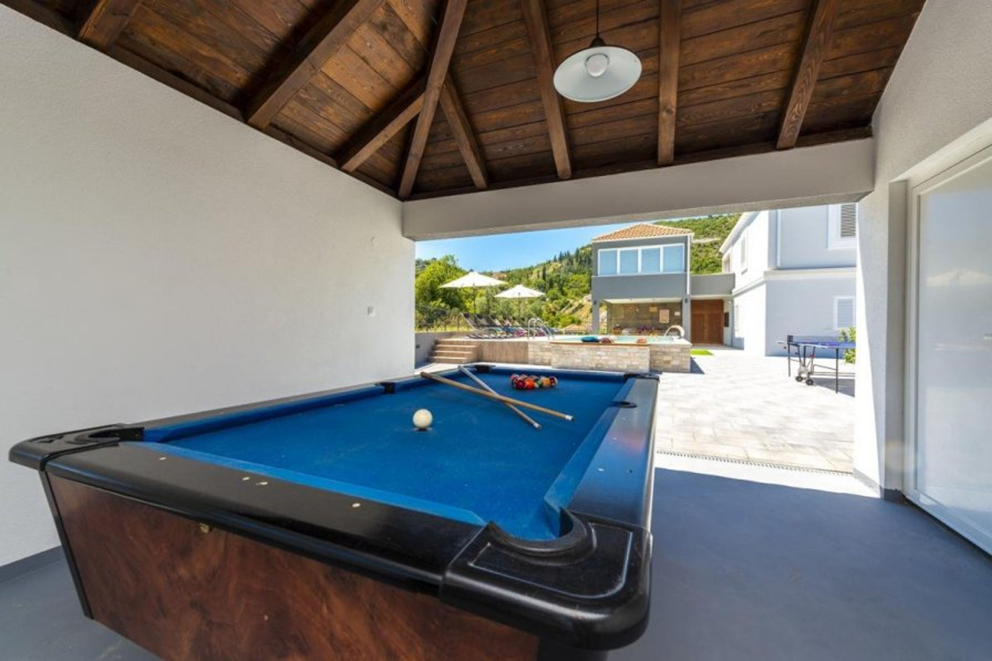 There is a separate room for table tennis as well as a garden area with moveable lounge chairs.