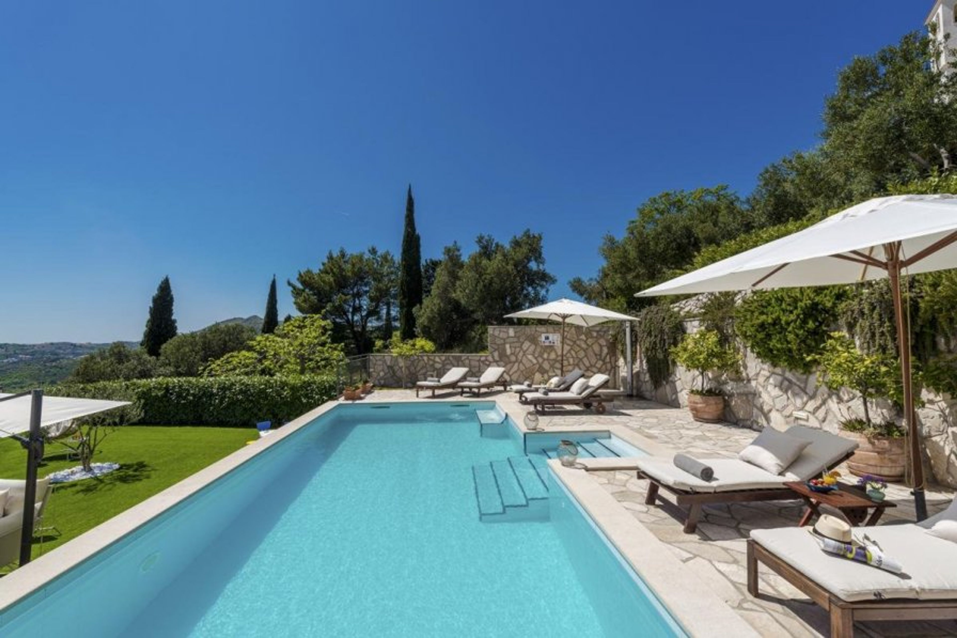 The garden, which has lawns, trees, and outdoor furniture, is located below the pool.