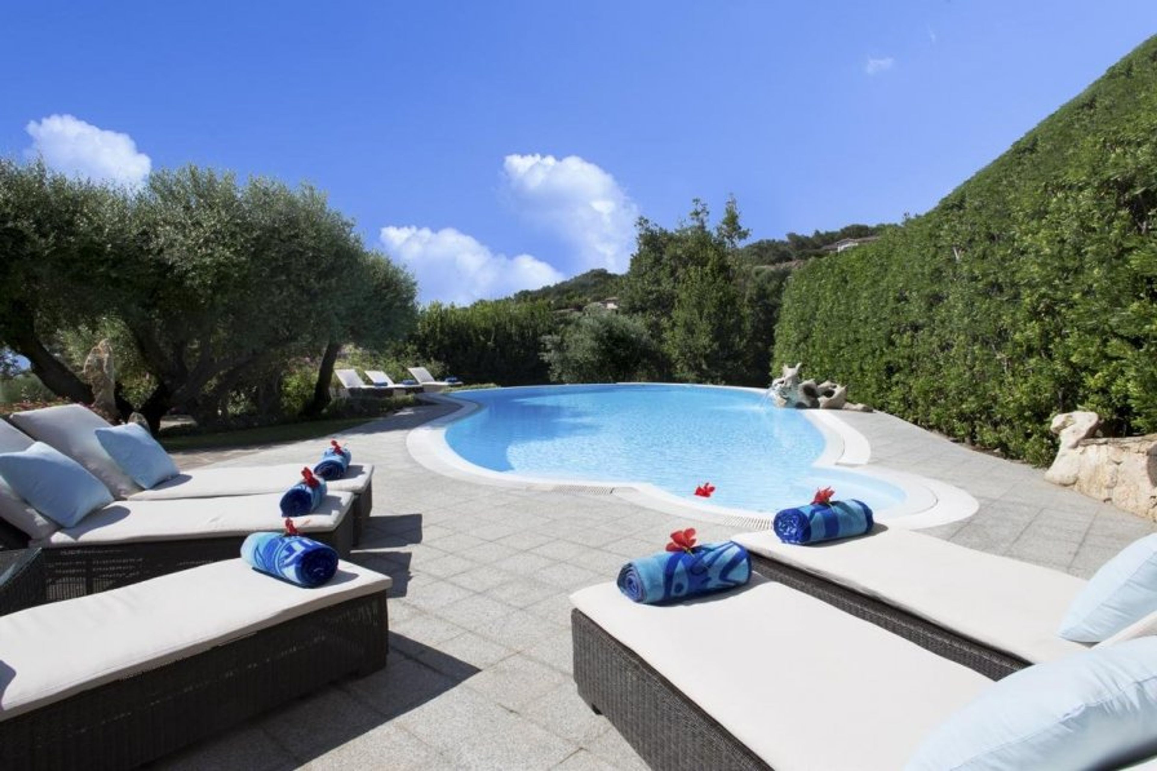 The magnificent swimming pool, with its Jacuzzi, jet stream feature, and underwater music system, is a delight, surrounded by beautifully maintained gardens studded with splashes of Mediterranean colour and vistas of the azure sea.
