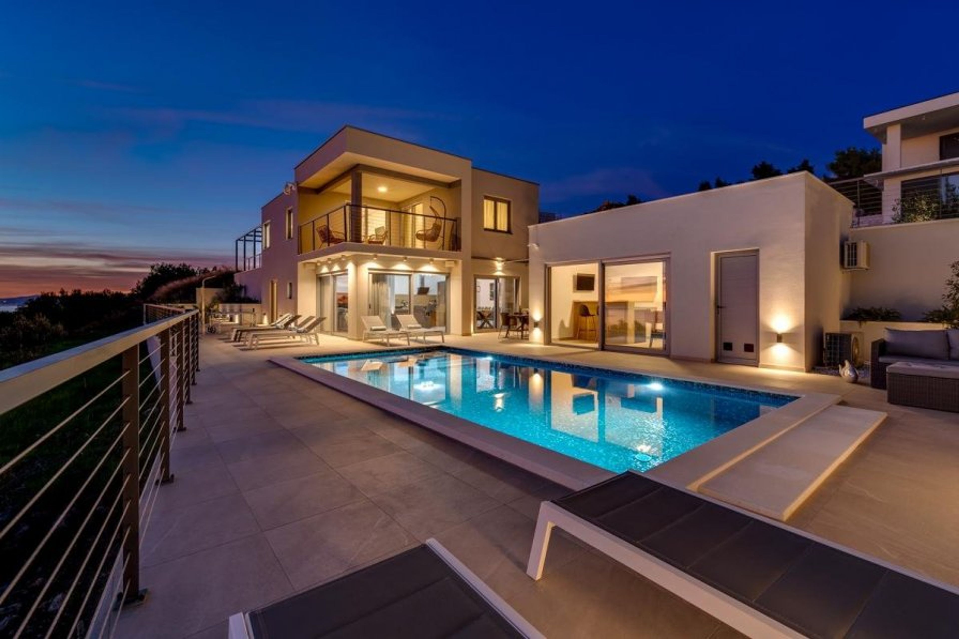 The property features a serene, minimalist interior design and looks out over the Adriatic Sea.