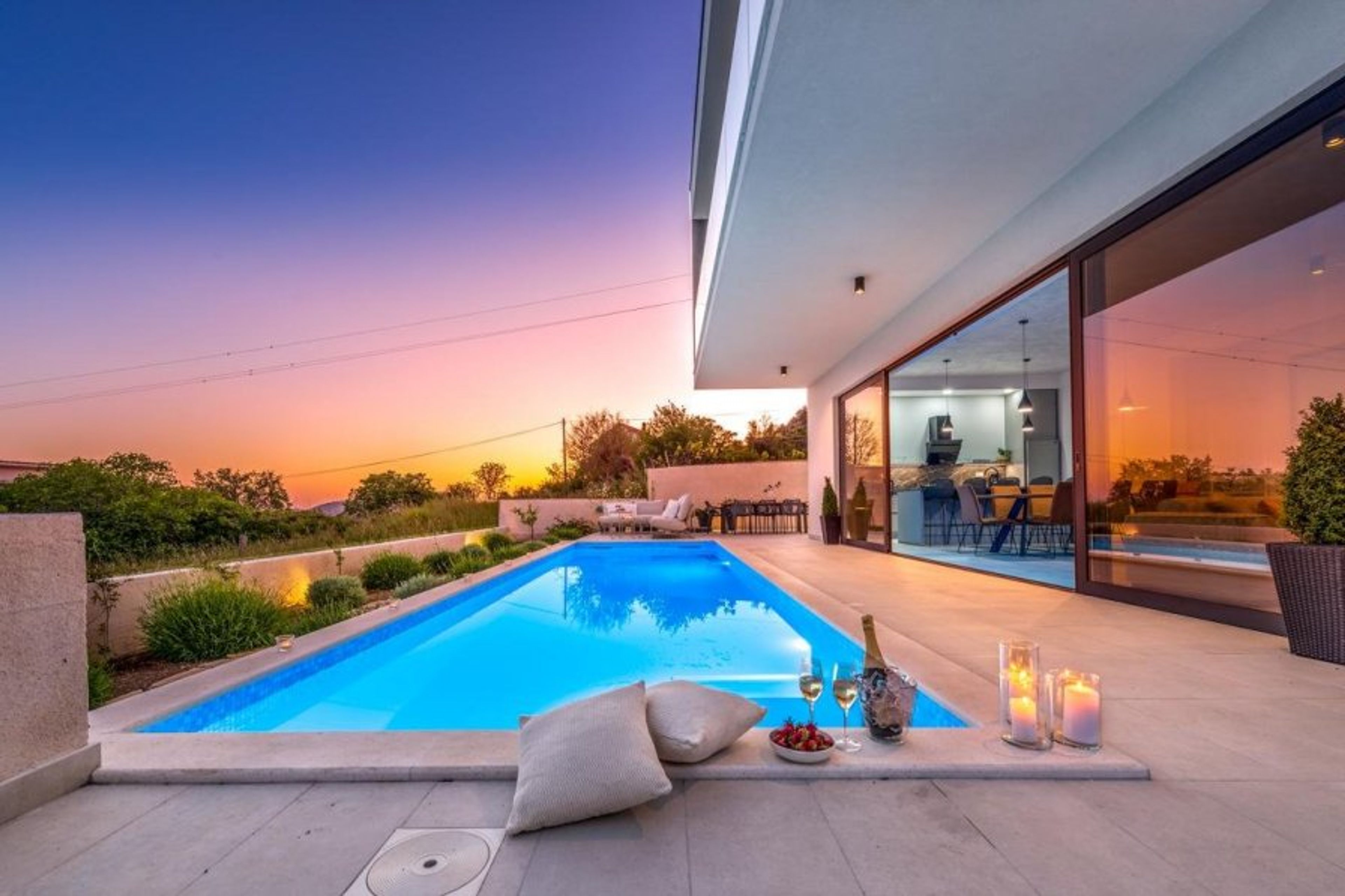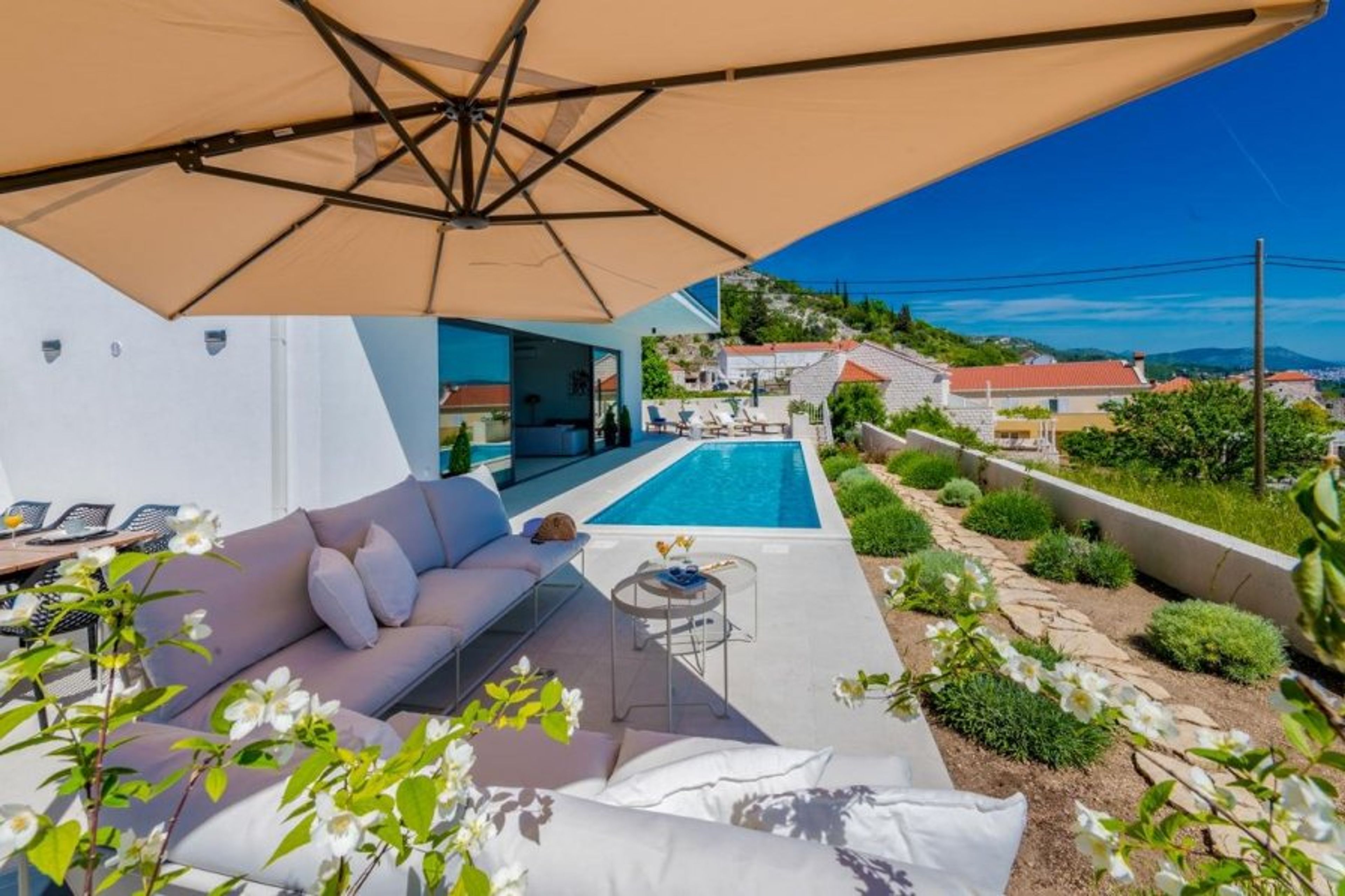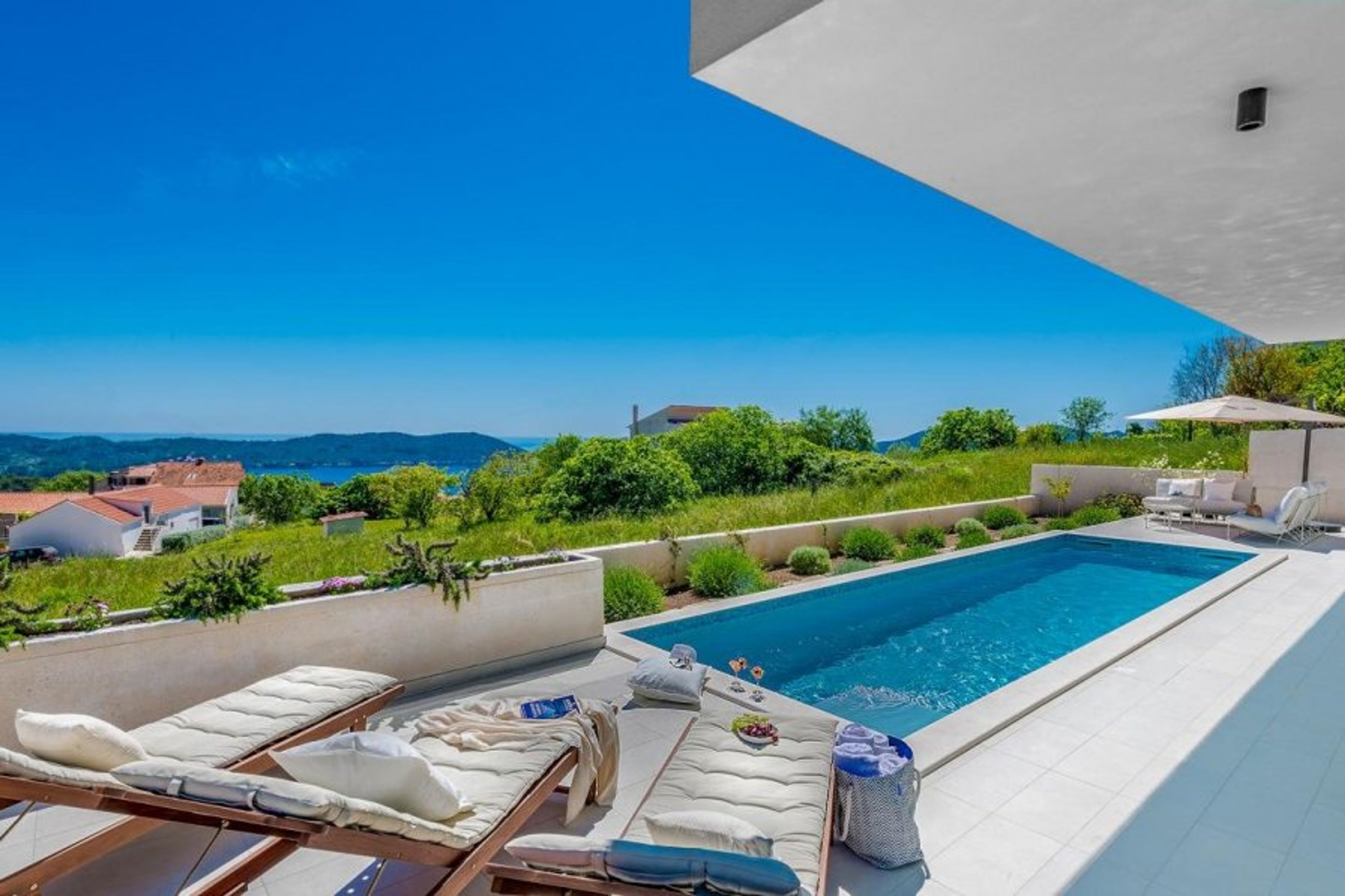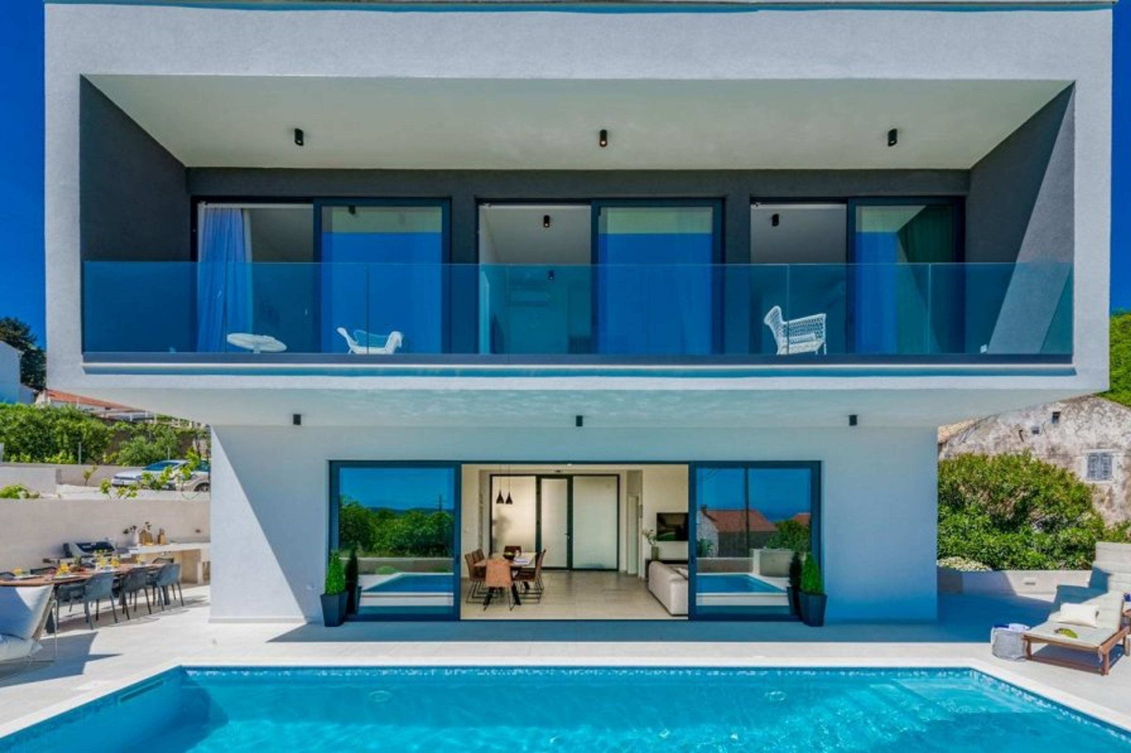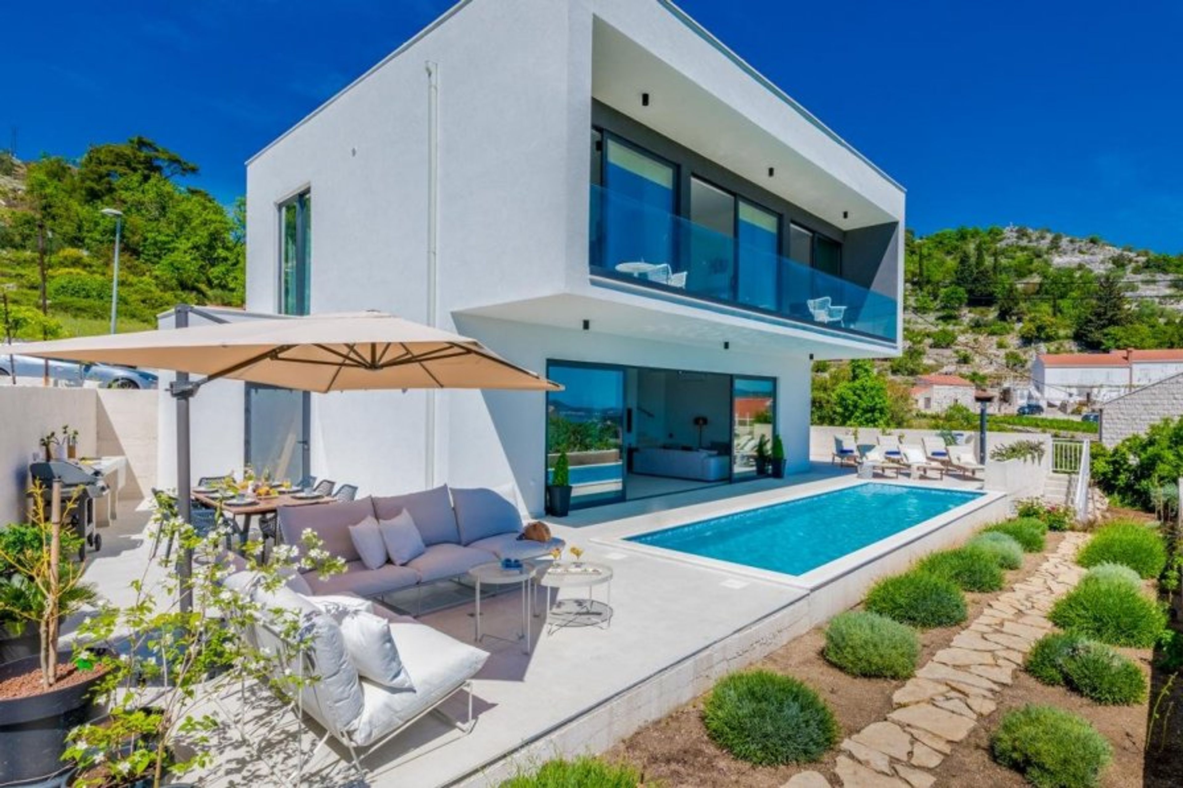 Its box-like construction sparkles in the Croatian sunshine, and the upper balcony, lower patio, and garden are all excellent.
