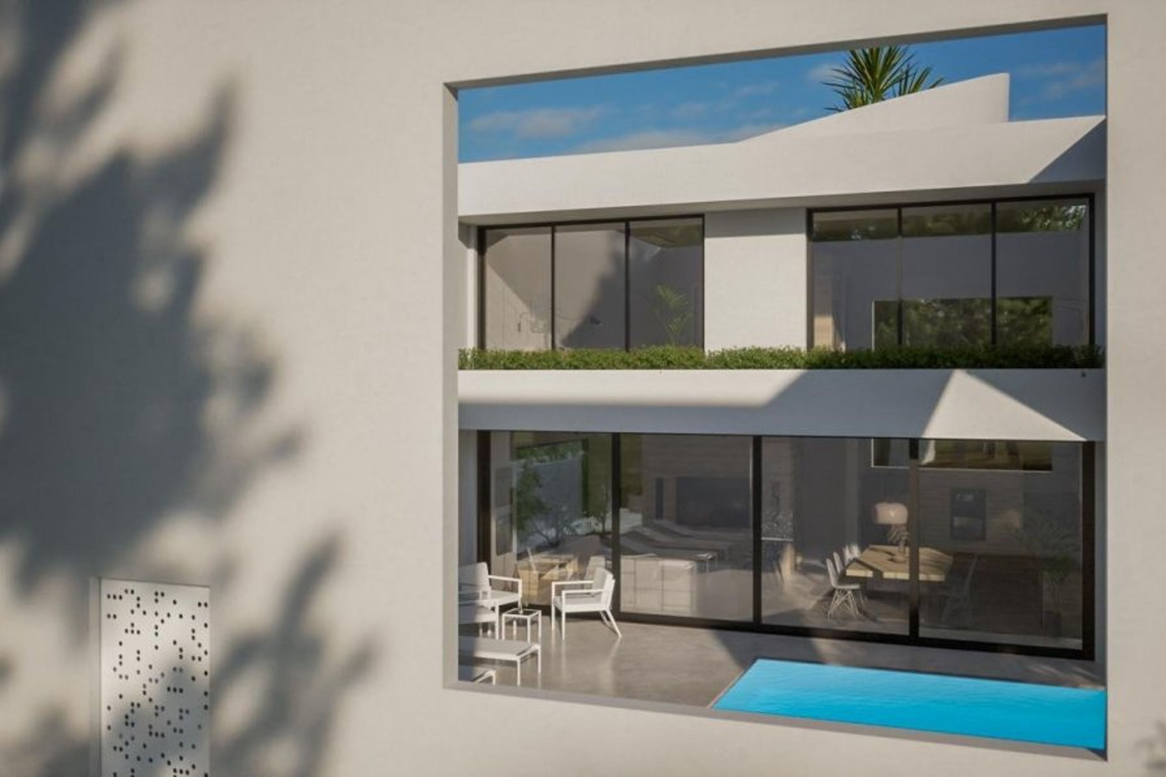 The villa's interior is connected to the terrace via floor to ceiling glass doors.