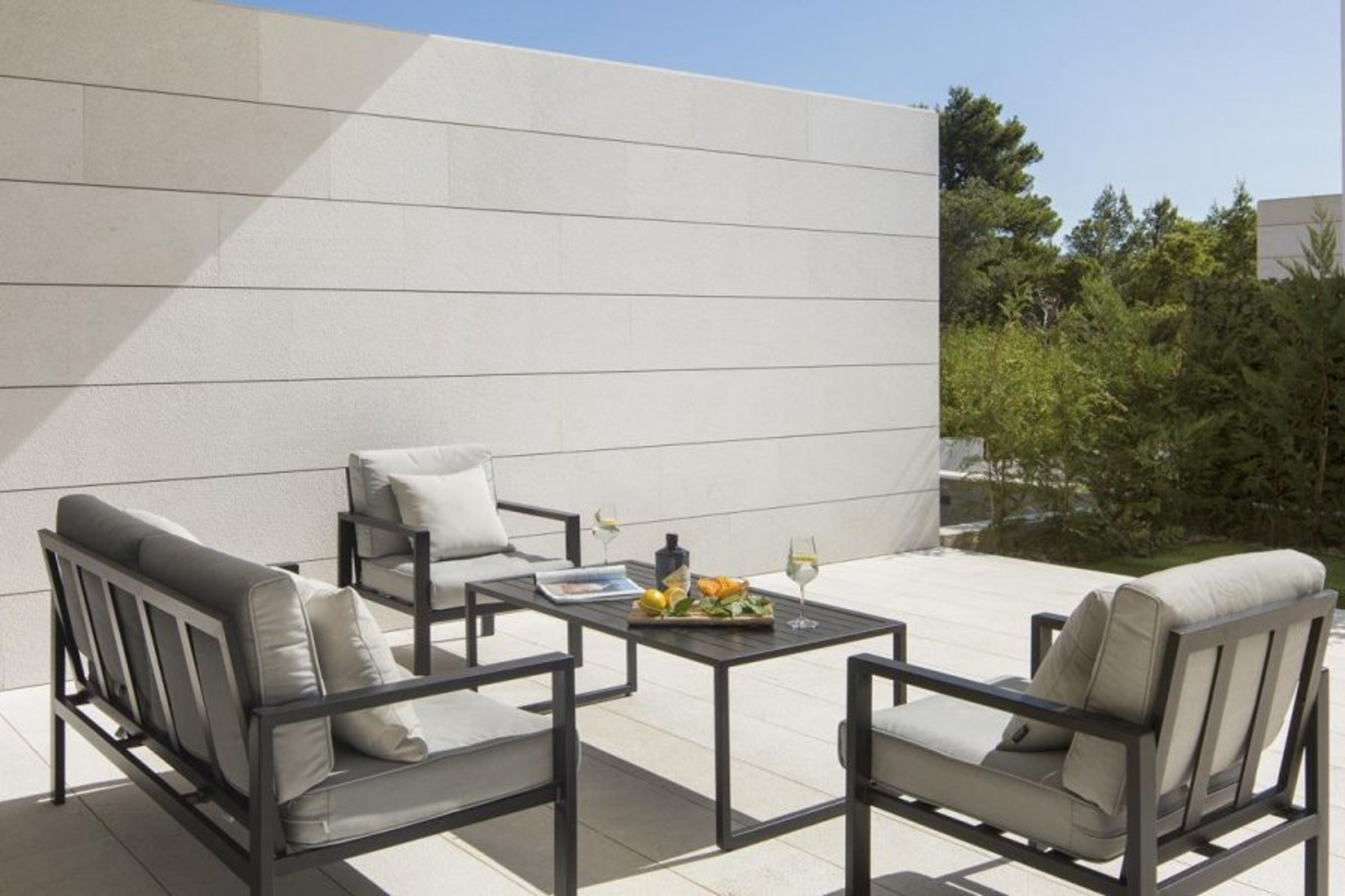 The villa has a comfortable, roomy interior with neutral tones, solid wood furniture, and soft furnishings in a contemporary design that can sleep up to 8 people.