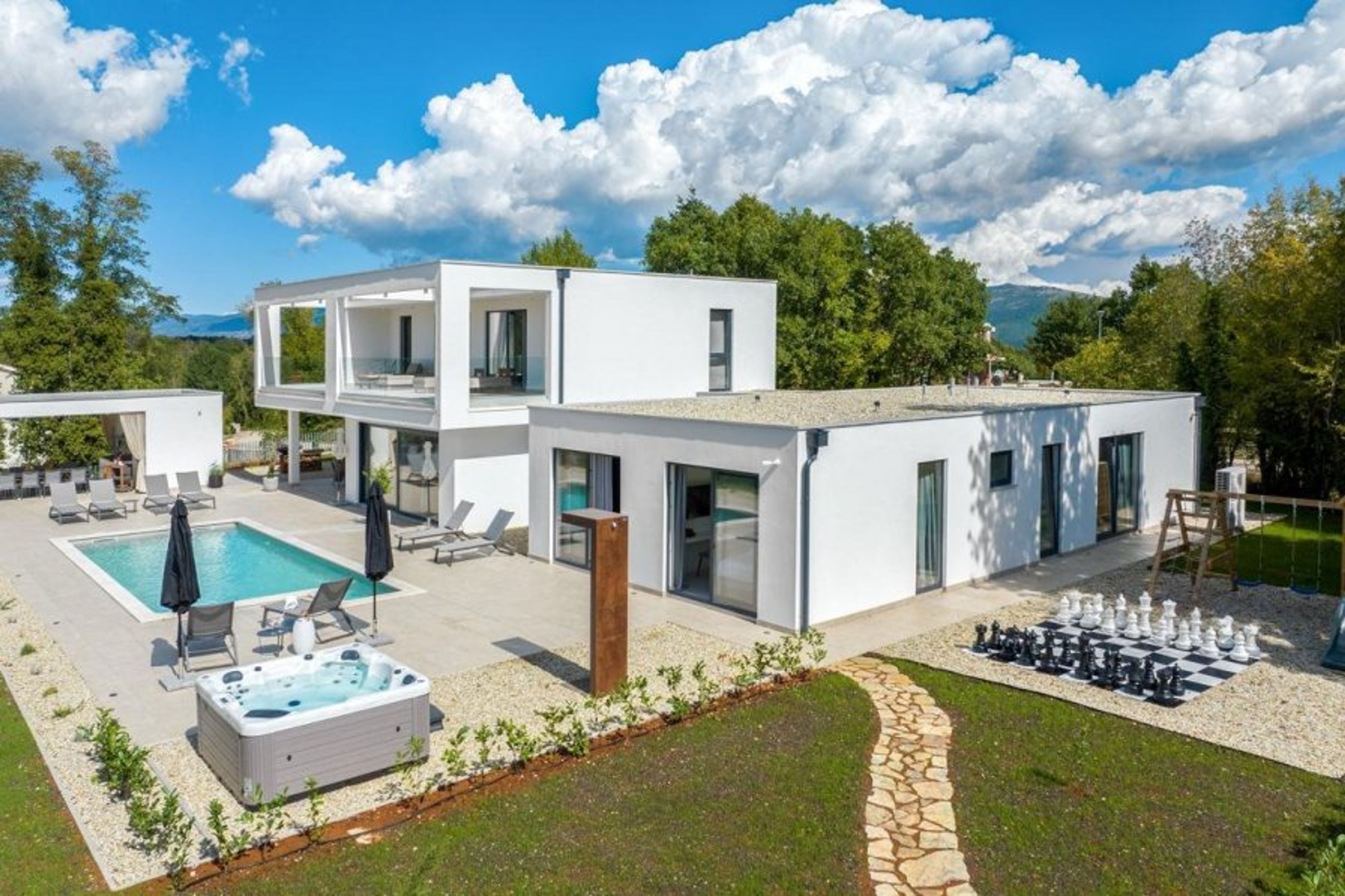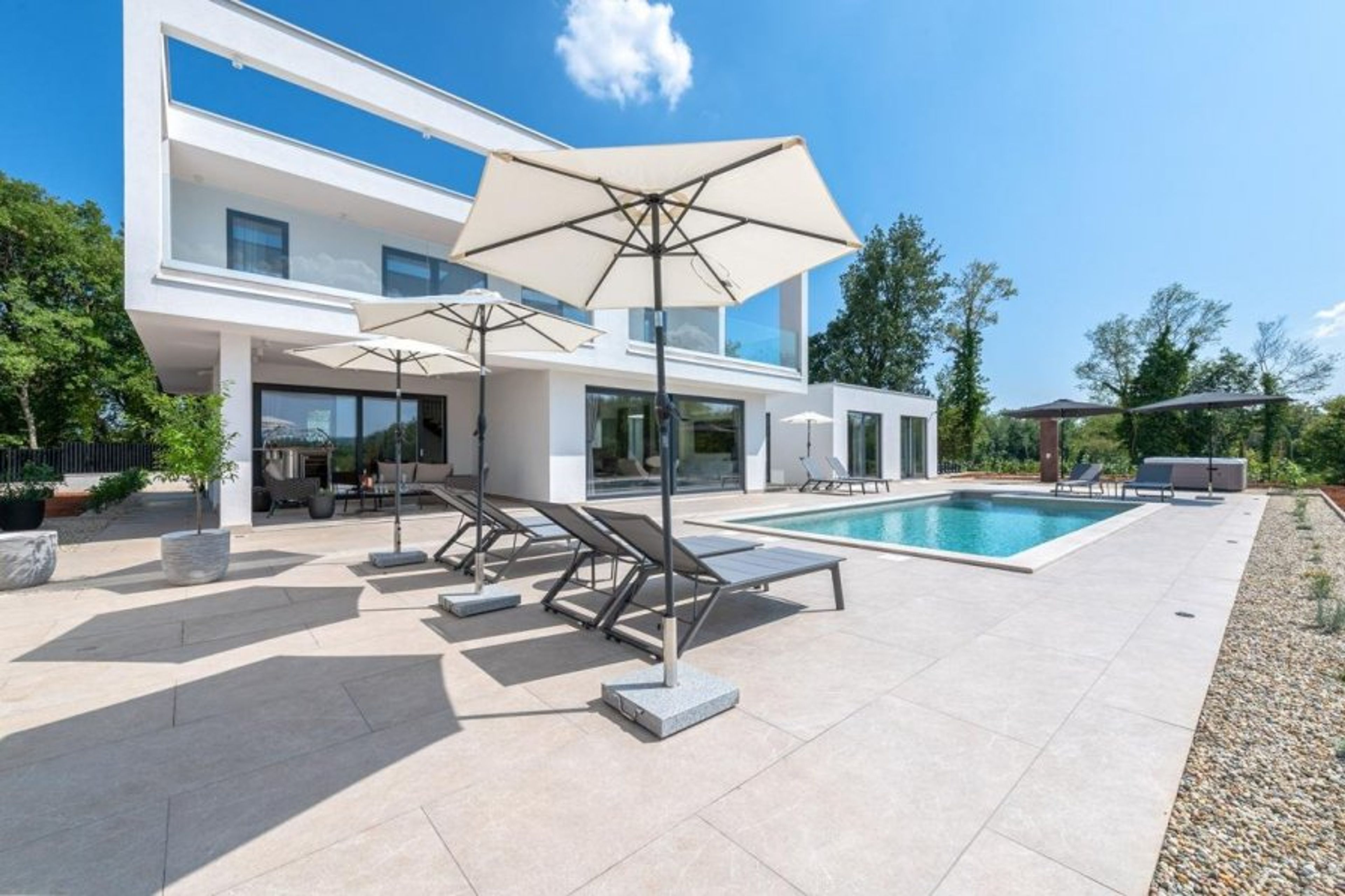 Spend the day reading, swimming, or relaxing in the jacuzzi while lying on a sunbed.