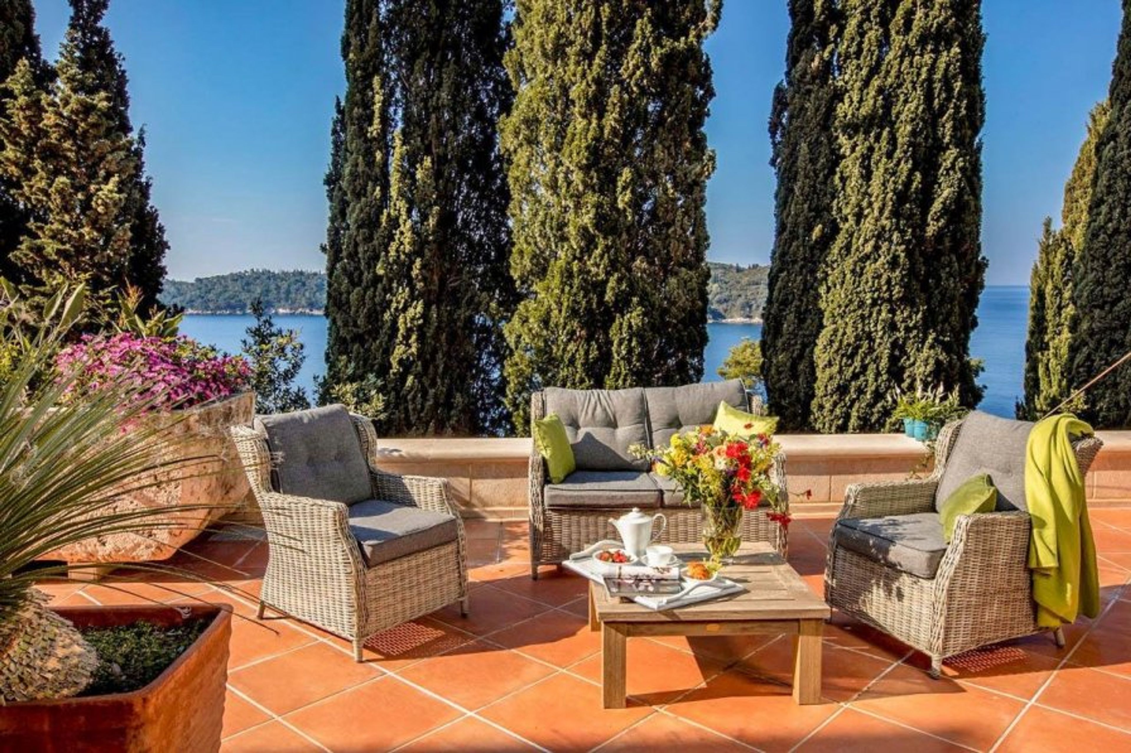 Another terrace, ideal for afternoon tea, has excellent lounge furniture and is surrounded by huge cypress trees.