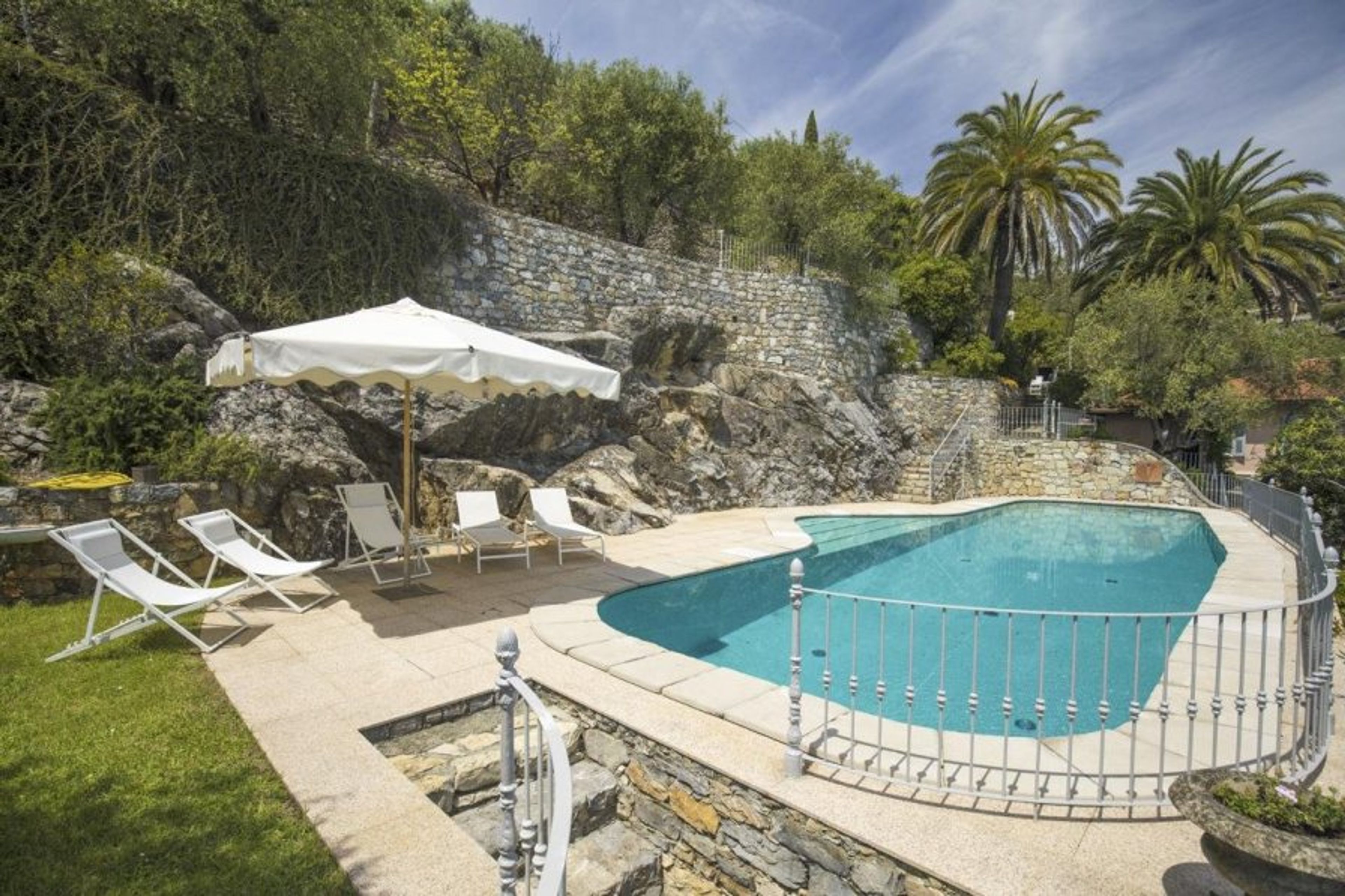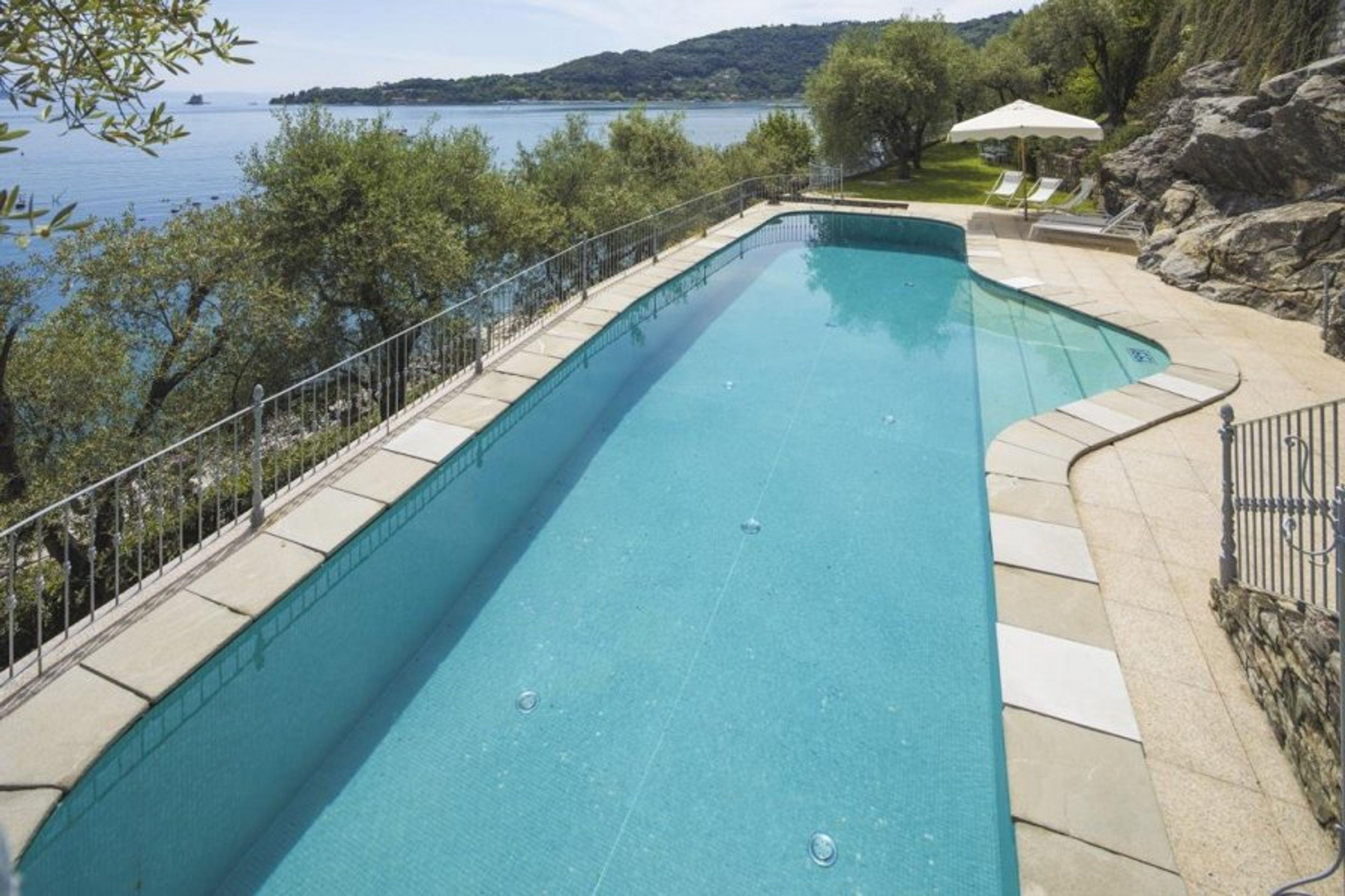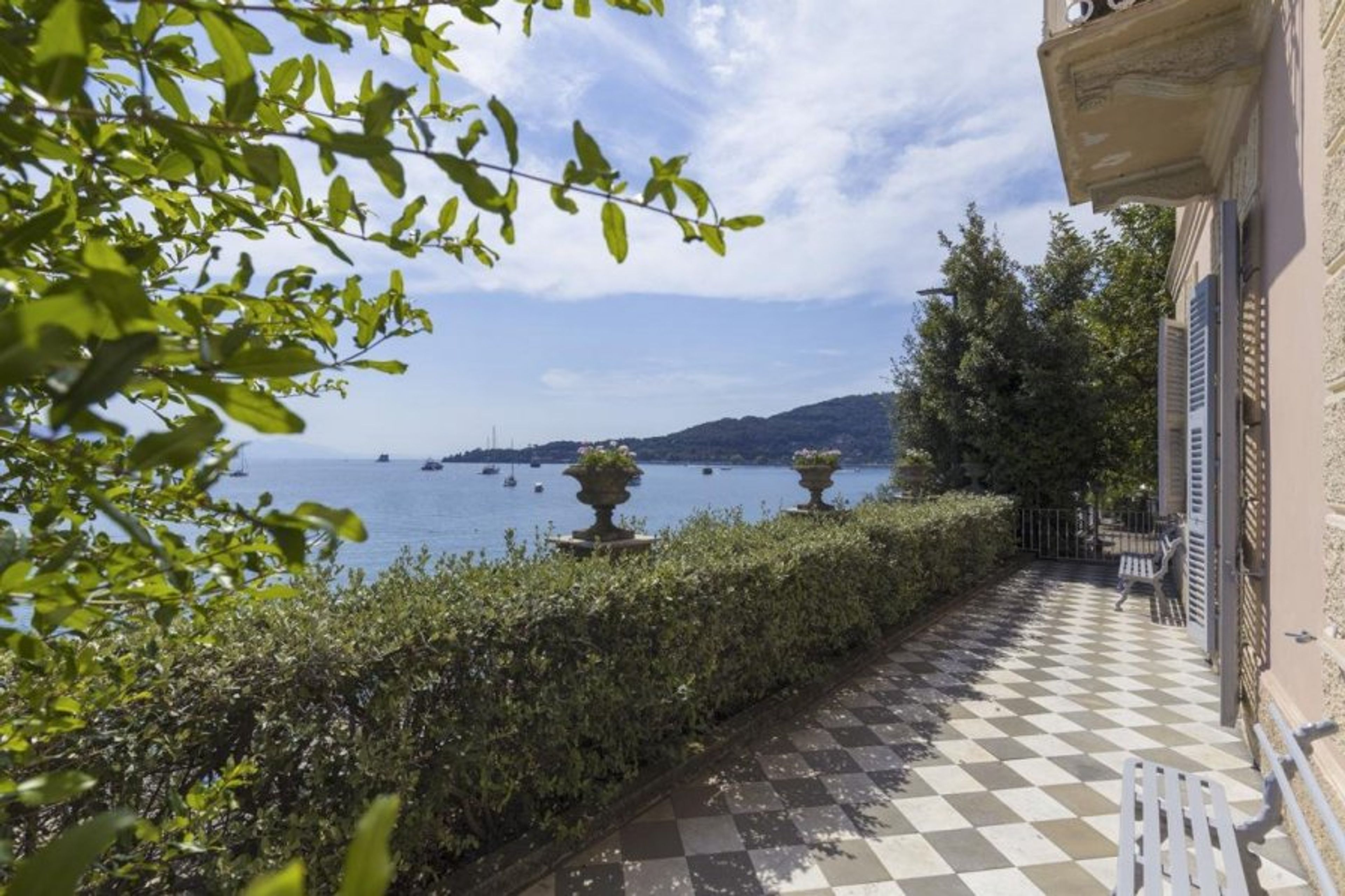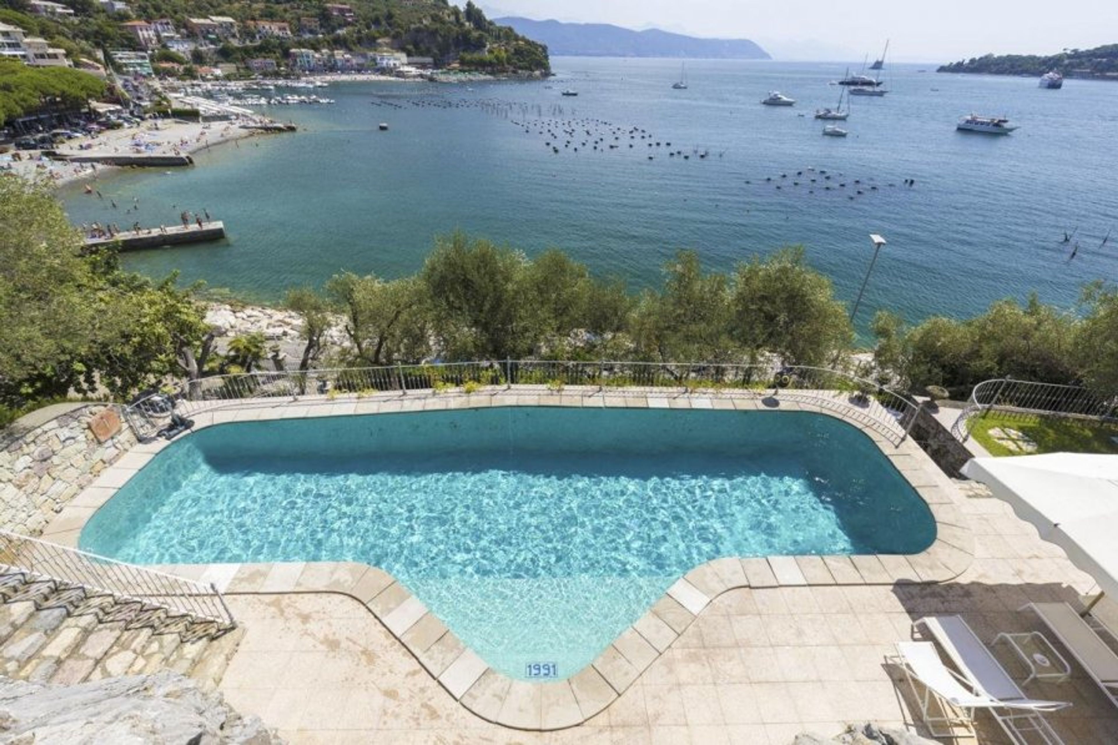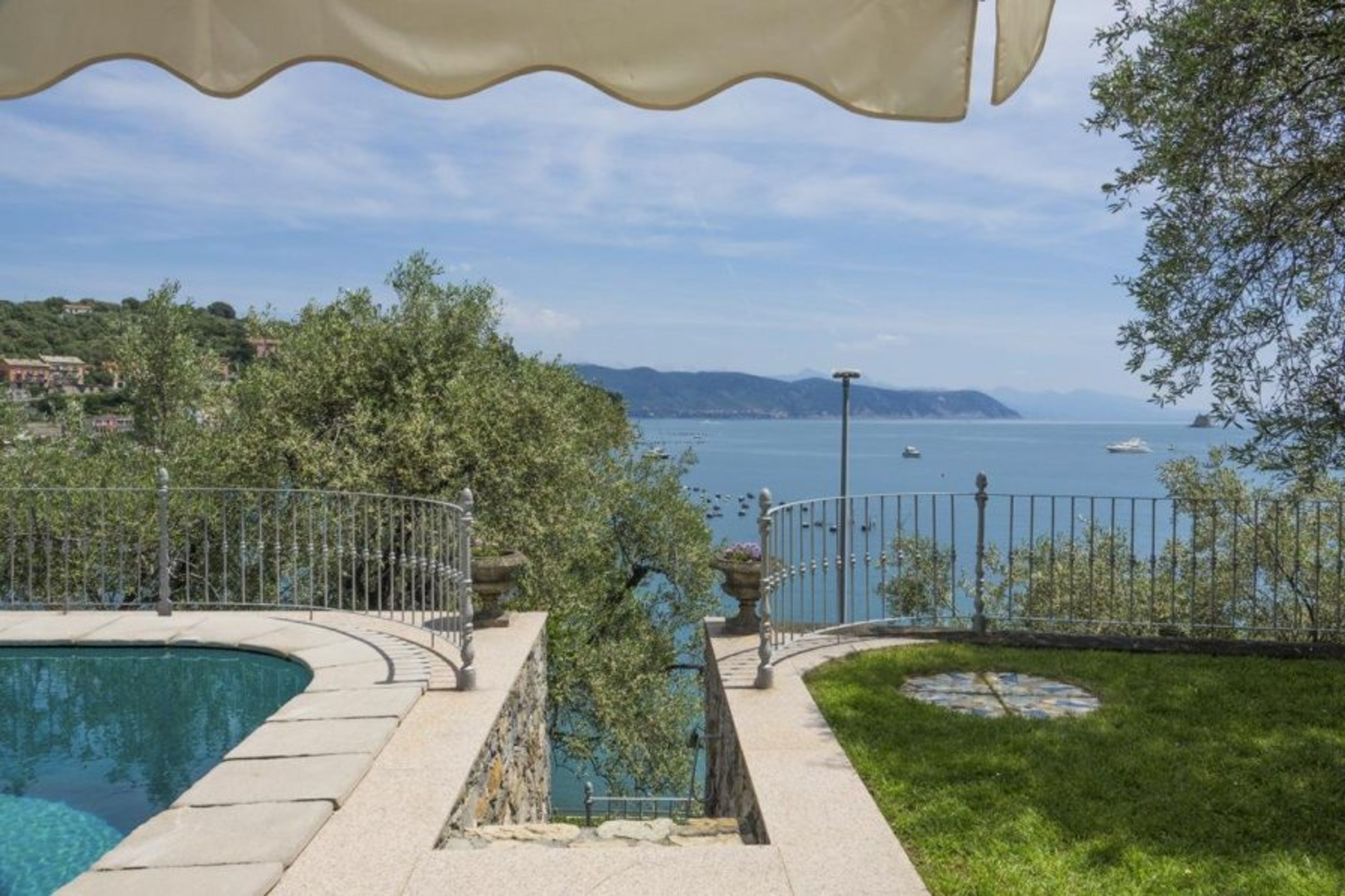 Step outdoors onto the initial paved terrace, which features characteristic grey and white Carrara marble and offers views of the Ligurian shore. As you go down the stone walks and steps, you'll feel a sense of awe as you get glimpses of the shoreline below through the olive trees.