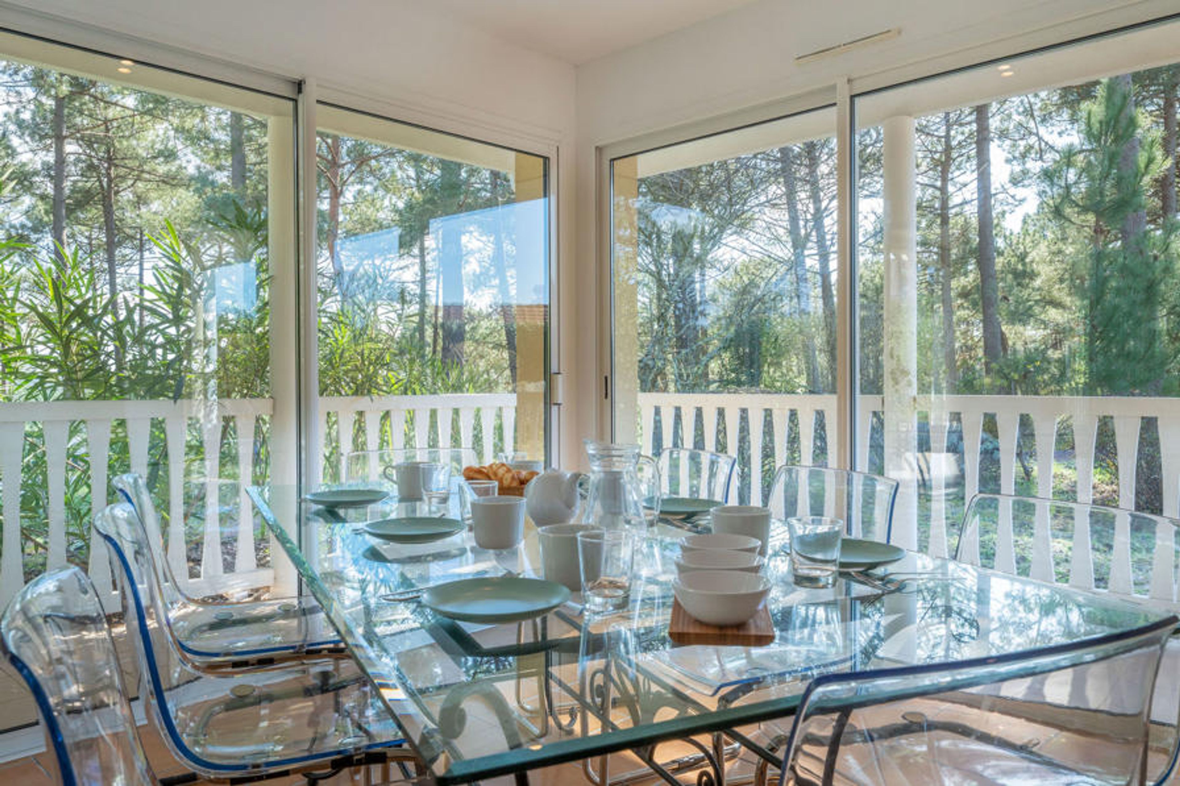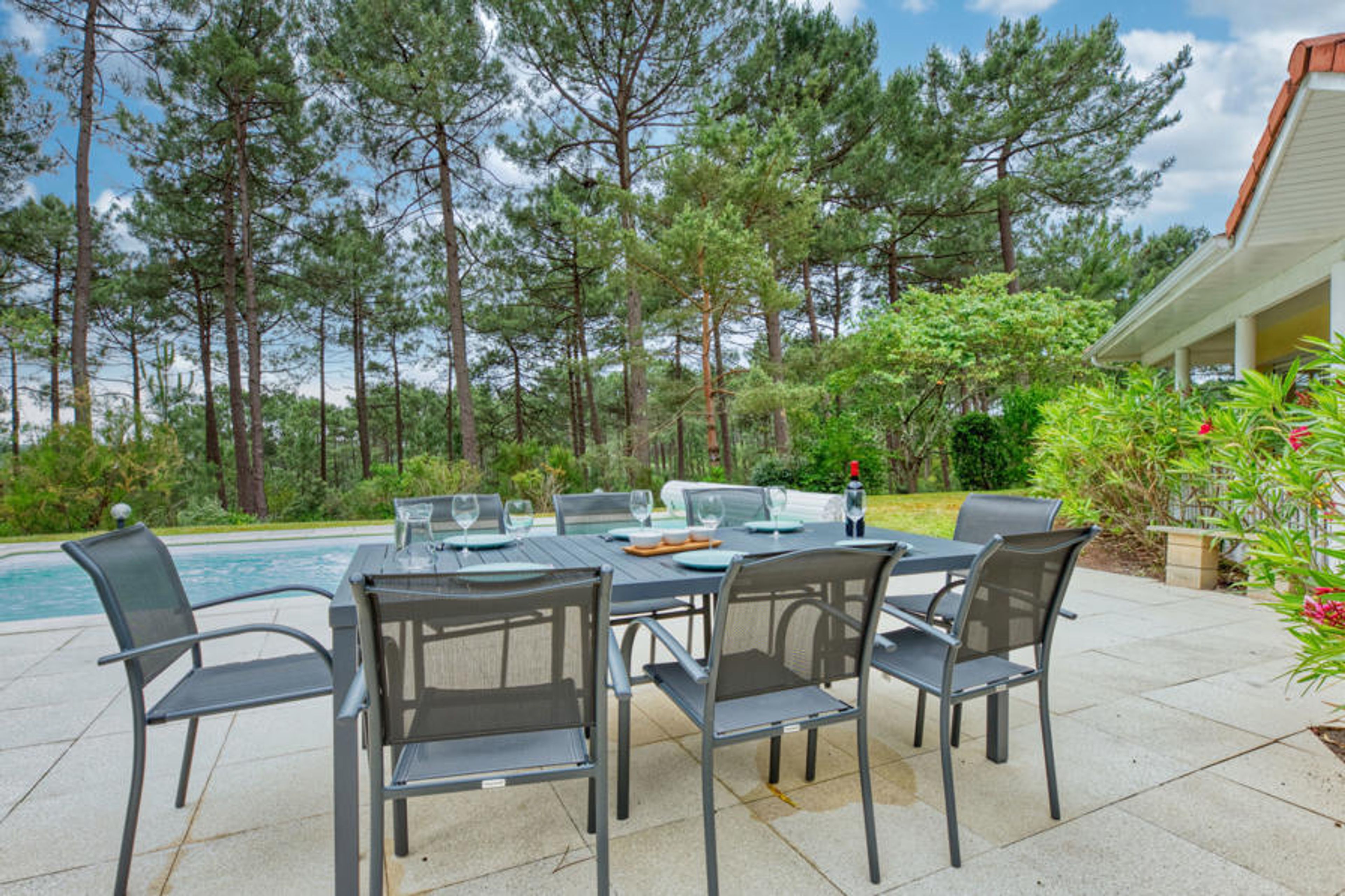 Single-family house "Eden Parc". Outside the resort, 2.5 km from the centre, 3 km from the lake. Private: garden 300 m2 (fenced), swimming pool (8 x 4 m, seasonal availability: 01.Jun. - 30.Sep.) with alarm system. Parking on the premises. Shop 2.5 km, grocery 2.5 km, supermarket 4 km, restaurant 250 m, bus stop "Le Huga" 3.2 km, sandy beach 2.5 km. Golf course (18 hole) 500 m, tennis, indoor tennis centre 750 m, riding stable 15 km. Nearby attractions: Parcours Aventure 1 km, Dune du Pilat 60 km, Bordeaux 60 km, Saint-Emilion 60 km. Well-known lakes can easily be reached: Lac du Moutchic 3 km, Maubuisson 15 km.