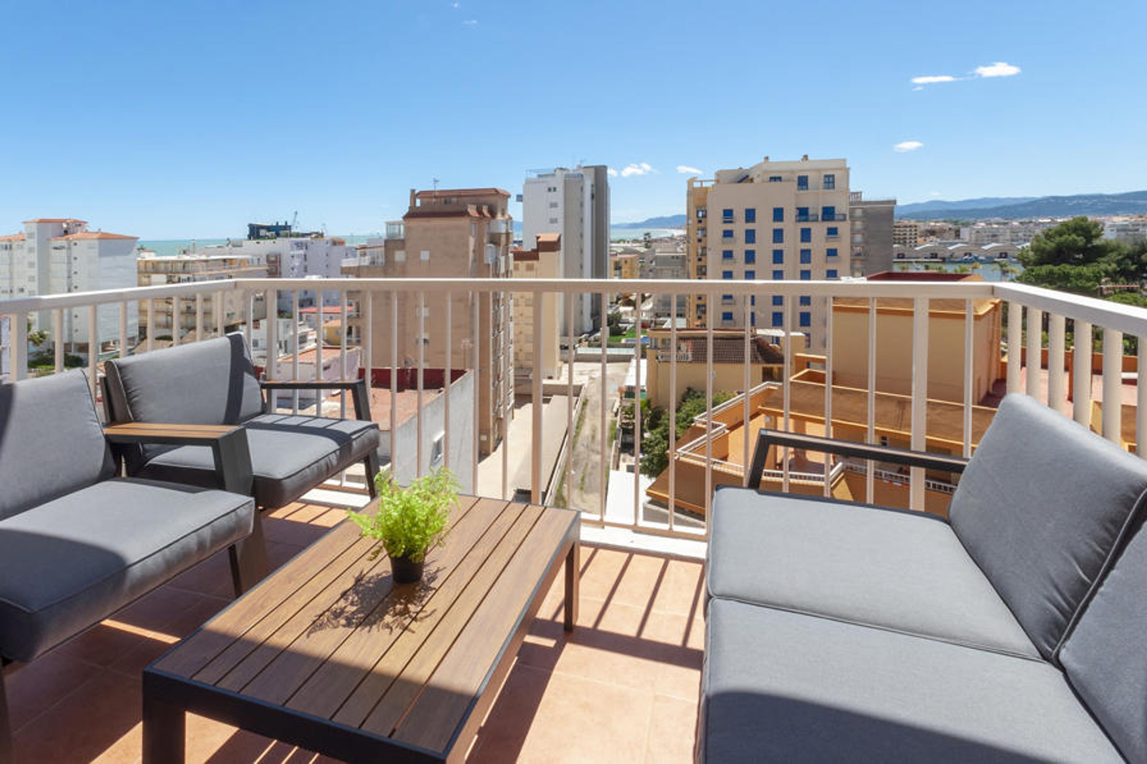 The terrace, next to the living room, is a very important space and we have furnished it with some relax chairs because that is what we came for, to relax in our vacations in Gandia. We also have awnings on the terrace.
