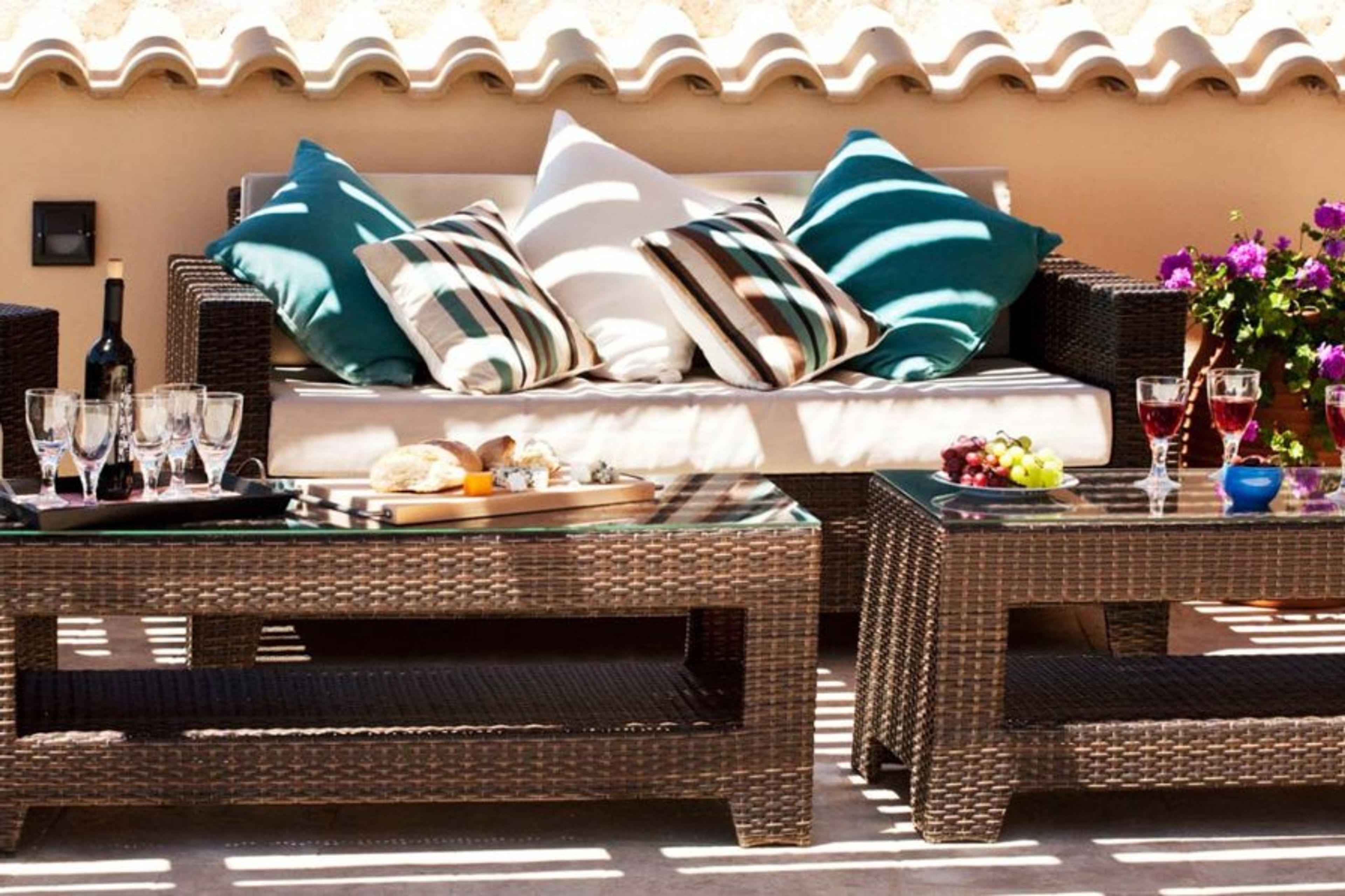 Inside the villa, you will find an open plan living area. A stunning stone arch divides the dining area and living room. The living room is comfortably furnished and well equipped with smart TV, blu-ray player, bluetooth speaker and playstation 4 with games. A library of DVDs is available for guests to use. In addition, there is a collection of books and a games cupboard with a good selection of board games. Wi Fi is available. The kitchen area is very well equipped with everything required for self catering. Steps lead down from the living area to the four bedrooms and ensuites. Each bedroom has access to a balcony or terrace via sliding doors. There are large built in wardrobes providing generous storage space.