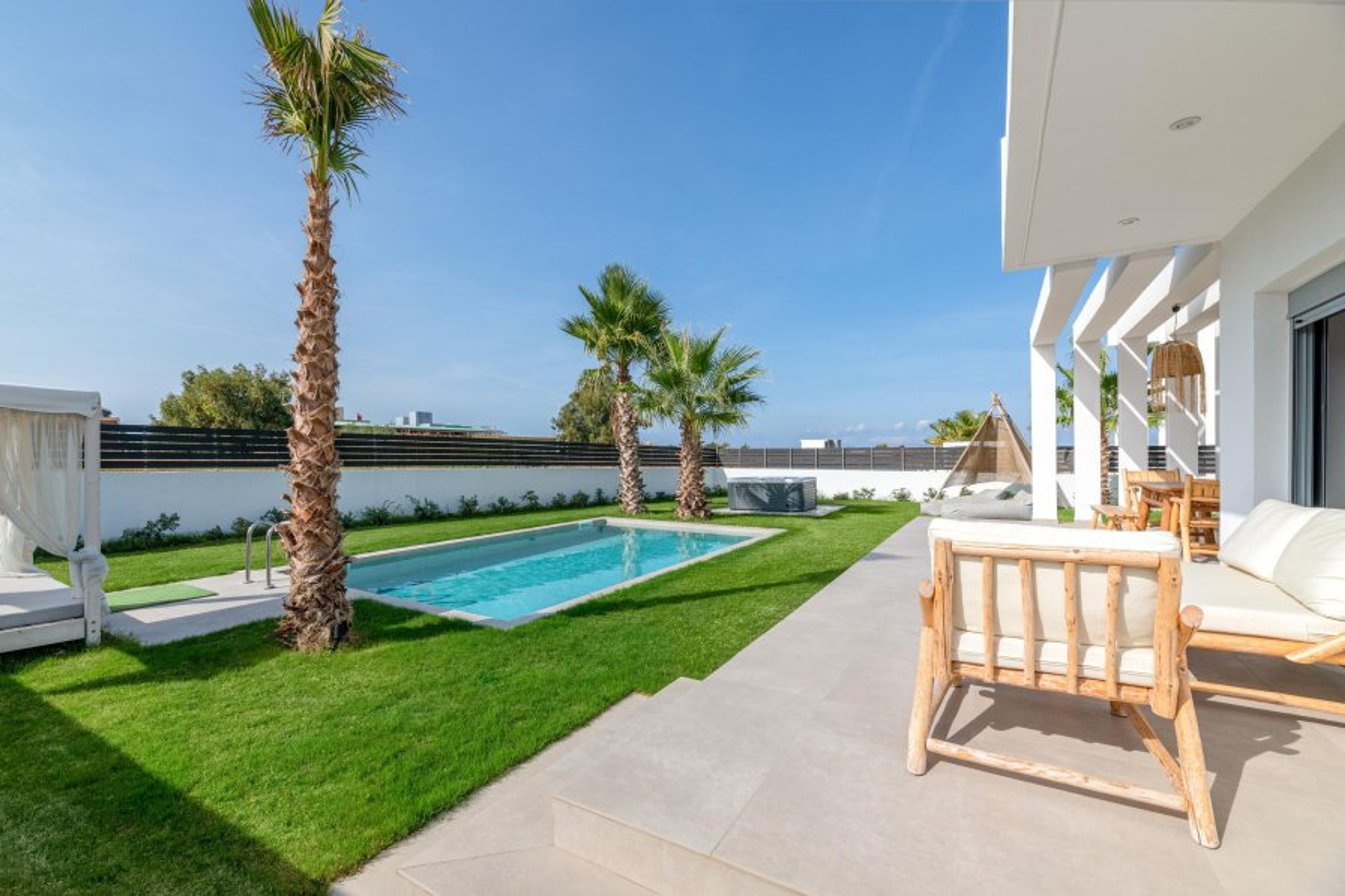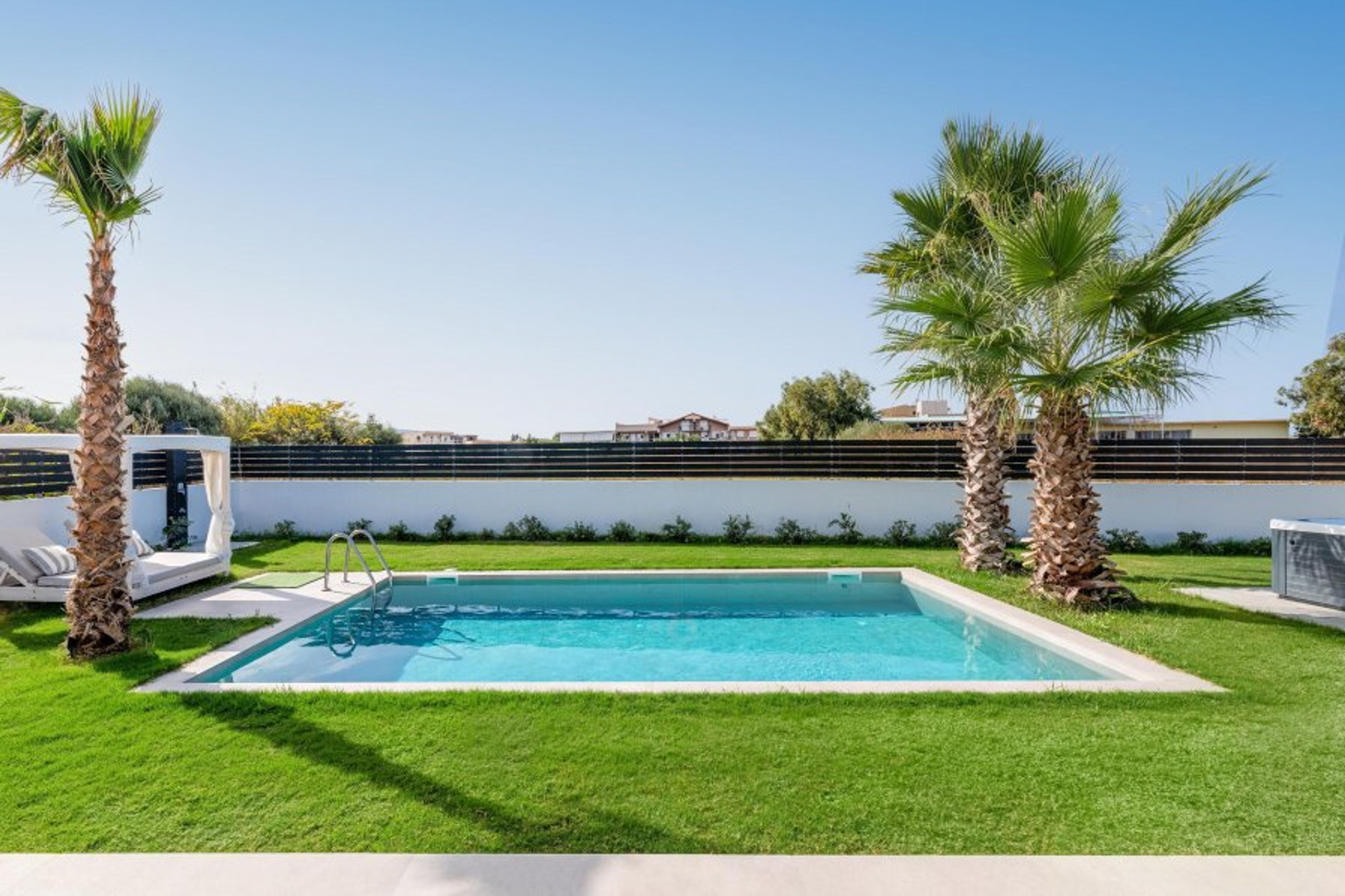 This stunning villa has 3 amazing fully airconditioned bedrooms with double beds. We offer you a complimentary cleaning service every seven days to save you precious time in Rhodes, so that you will enjoy your carefree holidays to the fullest. All bedrooms offer balconies and smart TVs. Two of the bedrooms offer ensuite bathrooms with showers. Also, there’s a wc. Guests will find a fully equipped kitchen, suitable for any meal preparation. Also, there is an amazing dining area to enjoy your meal as well as a living room with a smart TV. There’s free Wi-Fi access throughout the property. Outdoors, there is an incredible yard with a private swimming pool and a heated jacuzzi. Also, there’s an outdoor dining area to enjoy a gathering with your loved ones. The design of this villa is a careful balance of style, comfort, and functionality, with thoughtful touches and elegant details that contribute to a luxurious and memorable vacation experience.