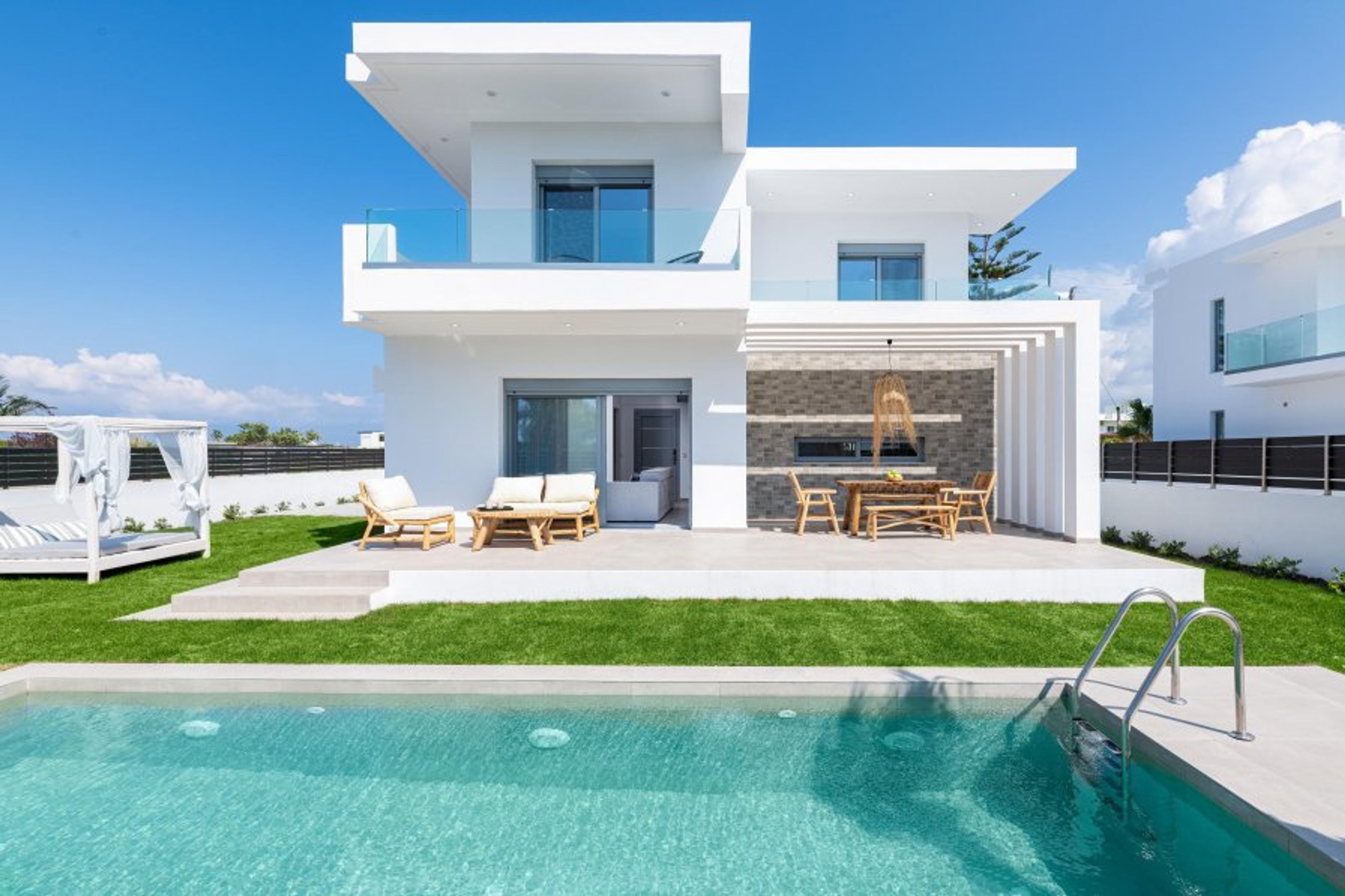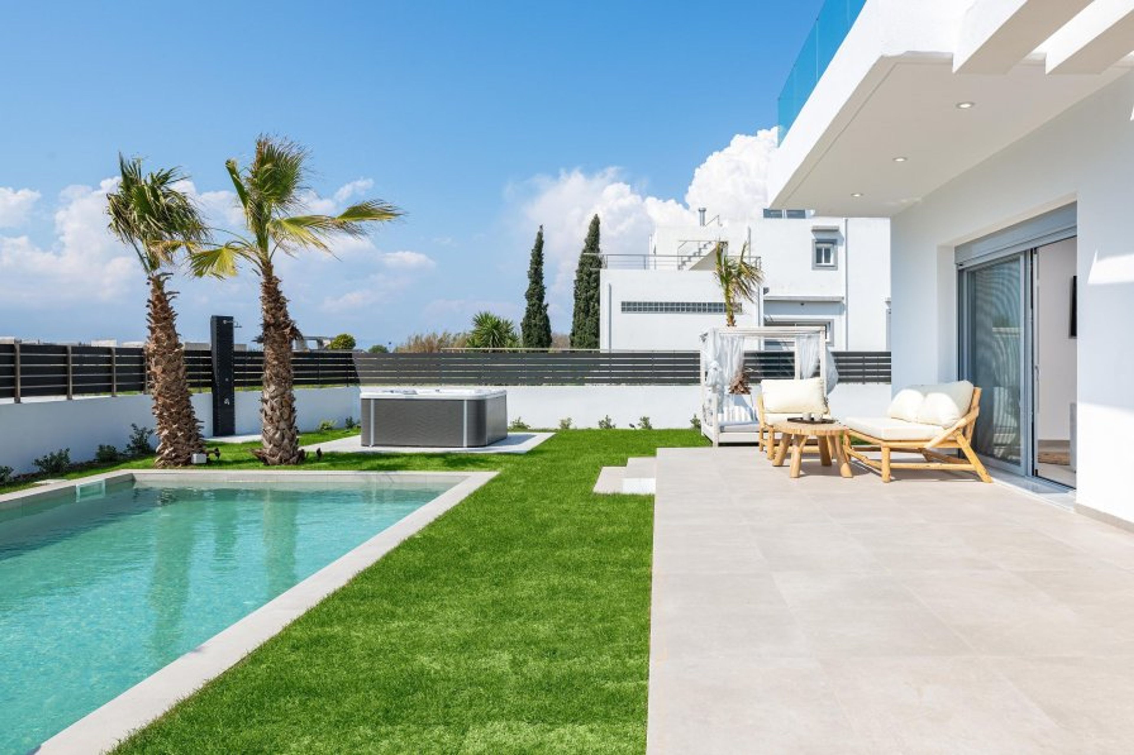 This stunning villa has 3 amazing fully airconditioned bedrooms with double beds. We offer you a complimentary cleaning service every seven days to save you precious time in Rhodes, so that you will enjoy your carefree holidays to the fullest. All bedrooms offer balconies and smart TVs. Two of the bedrooms offer ensuite bathrooms with showers. Also, there’s a wc. Guests will find a fully equipped kitchen, suitable for any meal preparation. Also, there is an amazing dining area to enjoy your meal as well as a living room with a smart TV. There’s free Wi-Fi access throughout the property. Outdoors, there is an incredible yard with a private swimming pool and a heated jacuzzi. Also, there’s an outdoor dining area to enjoy a gathering with your loved ones. The design of this villa is a careful balance of style, comfort, and functionality, with thoughtful touches and elegant details that contribute to a luxurious and memorable vacation experience.
