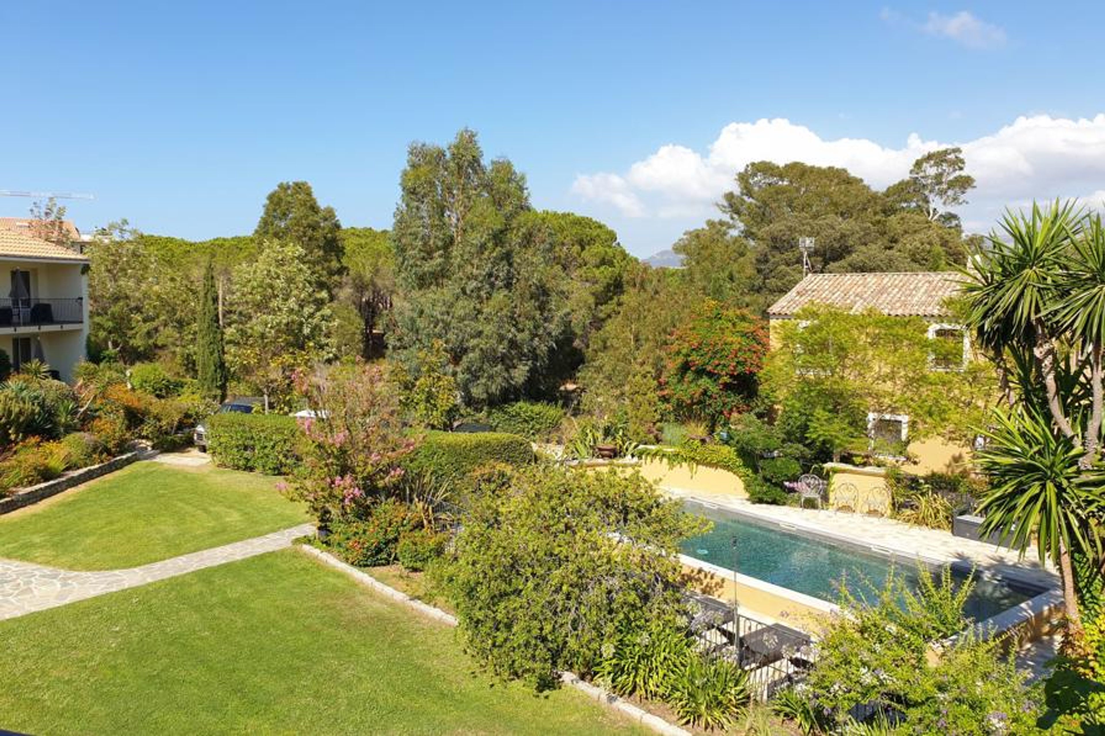 Very beautiful resort "Le Home", 3 storeys. 41 apartments in the residence. 1 km from the centre of Calvi, 23 km from the centre of L´Ile Rousse, 92 km from the centre of Bastia, in the residential district, 400 m from the sea, 400 m from the beach. For shared use: property 7'000 m2 (fenced), park with lawn and trees, beautiful garden to relax, 2 swimming pools (9 x 4 m, seasonal availability: 01.Apr. - 31.Oct.). Outdoor shower, terrace. In the complex: reception, WiFi, washing machine (for shared use). Parking on the premises. E-charging station. Supermarket 400 m, bus stop 500 m, railway station 400 m, sandy beach 300 m. Please note: car-free holiday complex, car recommended. Not suitable for children under 18 years. The photograph shows a typical example.