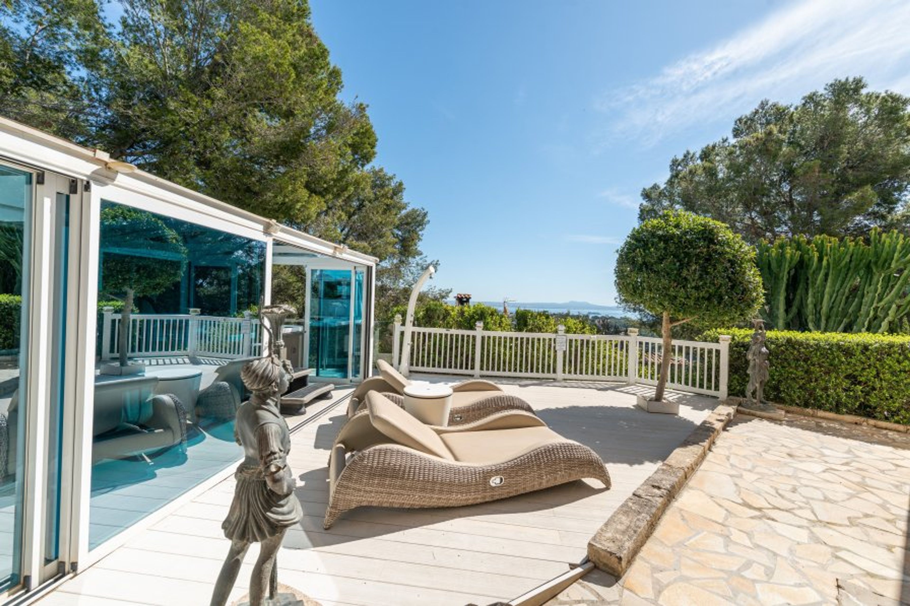 Outside you can take a refreshing dip in the private saltwater swimming pool with views of the Mediterranean Sea in the background. The pool measures 9 x 4 metres and has a depth of 1.50 to 3.50 metres. Next to it, the bar area is perfect for an aperitif after a swim. In addition, the property has billiards, sauna, gym and children's play area, for an entertaining afternoon after spending the morning at the beach. In the evening, the best plan is to cook a delicious barbecue and enjoy it under the porch next to the house. The property is fenced and there are neighbours nearby.
