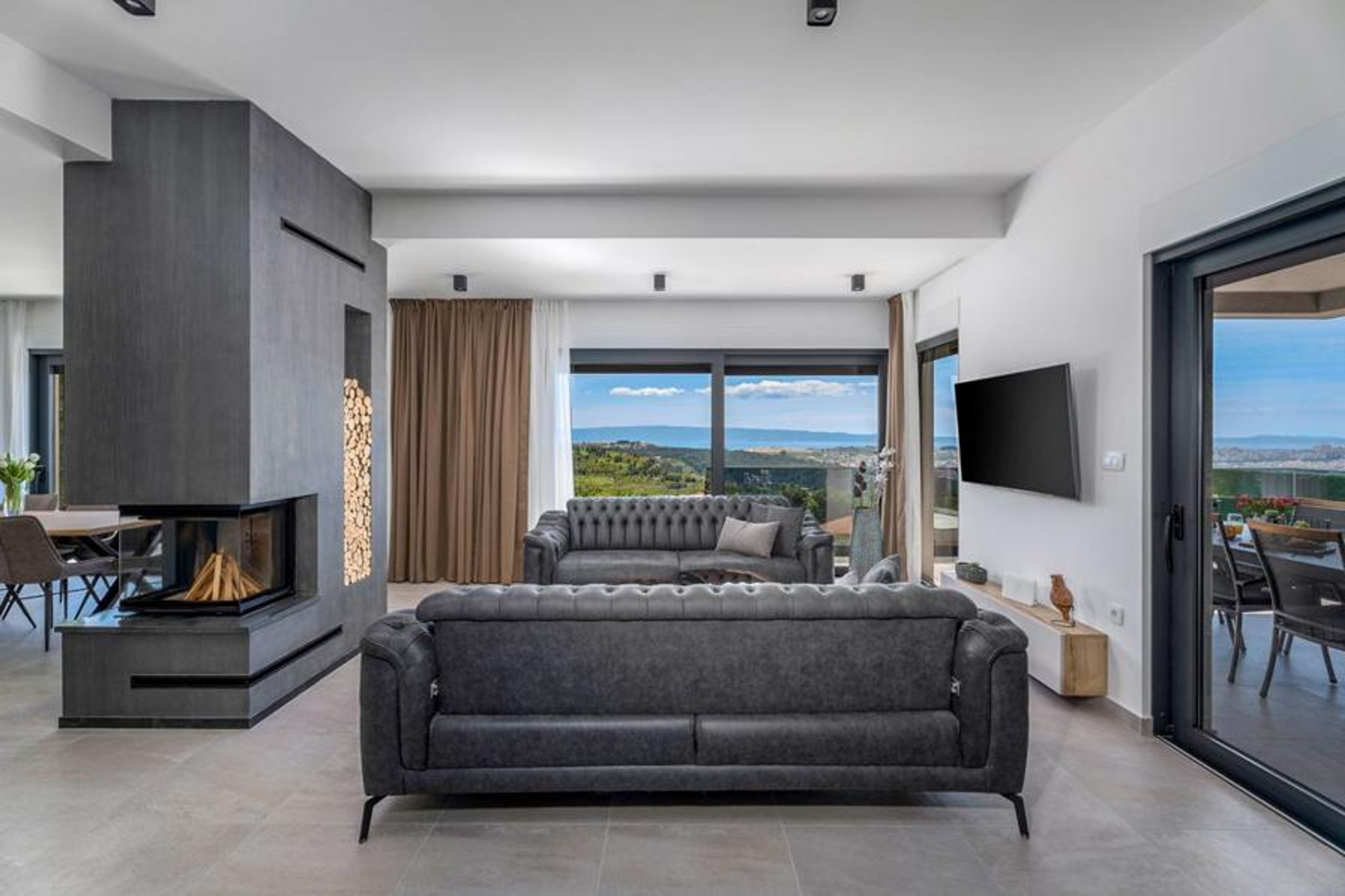 Plenty of natural light flows into the stylish, open-plan living space on Villa Flo’s ground floor, which features an inviting lounge area with two sumptuous sofas, a flat-screen TV and a modern fireplace. The lounge seamlessly leads into the villa’s charming dining area, where everyone can discuss the day’s adventures over a home-cooked meal, accompanied by dazzling Split and the ocean views. The bespoke kitchen is fully equipped with modern appliances and an island with additional seating. The villa’s ground floor also features a double bedroom with a king-size bed, a flat-screen TV and mountain vistas. Next to the bedroom is a well-appointed family bathroom with a walk-in shower and double vanity basins.