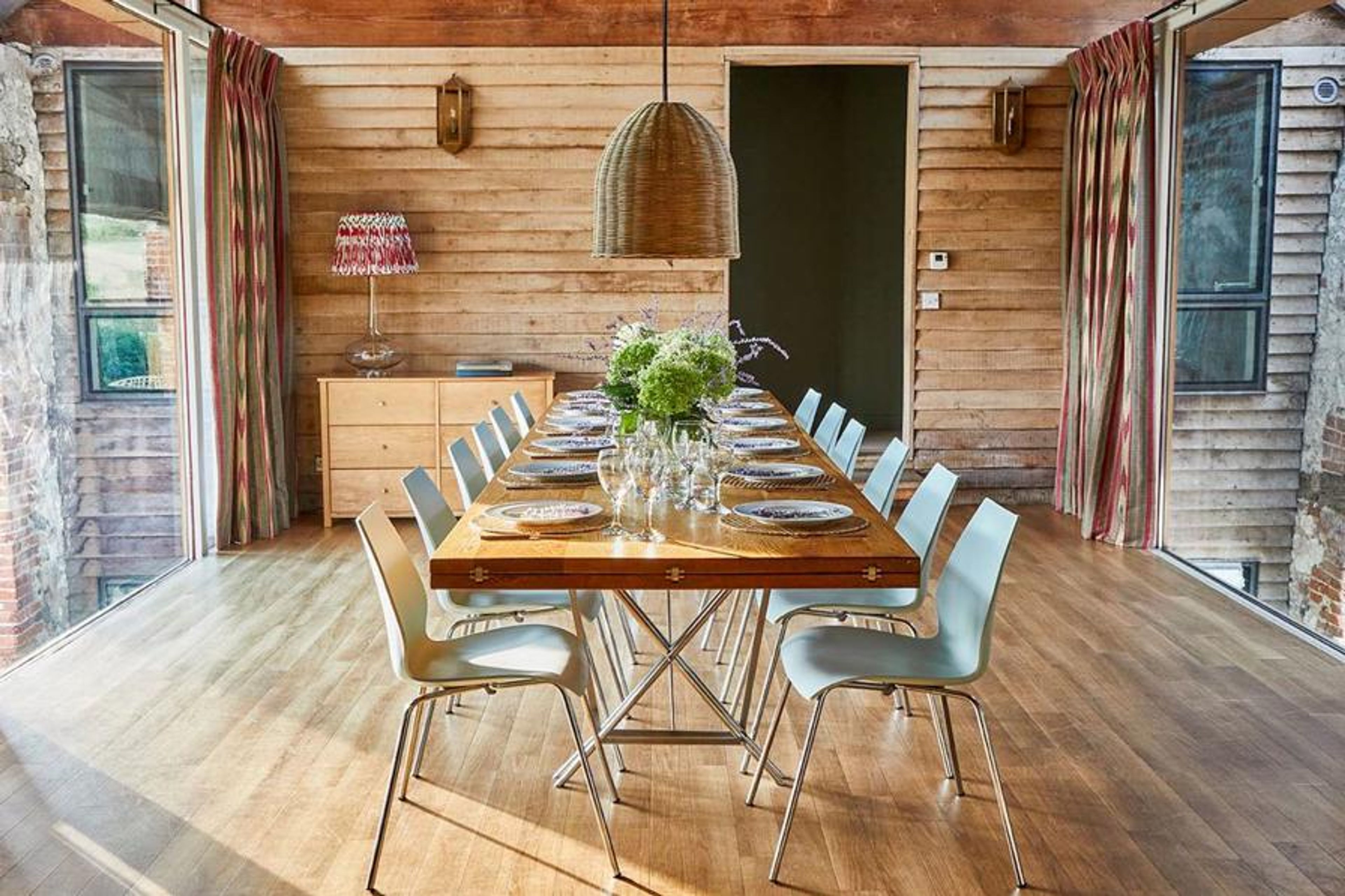 The barn features a fully-equipped, open-plan kitchen, allowing you to prepare delicious meals with ease. The spacious oak dining table comfortably seats up to 22 guests, providing a wonderful setting for shared meals and celebrations. After dinner, unwind in one of the two separate living rooms, where you can relax by the cozy wood burner (logs are provided) or enjoy your favorite shows on the TV with Freeview and DVD player.