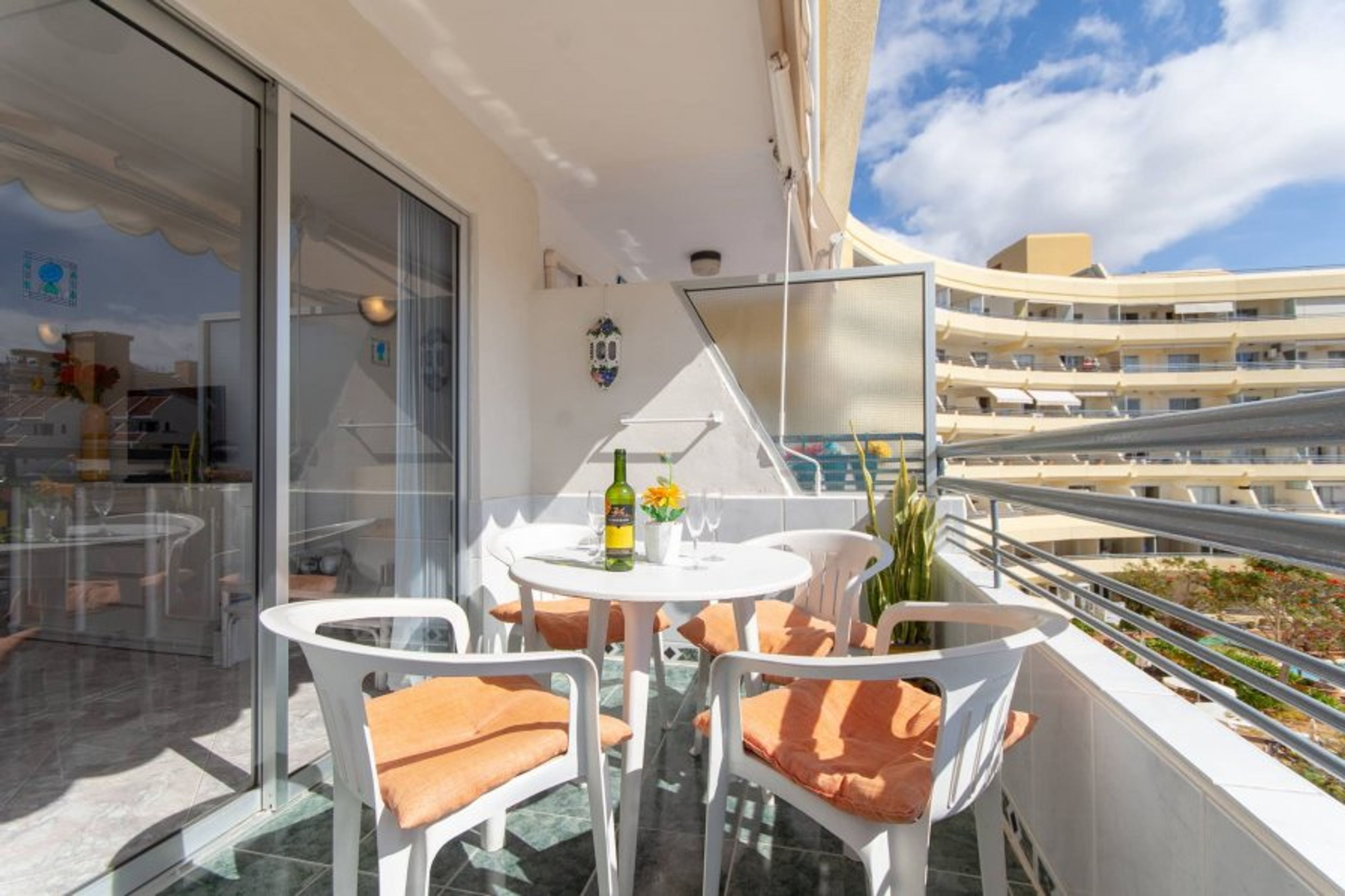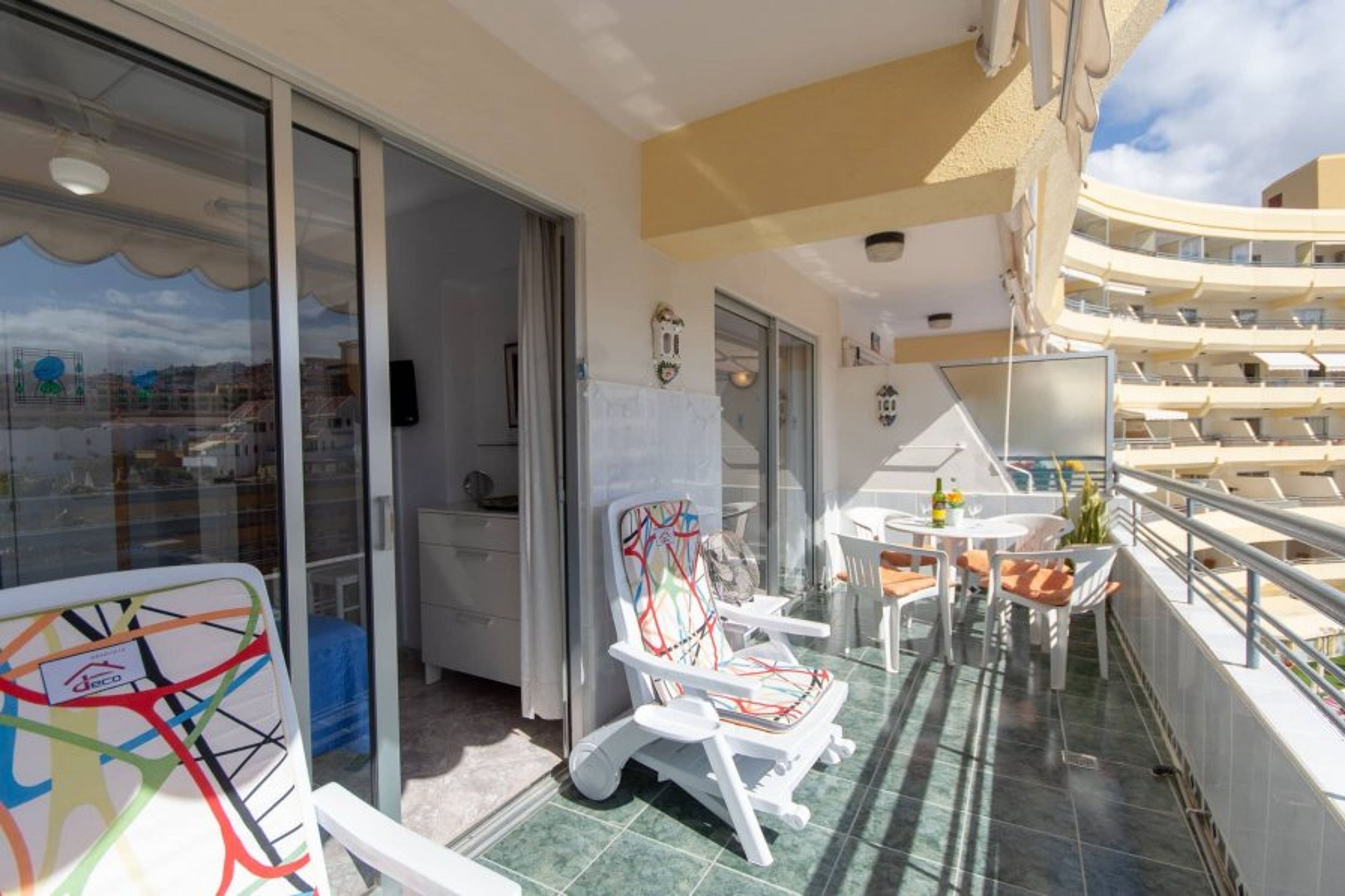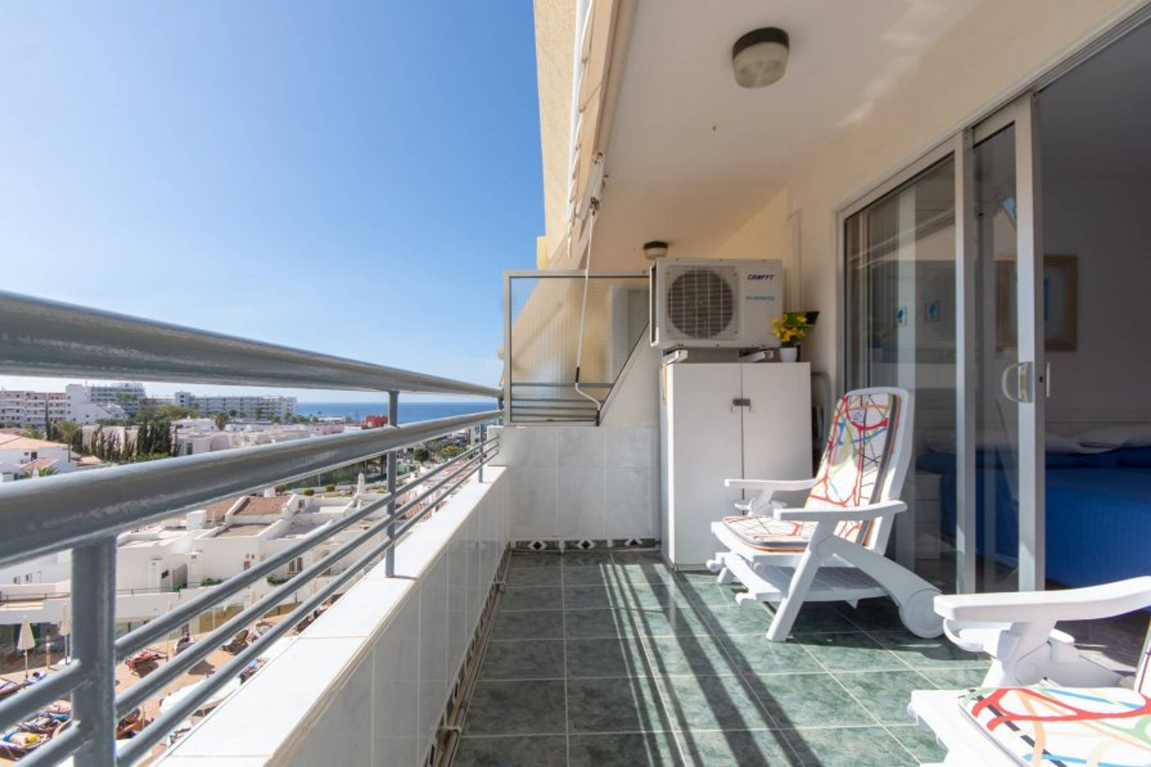 Charming 1-bed apartment on the 3rd floor of Santa Maria complex, Tenerife. Double balcony with stunning sea and pool views. Includes wifi, air conditioning, and washing machine for a comfortable stay
