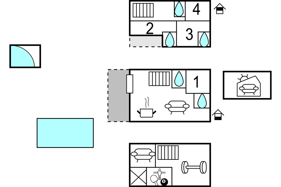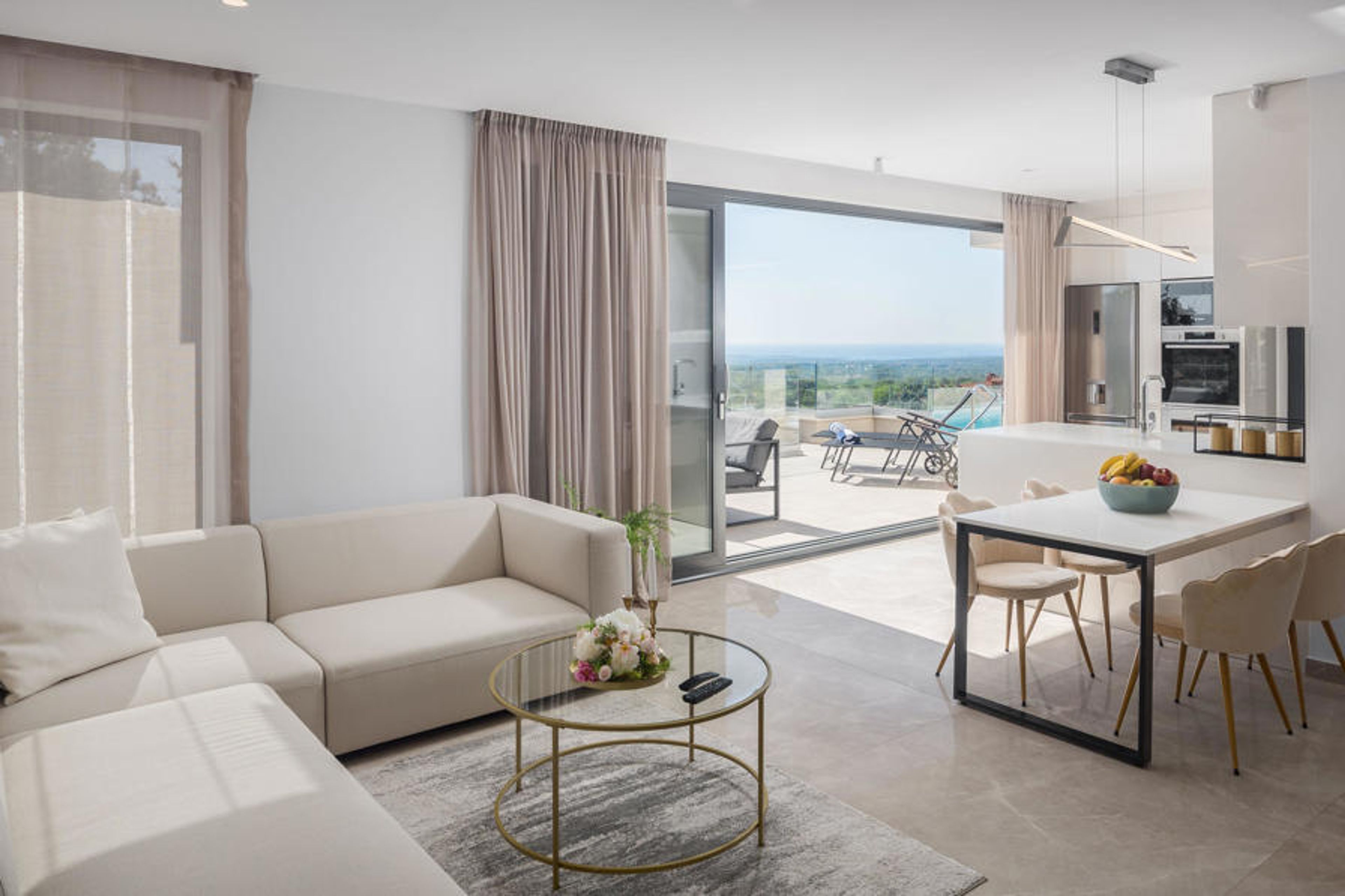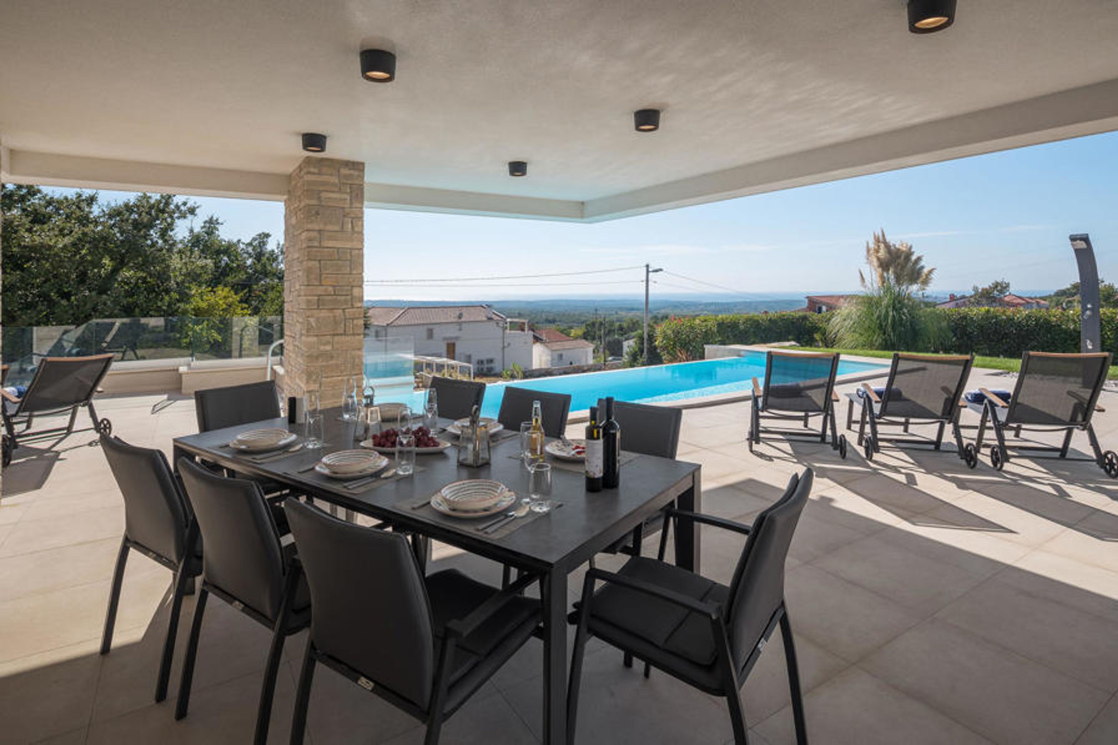 Enter this modern and bright house that promises you high quality and wonderful comfort. The house promises you a lot of space spread over three floors and offers you a great deal. Enjoy your time out from everyday life in the sauna or play darts or table tennis with your loved ones. Besides the sweet living inside, the terraces and the garden invite you to stay. Swim in the pool or relax in the jacuzzi and look over the countryside to the Adriatic Sea.