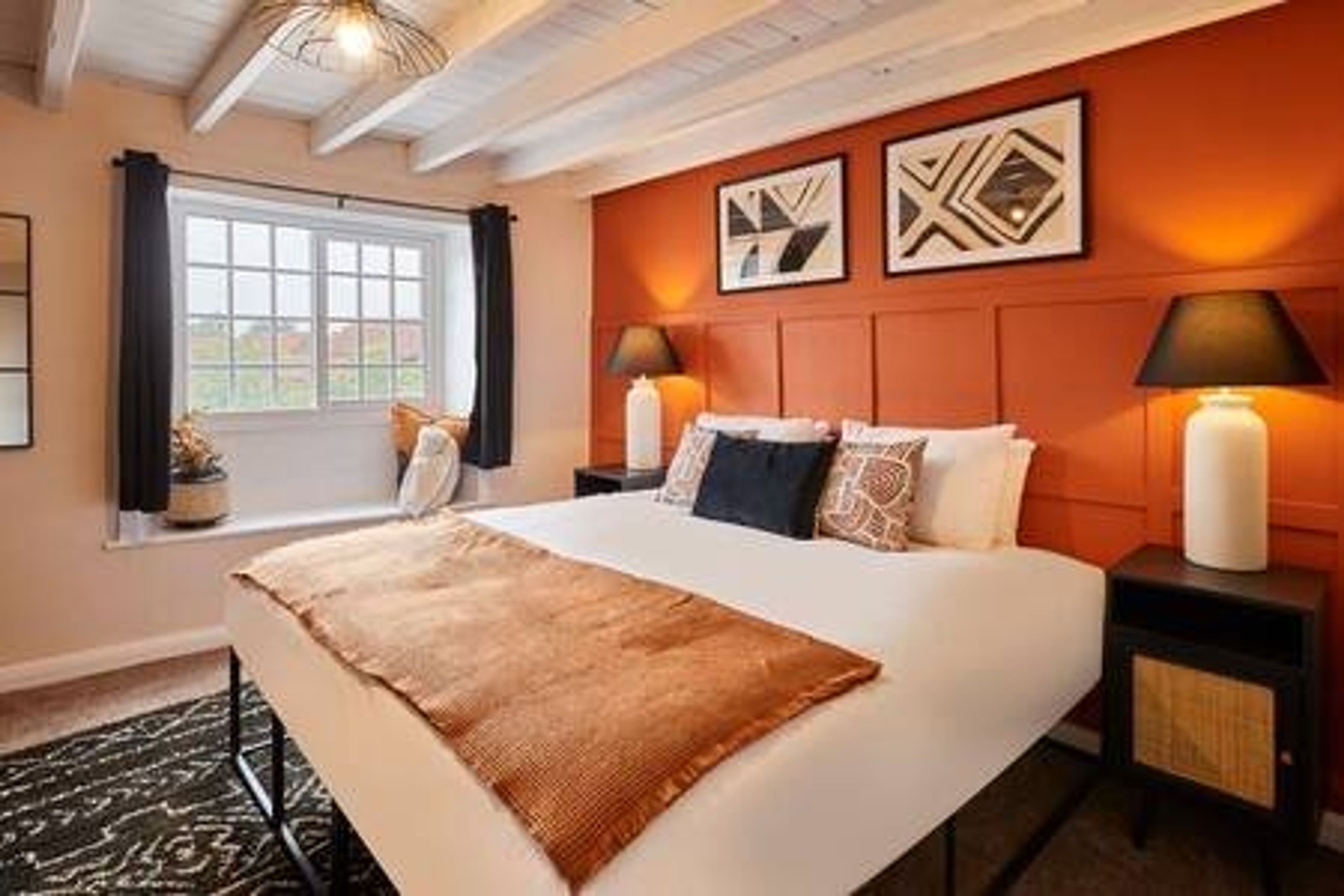 The first bedroom is a relaxing oasis. The room has been styled with black wooden bedside tables to perfectly compliment the colouring used on the king size bed. There is original wooden beaming running along the ceiling and a traditional cottage window.