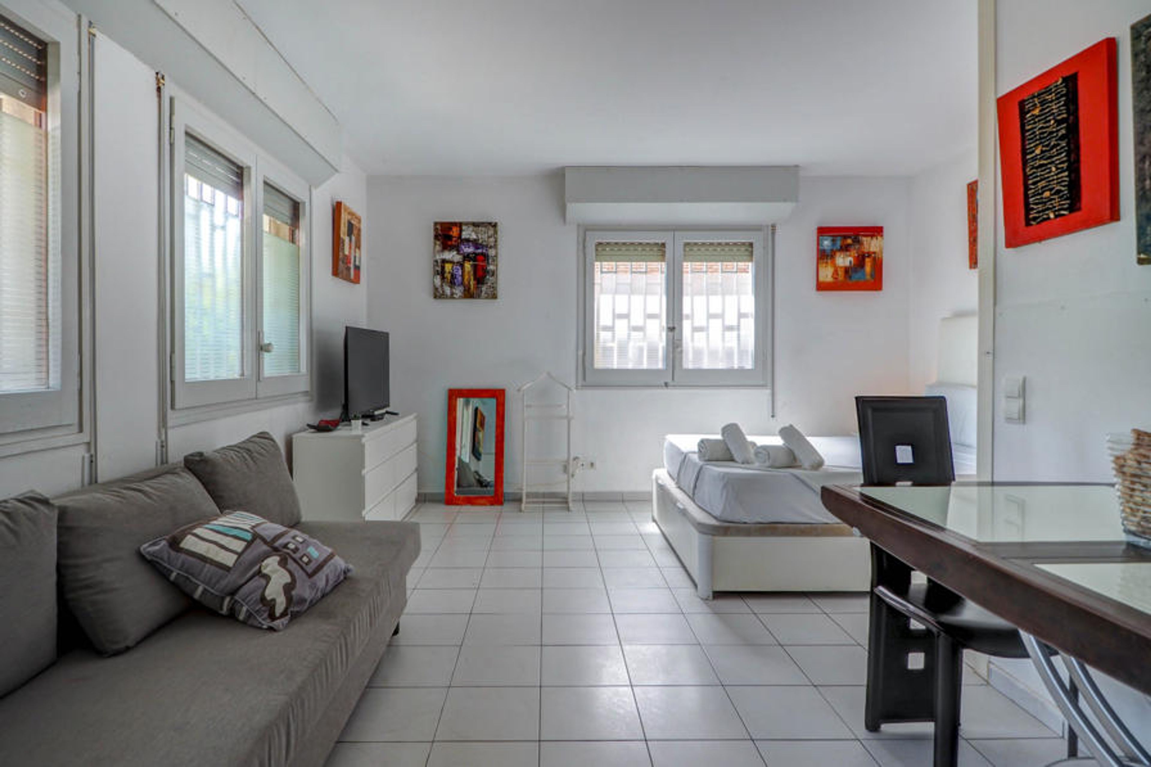 The rest of the studio has a table with chairs, a sofa and a flat-screen TV. The bed is a double bed, it has large wardrobes and a window with access to the main courtyard of the building.