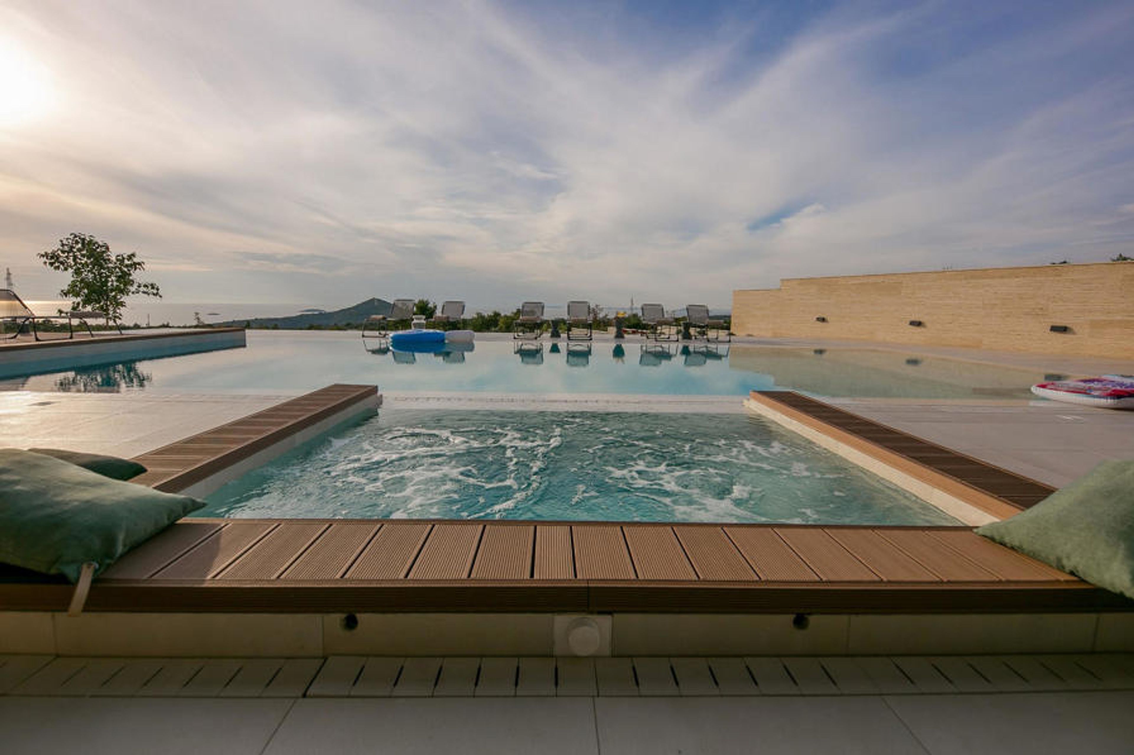 The large outdoor pool with adjoining whirlpool and cosy sun loungers as well as a covered barbecue area promise you relaxing hours under the Dalmatian sun. You can look forward to relaxing and socialising with a wonderful panoramic view of the sea. A garden TV even promises you film evenings in the open air.