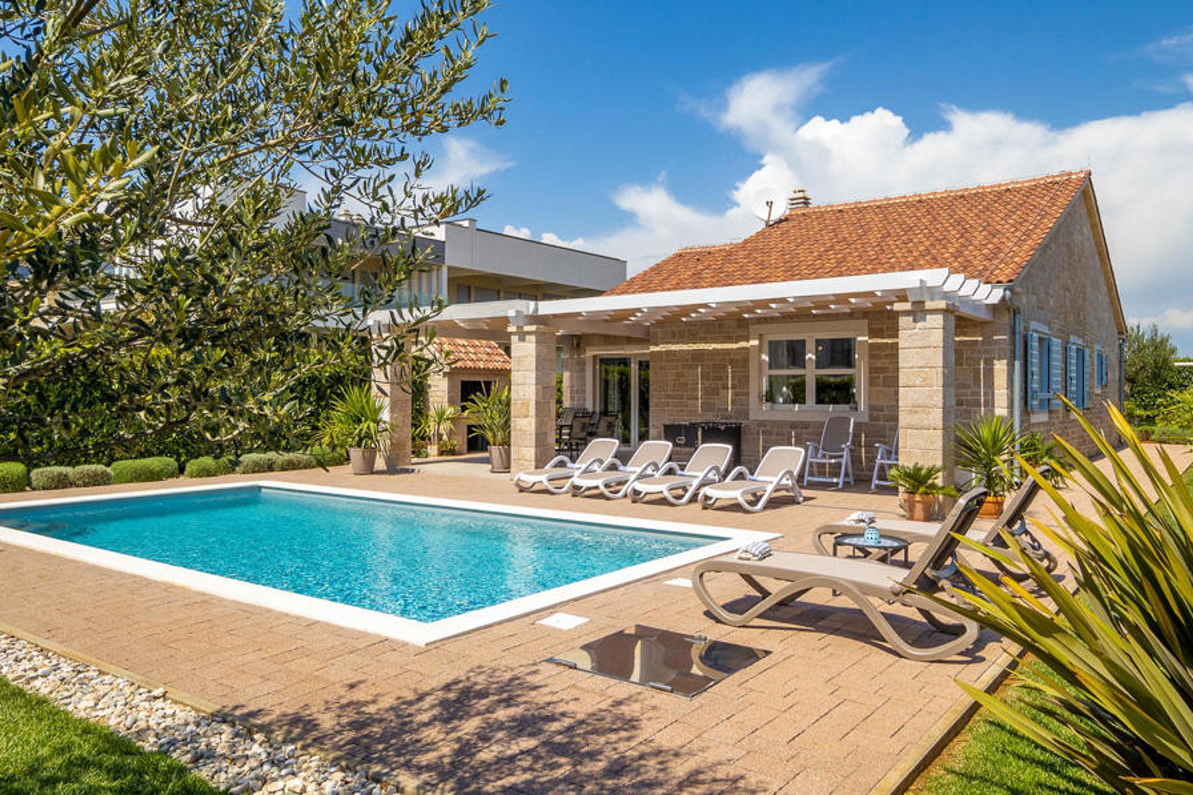 On the spacious terrace, surrounded by green lawns, there is a large, heated pool where you can enjoy the long hours of Dalmatian sunshine to the full. Fire up the barbecue and chat into the balmy summer nights with wine and candlelight on the inviting terrace.