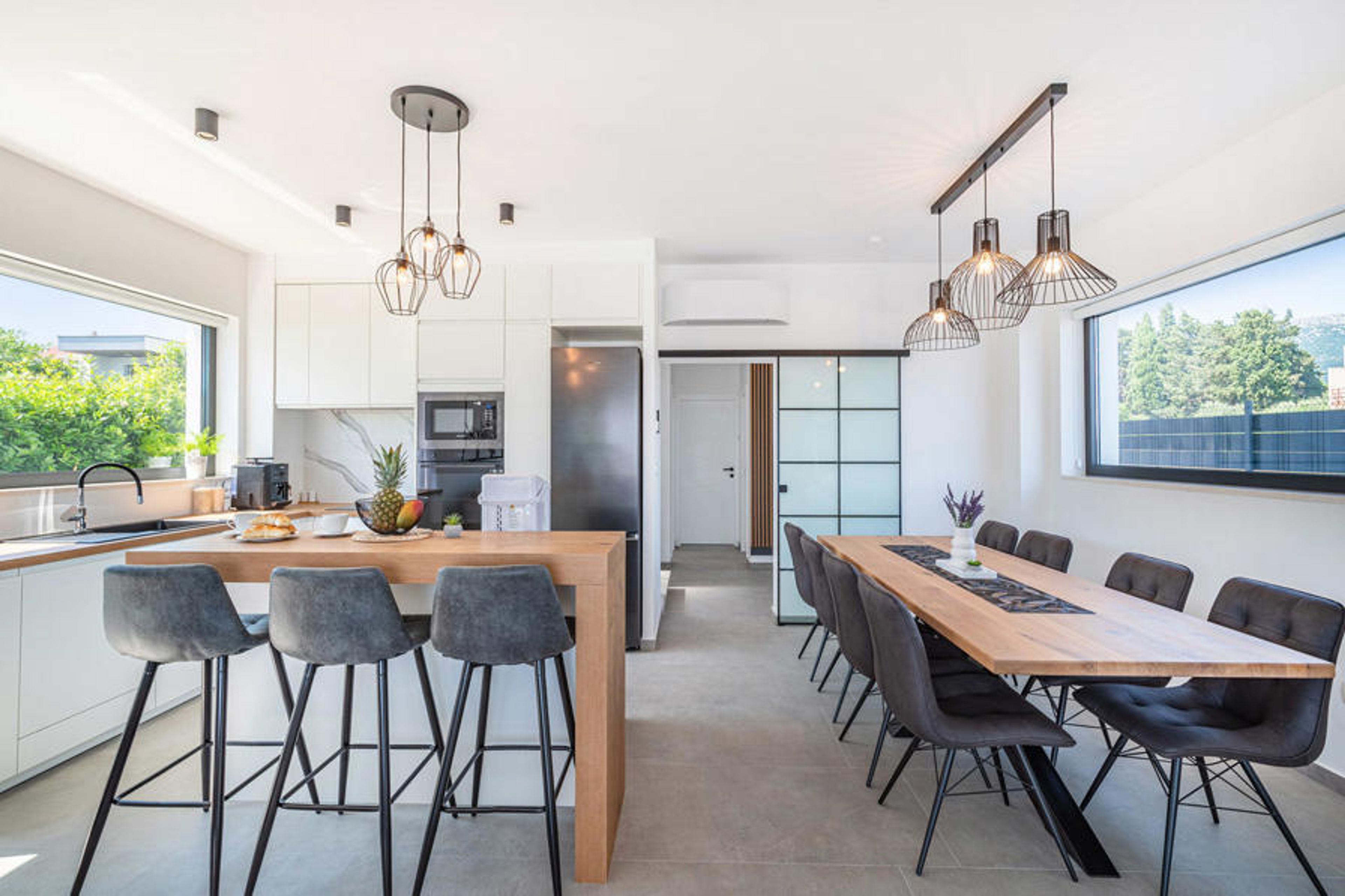 During their stay, the guests have access to the ground floor and the upper floor where they will be comfortably accommodated in 4 bedrooms, three of which have a double bed, and one has two single beds. The villa has 4 ensuite bathrooms with a shower cabin, and another ordinary bathroom, which also contains a shower cabin. You will relax on the corner sofa in the comfortable living room, where there is a TV and a coffee table. Near the living room there is a modern equipped kitchen with a bar and 3 bar stools, which contains everything you need to prepare your favourite meals for the whole family during your stay, and there is also a dining room with a dining table for 8 people.