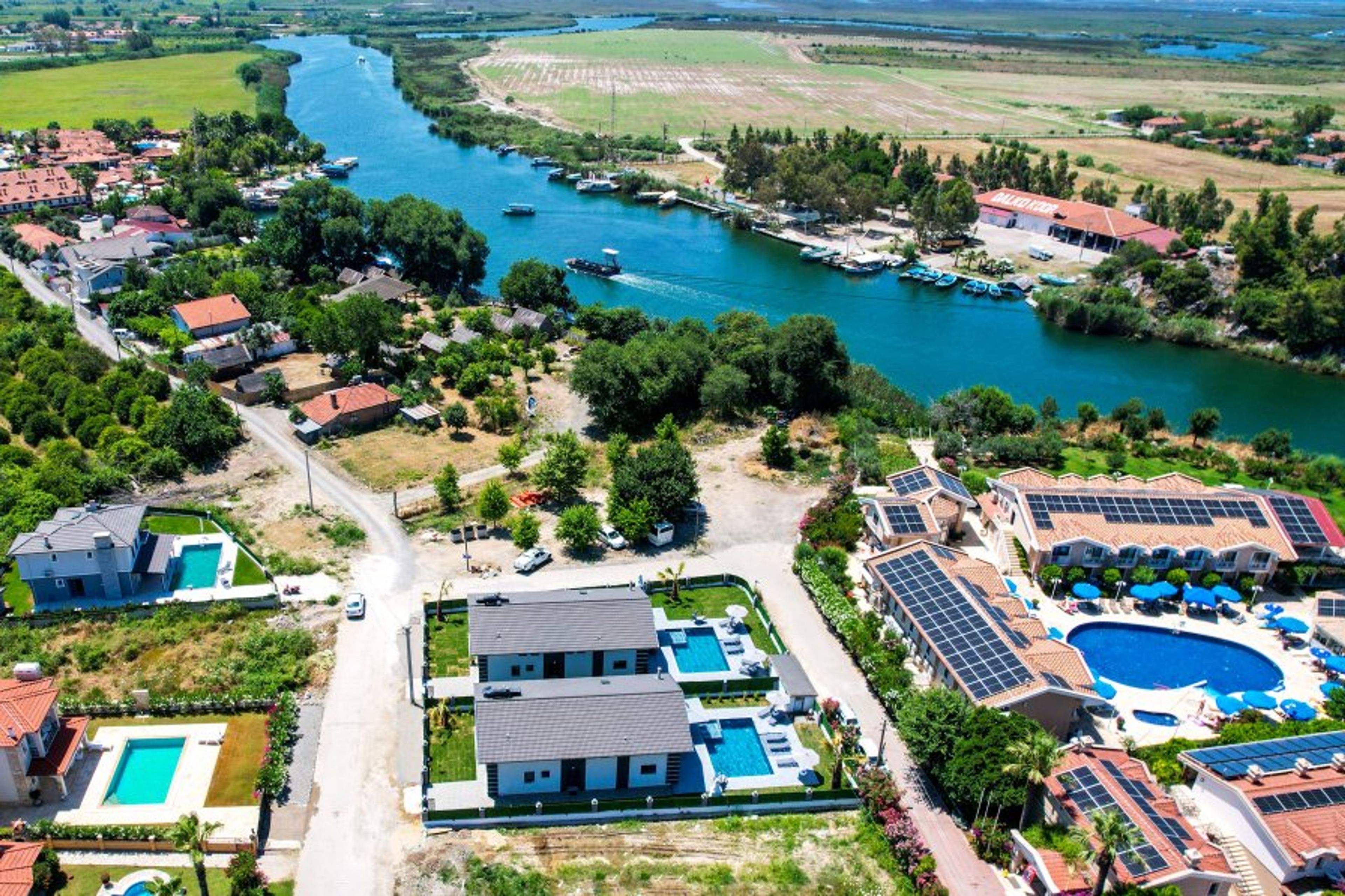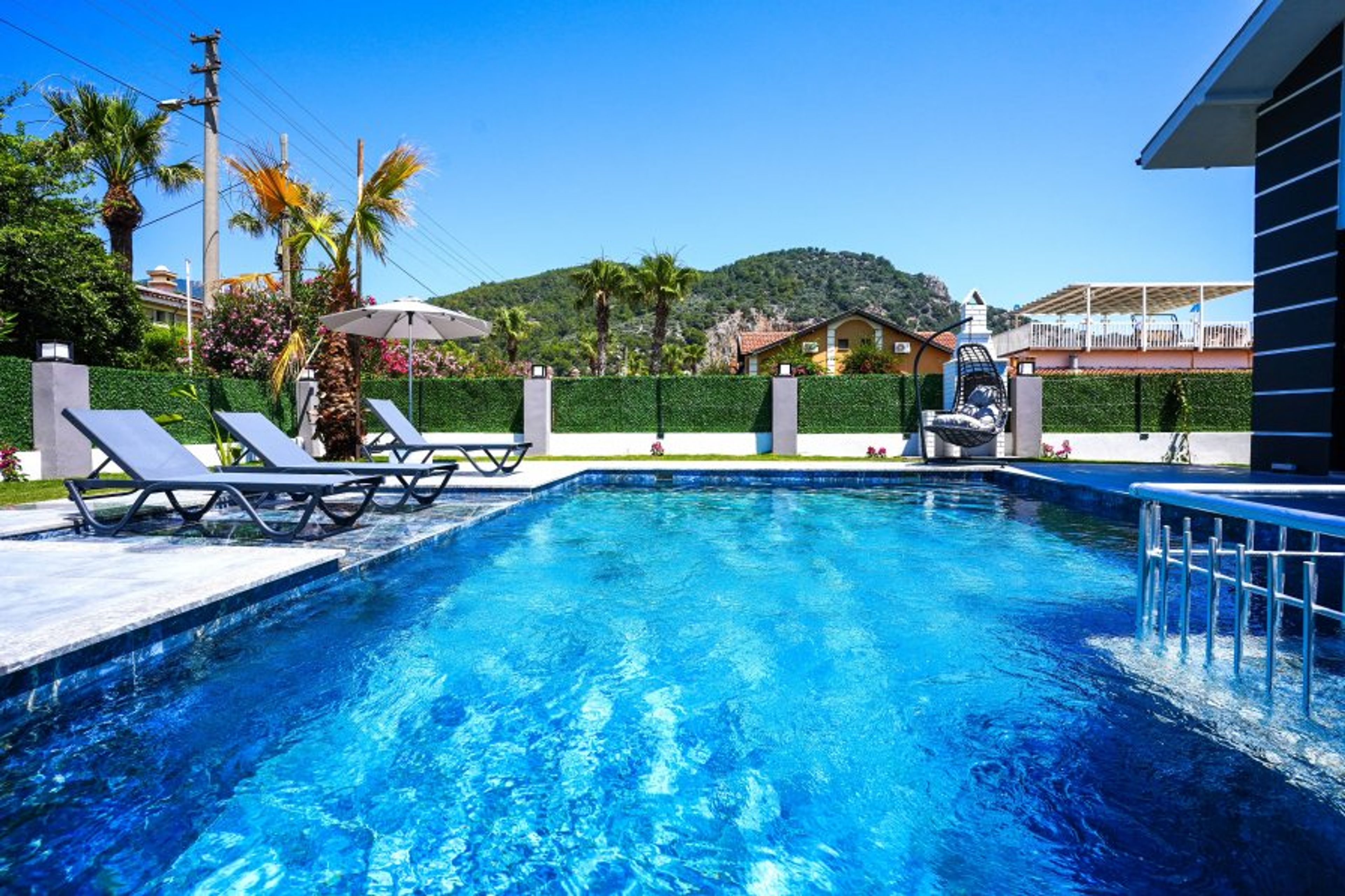 Modernly furnished holiday villa with private pool and garden, in a unique location 50 meters from Dalyan canal. The brand new villa with a magnificent sunset view in nature, 5-10 minutes walking distance from the center, was put into service in July 2023. An ideal villa for large families and groups of friends.