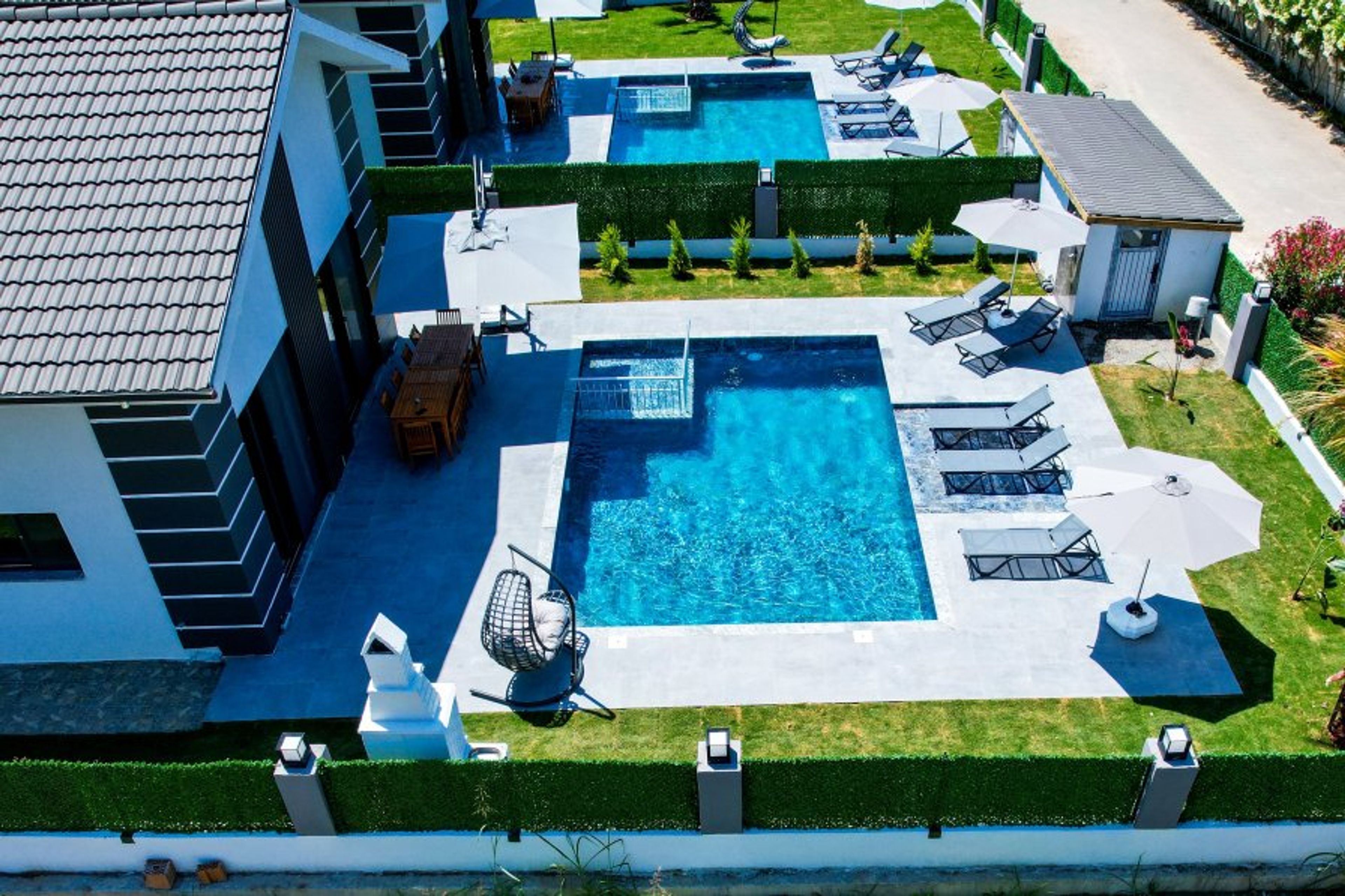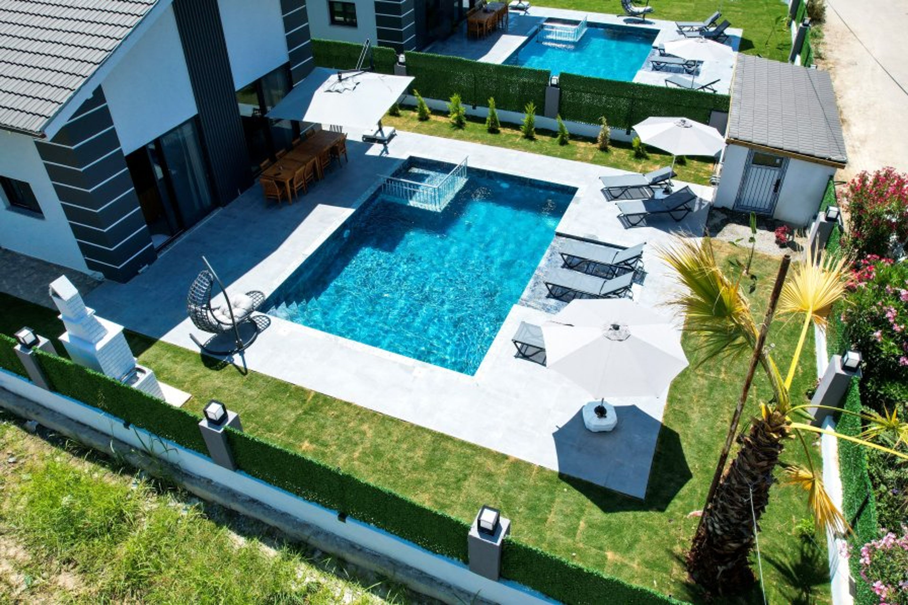 Our villa, which has a children's pool, has a capacity of 10 people and has 5 bedrooms and 5 bathrooms. The first four bedrooms have a double bed, en-suite bathrooms and air conditioning, while the fifth bedroom has two single beds, an en-suite bathroom and air conditioning. There is a common toilet, air conditioner and TV in our villa. There are 2 living rooms, one of which is small. There is a TV in 2 living rooms.