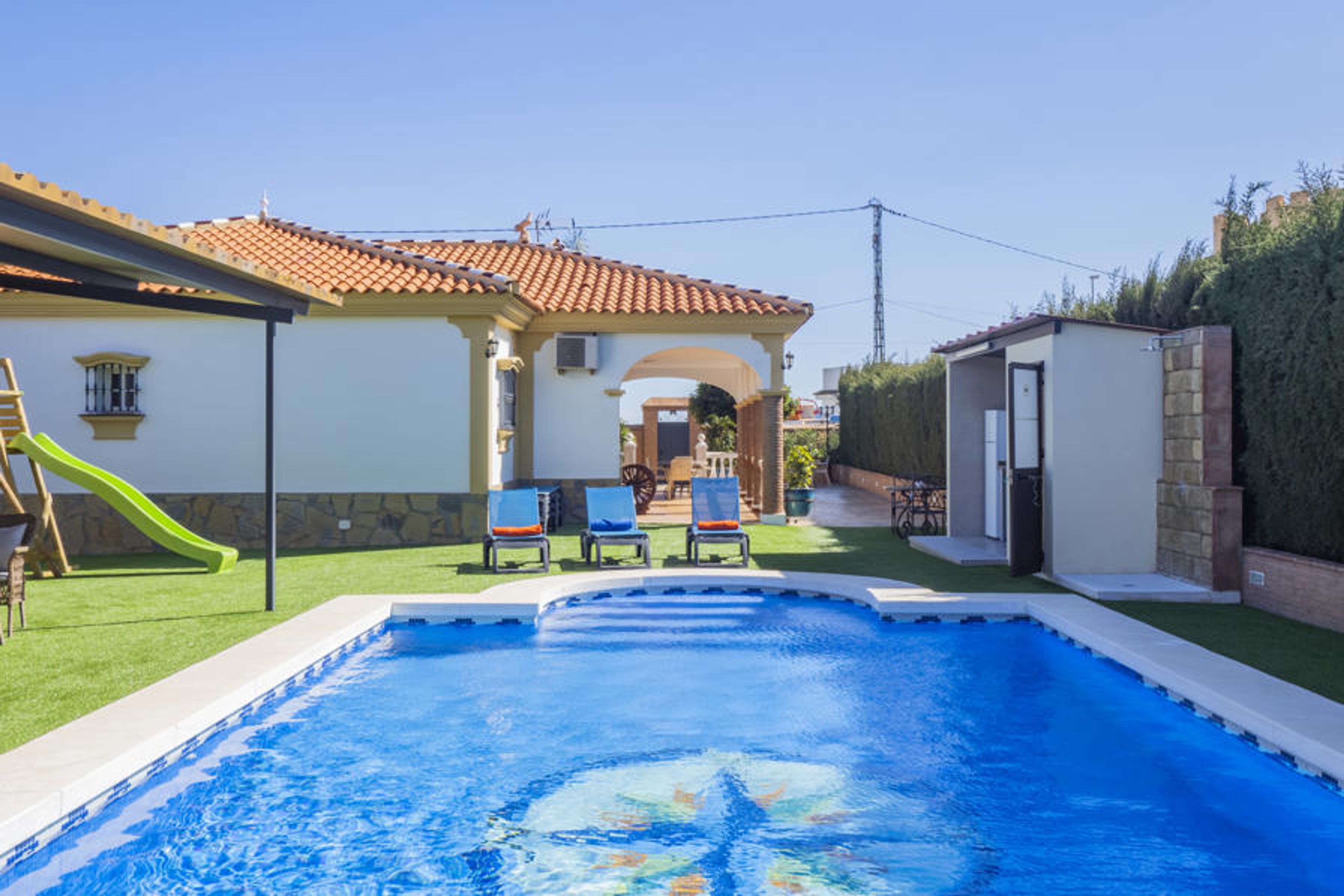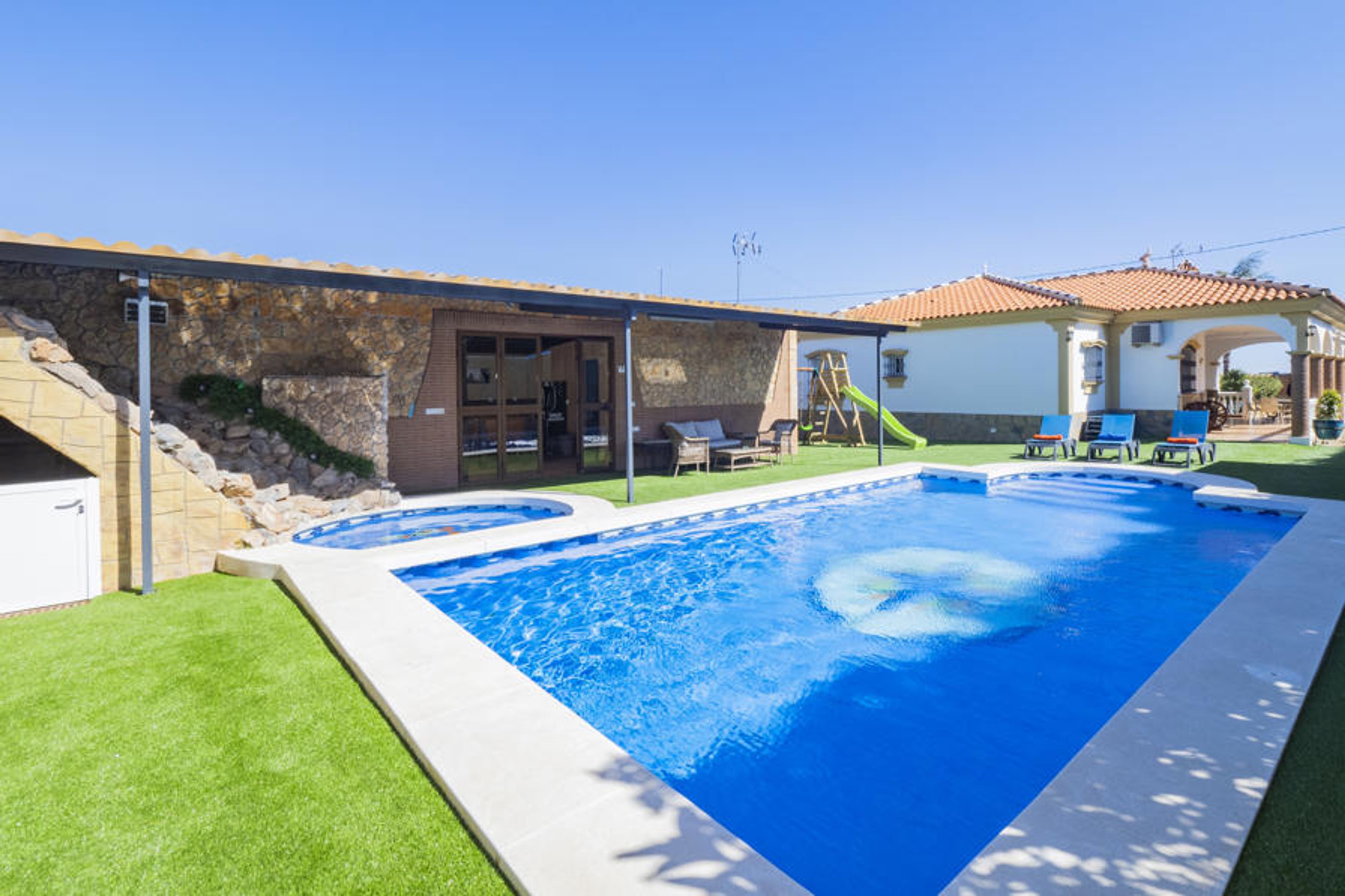 Enjoy this spacious rural house in Alhaurín de la Torre, perfect for resting and sharing unforgettable moments with family or friends. With capacity for up to 8 people, this 220 m² accommodation offers a private pool with a safe area for children, a fantastic outdoor porch with comfortable furniture and a ping-pong table for entertainment. The house has four bedrooms —two with double single beds, and two with a double bed, one of them being an exterior bedroom with a private bathroom and shower, which is enabled when the booking exceeds six places, adding a supplement for the seventh and eighth person.