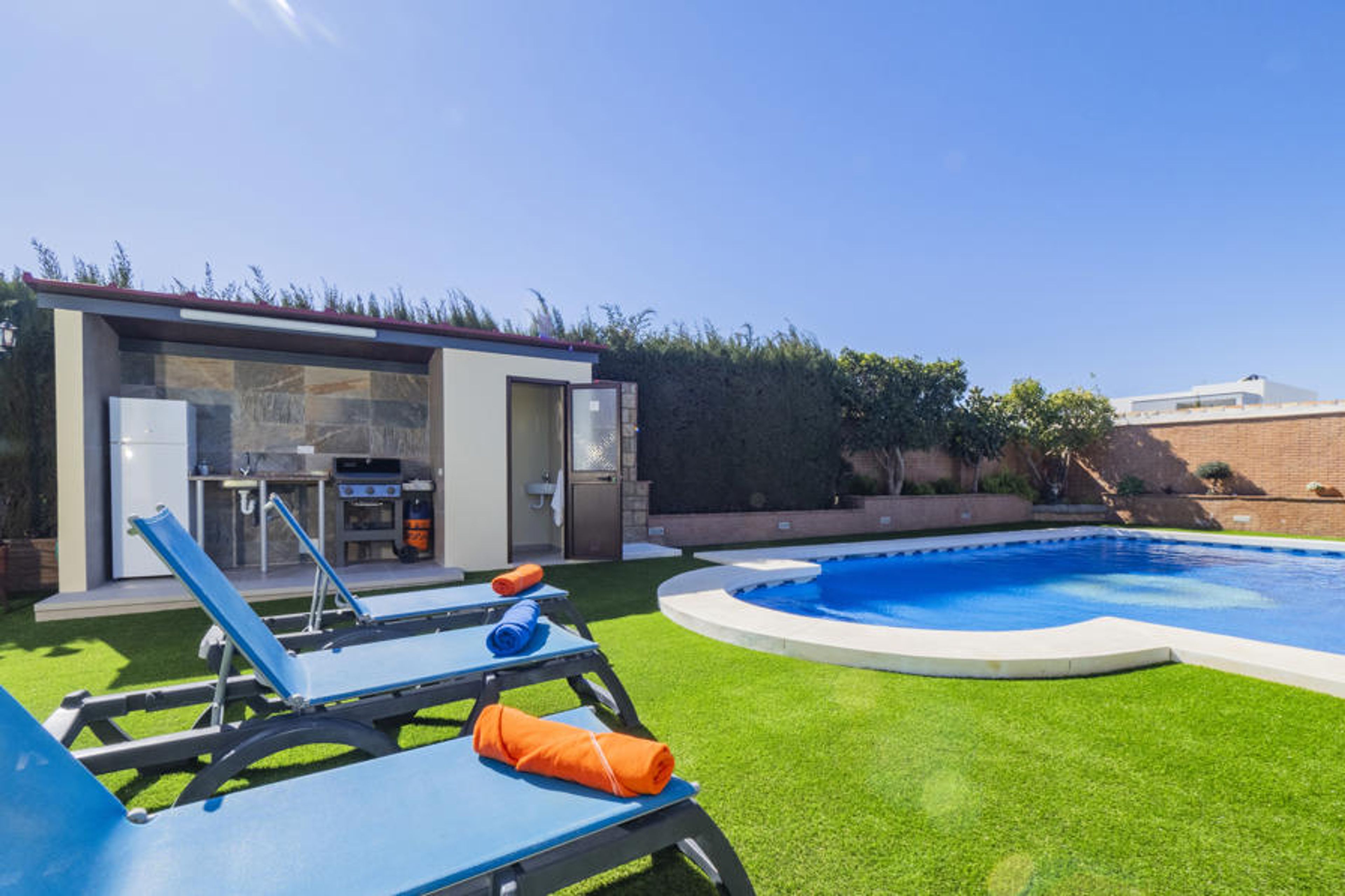 The interior is cosy and well-equipped: living room with fireplace and television, dining room, independent kitchen with modern appliances (fridge, microwave, oven, dishwasher, coffee maker, toaster, juicer), and laundry room. Additionally, the entire house has air conditioning, heating with heat pump, free wifi and satellite TV in various languages so that you can stay connected and entertained.