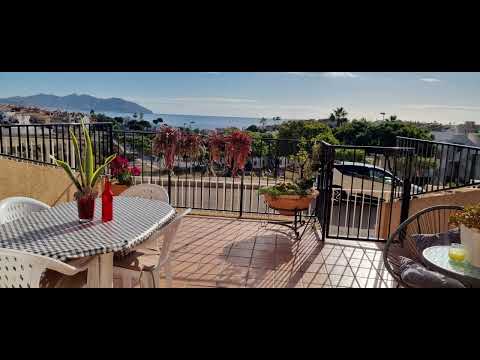 semidetached house in a private residential complex with access to large pool and garden. Own private entrance, front door accessible by wheelchair (but duplex is on 2 levels with the shower upstairs). Very large living room has two corner sofa beds, with large terrace/patio with sea view, pretty plants and terrace furniture. 3 bedrooms, two with double beds and one with bunk-beds, in total sleeps up to 6 guests. Good free WiFi, kitchen with all equipment including washing machine and dishwasher, coffee maker and much more. AC in the living room and master bedroom. The other two bedrooms are provided with ceiling/desk fans. The property is decorated in a modern, contemporary style and guests can expect a very comfortable stay with a touch of luxury thrown in. Excellent quality bedding and towels are provided without any extra charges, parking just outside so you can keep an eye on your car at all times, plenty of spaces, free on the street. You can access the front terrace from the street in ten seconds which makes it easy when carrying shopping or your suitcase s. A second terrace at the top of the property with uninterrupted views, seating and barbecue.