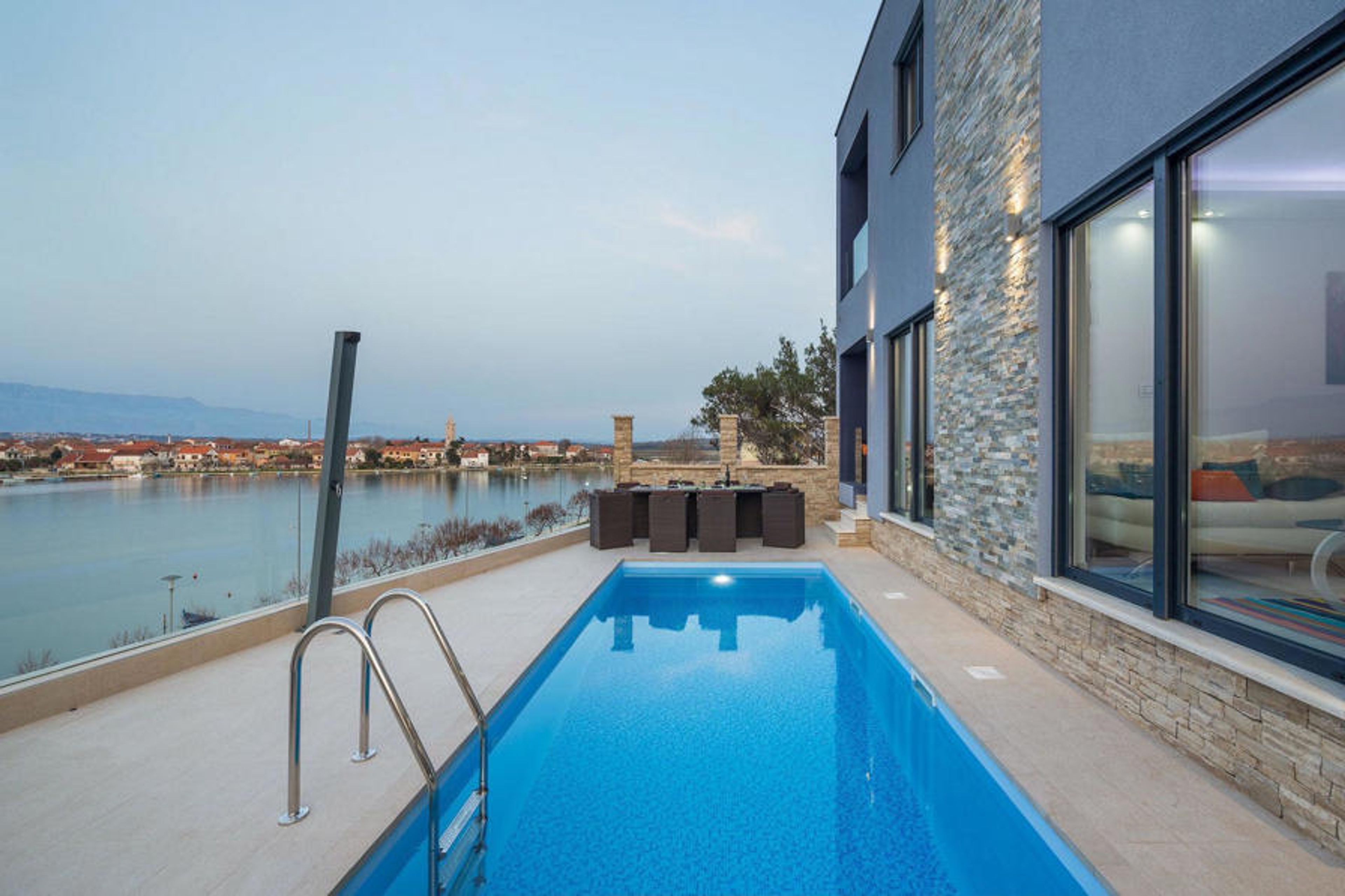 Elegant, attractive and beautifully appointed, Villa Margarita is a truly exceptional holiday villa in an enviable location on the alluring Adriatic coast. With the crystal clear sea right on the doorstep, spectacular views across the bay to the historic landmarks of Nin and the dramatic mountains of Velebit in the background, and thoughtfully arranged, stylish accommodation split into two independent wings, this is the perfect choice for large families or groups of friends with varying privacy needs. The villa is designed in an exquisite, contemporary style and offers an open-plan living area with patio doors leading out to the inviting pool and large sun terrace. Here you can relax and dine while admiring the marvellous views and soaking up the true Mediterranean atmosphere. The four air-conditioned bedrooms are located on the upper floor, as are two spacious balconies from which you have a wonderful view of the old town, meaning you can see the main sights without having to leave the comfort of this fantastic holiday home.