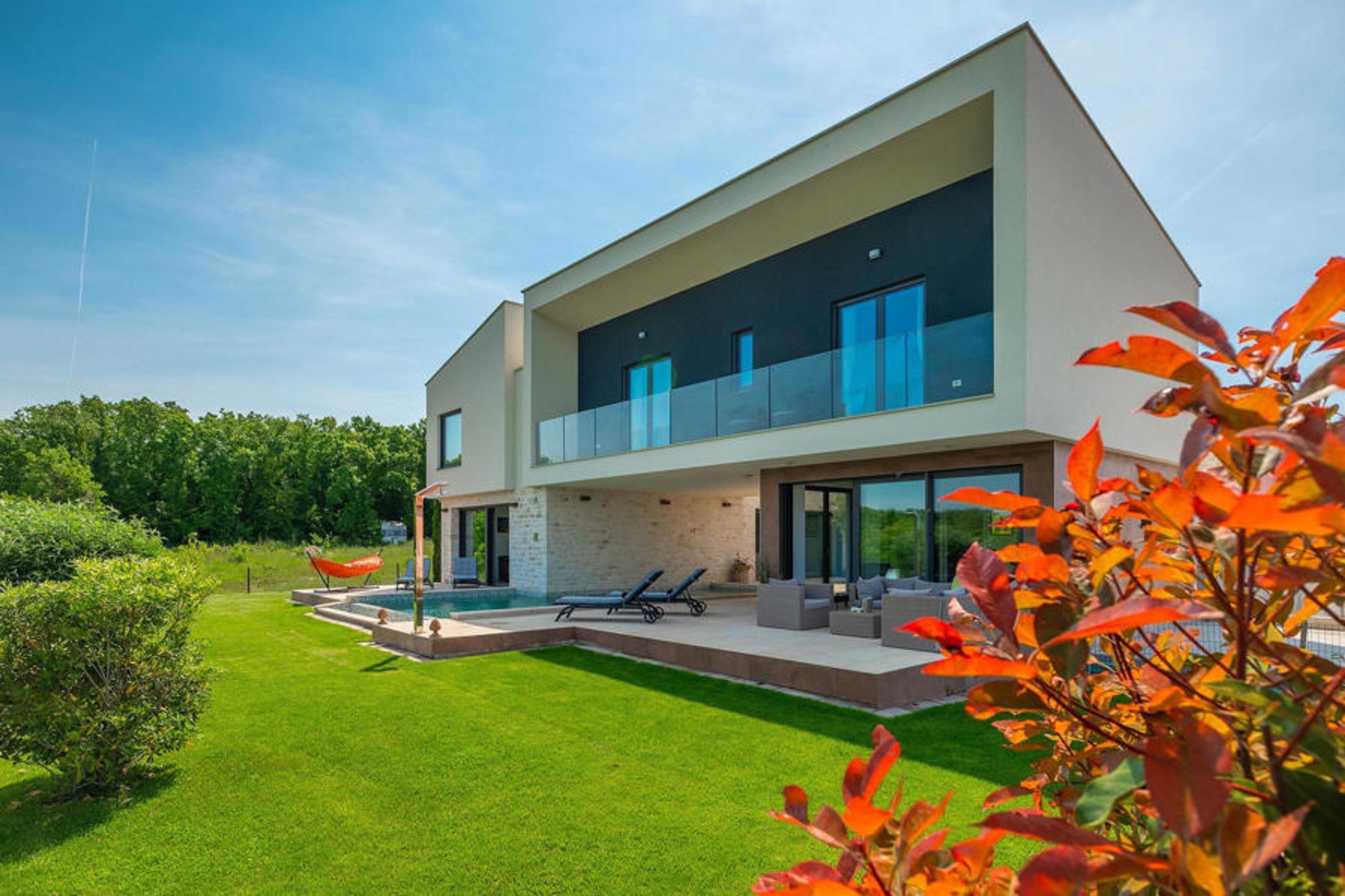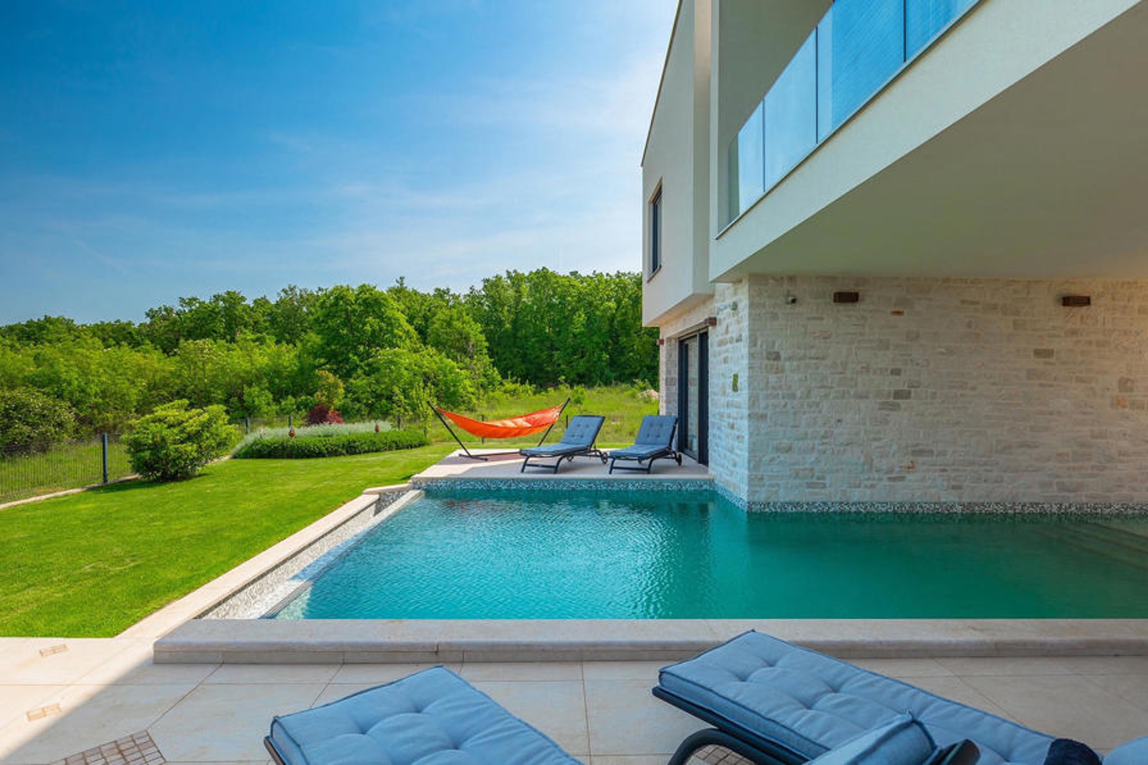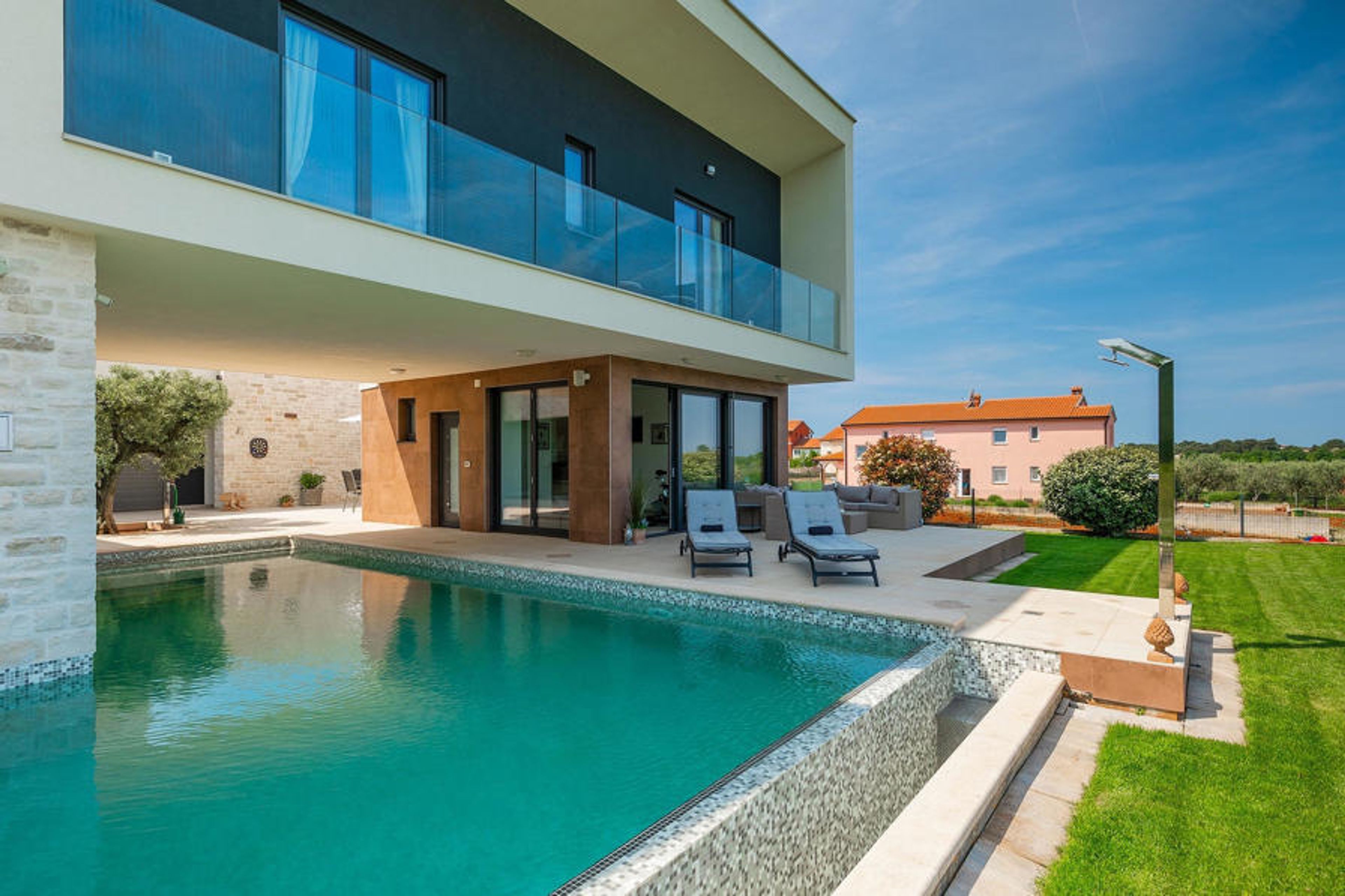 On the outskirts of Novigrad on the west coast of Istria lies the luxurious Villa Felice Novigrad, surrounded by green countryside. This is the villa where you can enjoy your well-deserved vacation with family and friends to the fullest. In addition to the modern design of the villa, the absolute eye-catcher is certainly the 50m2 private pool. Refresh yourself here on hot summer days and unwind while you let your gaze wander over the green surroundings. Relax on one of the sun loungers and soak up the Istrian sun.
